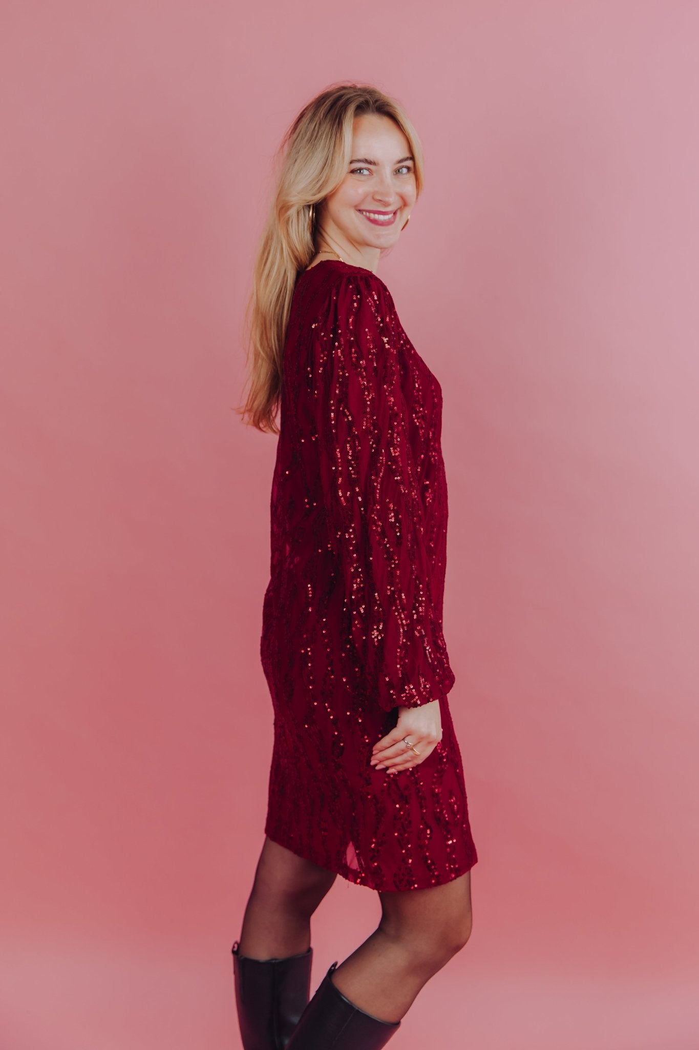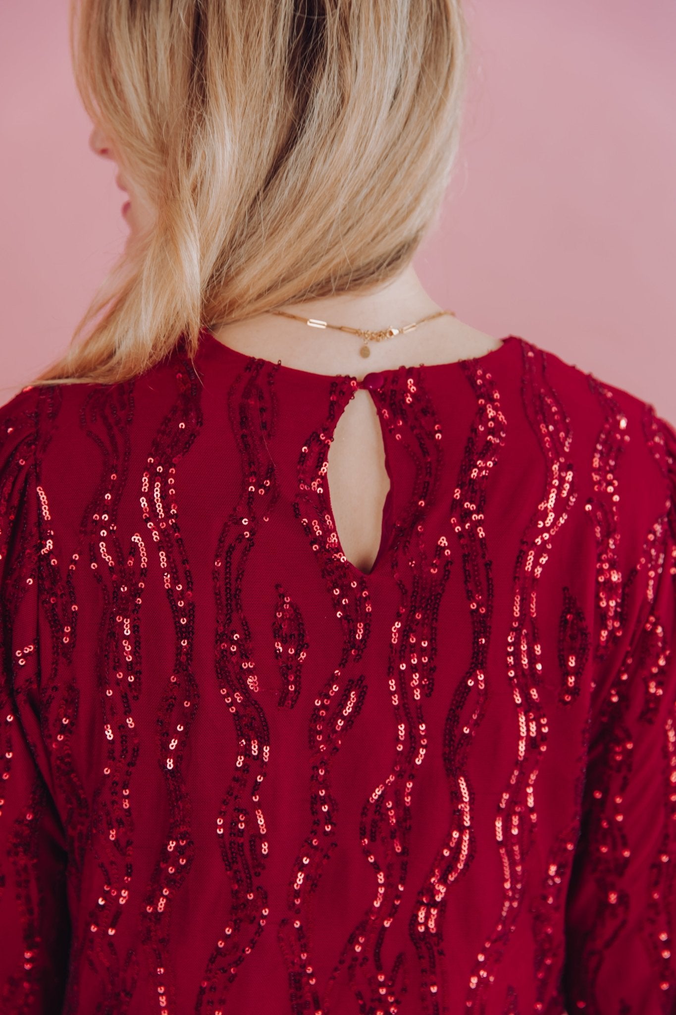 De Jemma Dress in bordeaux is een feestelijke jurk gemaakt van een luchtige stof. De jurk heeft lange pofmouwen en een ronde halslijn en is gemakkelijk te sluiten door middel van de knoopsluiting in de nek. Doordat dit jurkje voorzien is van pailletten, is hij perfect voor de feestdagen!