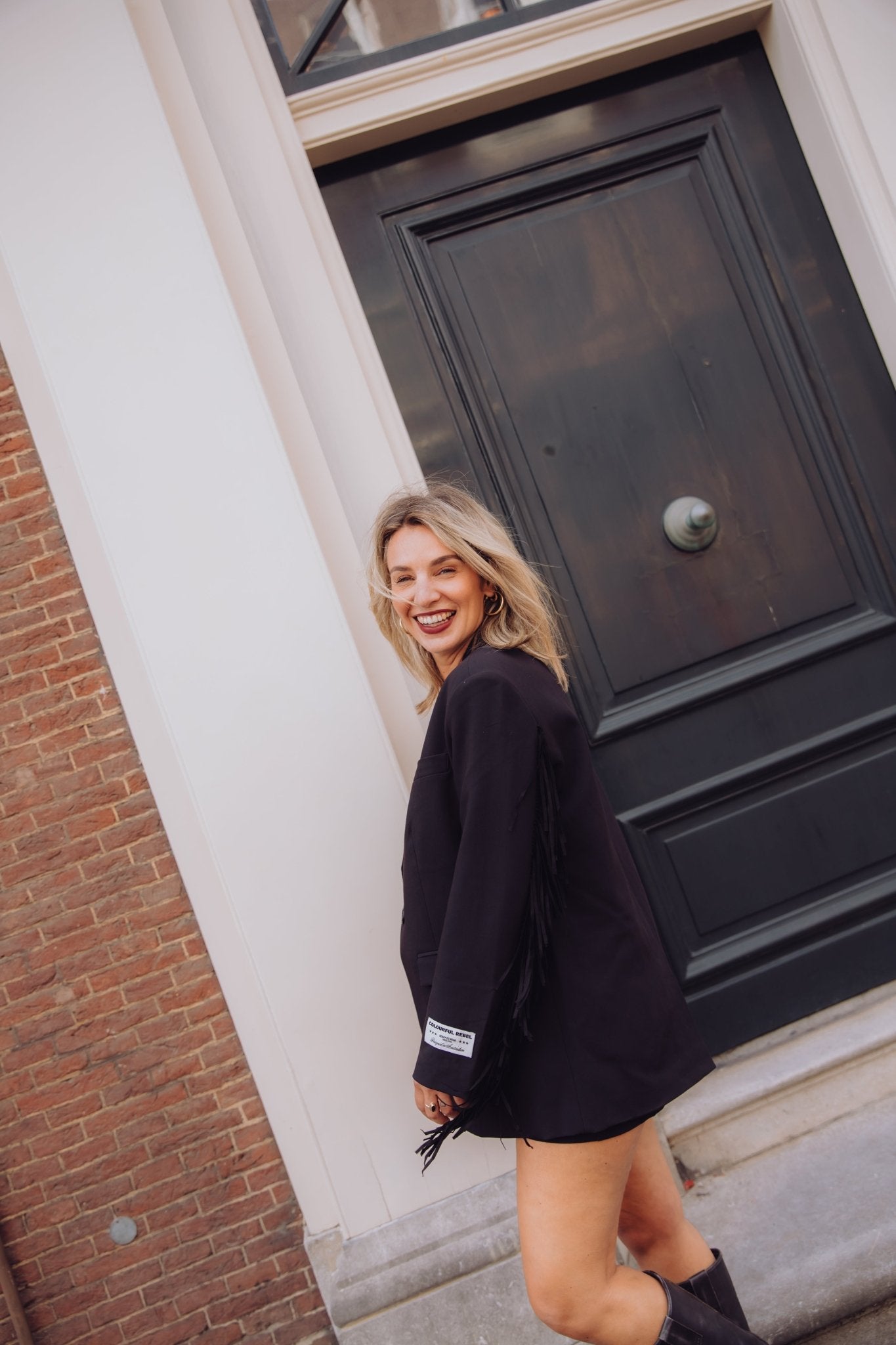 De Jesra Fringe Blazer in zwart heeft een regular fit en is afgewerkt met klepzakken en een knoopsluiting. Een opvallend detail zijn de franjes langs de zijkanten en mouwen, wat de blazer een speelse en unieke uitstraling geeft. Combineer deze blazer met je favoriete pantalon voor een classy look.