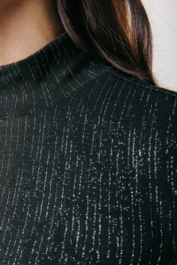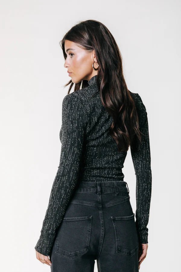 De Jewel Lurex Turtleneck Top in zwart is gemaakt van een gebreide lurexstof met een glittertje. De top heeft een aangesloten pasvorm met stretch, waardoor hij mooi aansluit op het lichaam. De glanzende lurexdraad zorgt voor een subtiel glittereffect, perfect voor een stijlvolle en feestelijke look. De hoge hals en lange mouwen maken de top ideaal om te combineren met een high waist broek of rok.