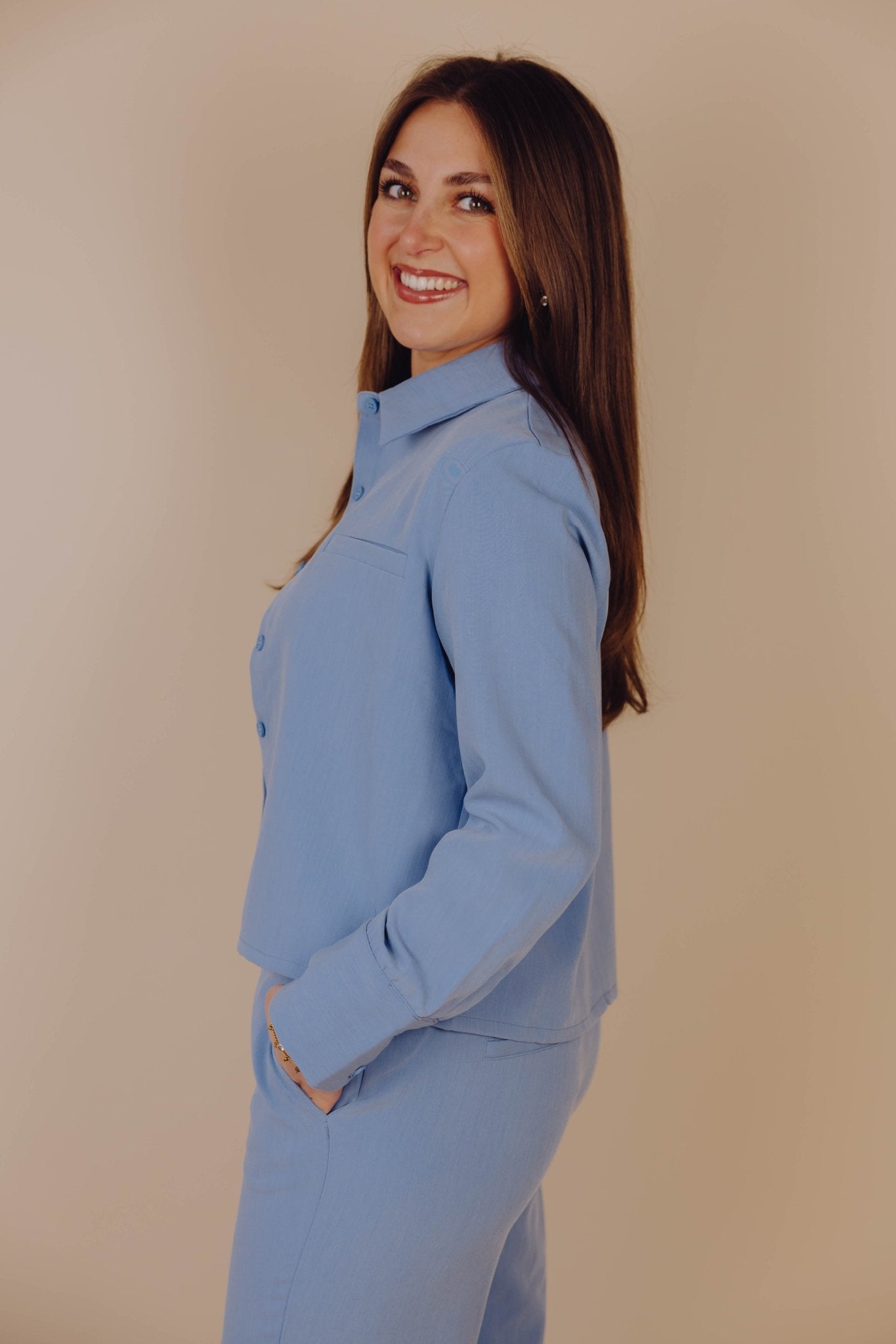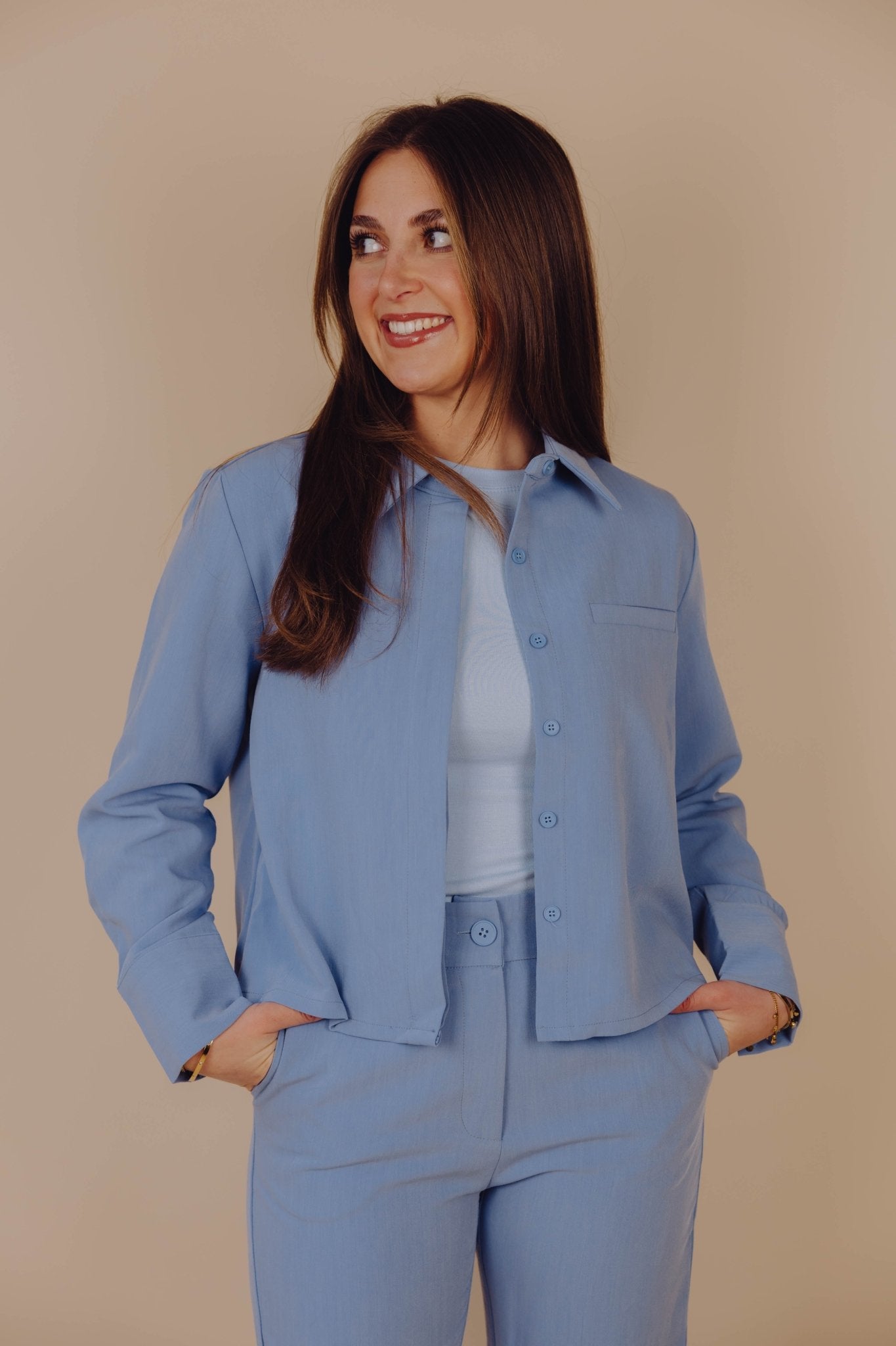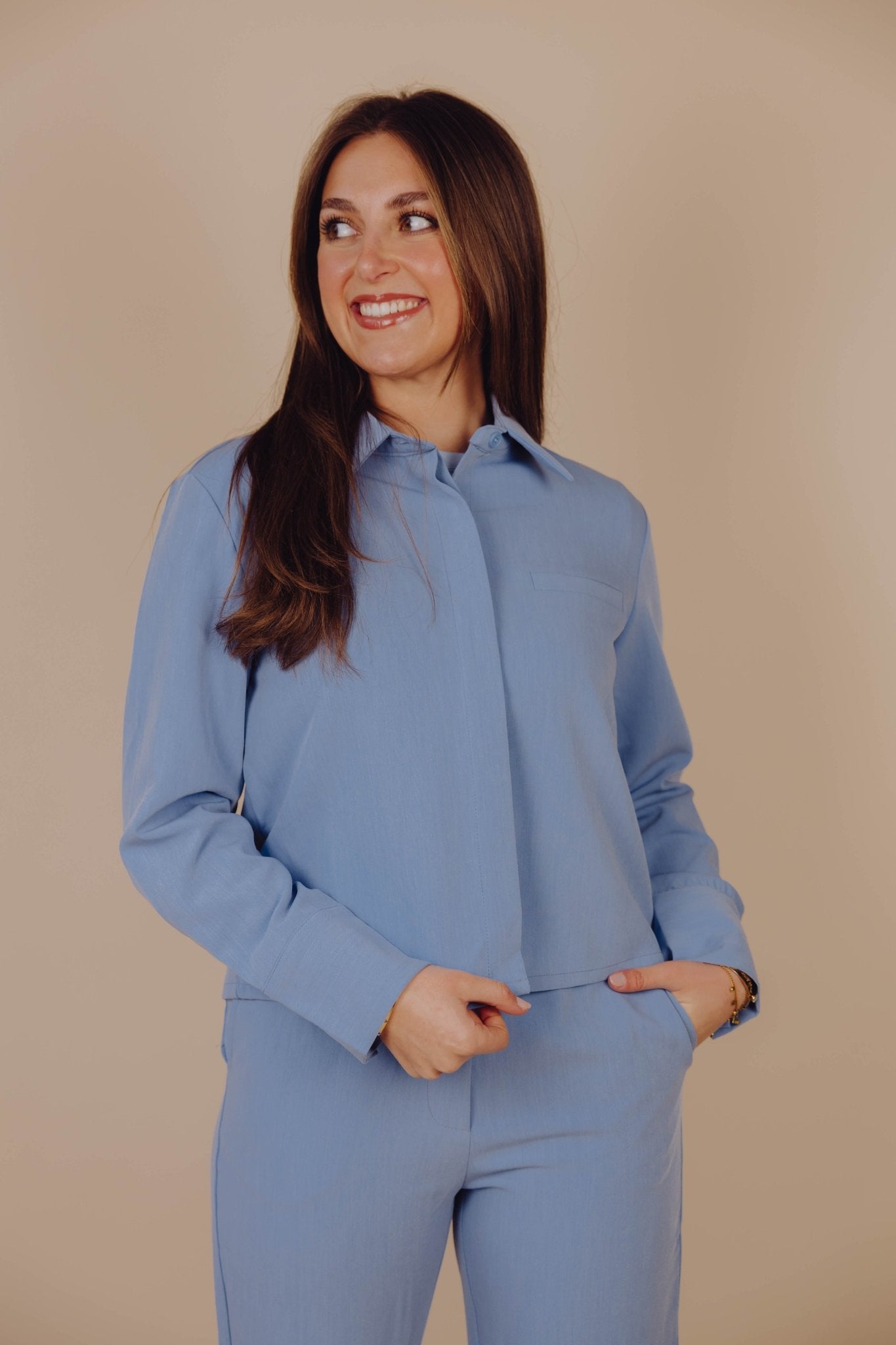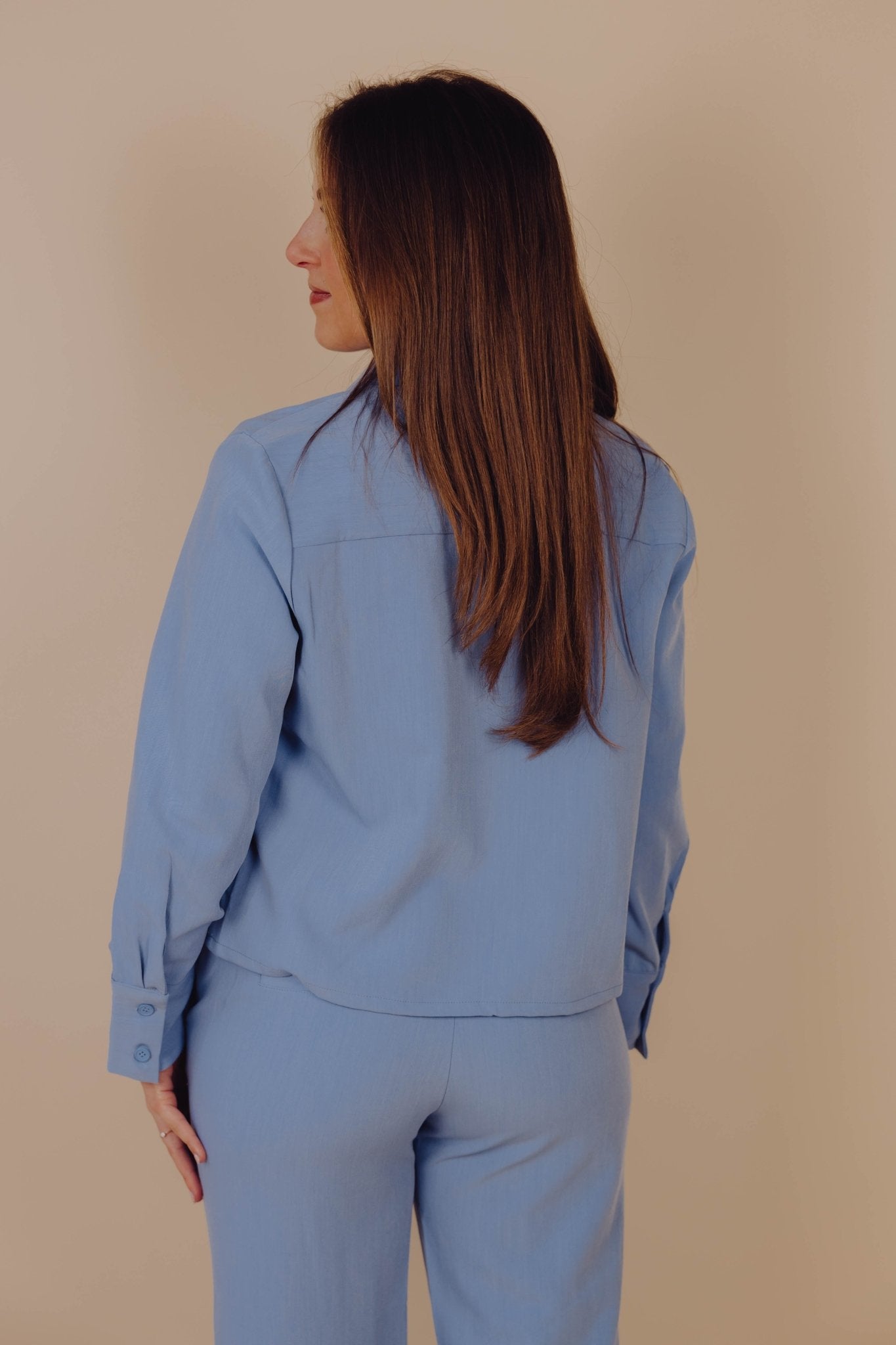De Joy Blouse in blauw is een kort blousje met een kraagje, een sier borstzakje en een knoopsluiting aan de voorkant. Combineer deze blouse met de Joy Pants voor een complete set.