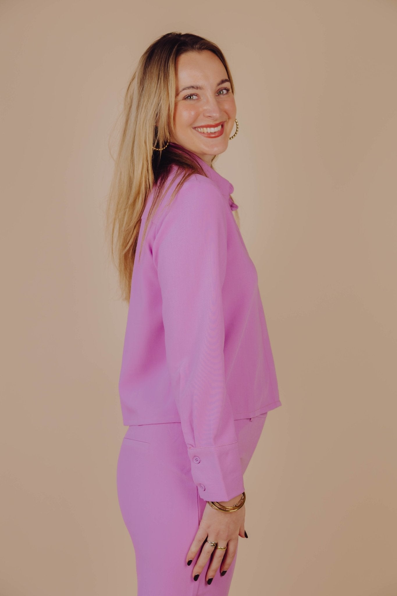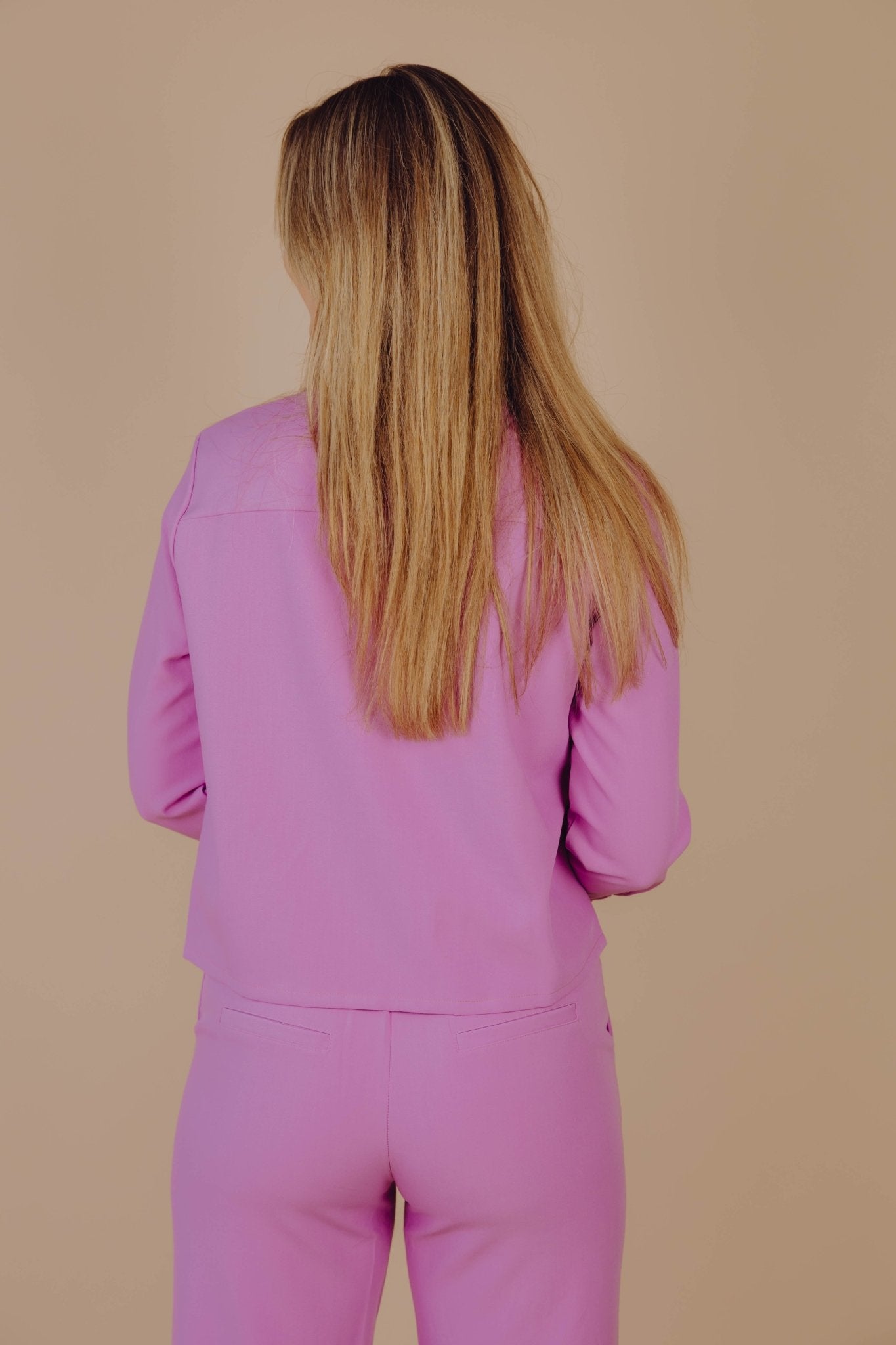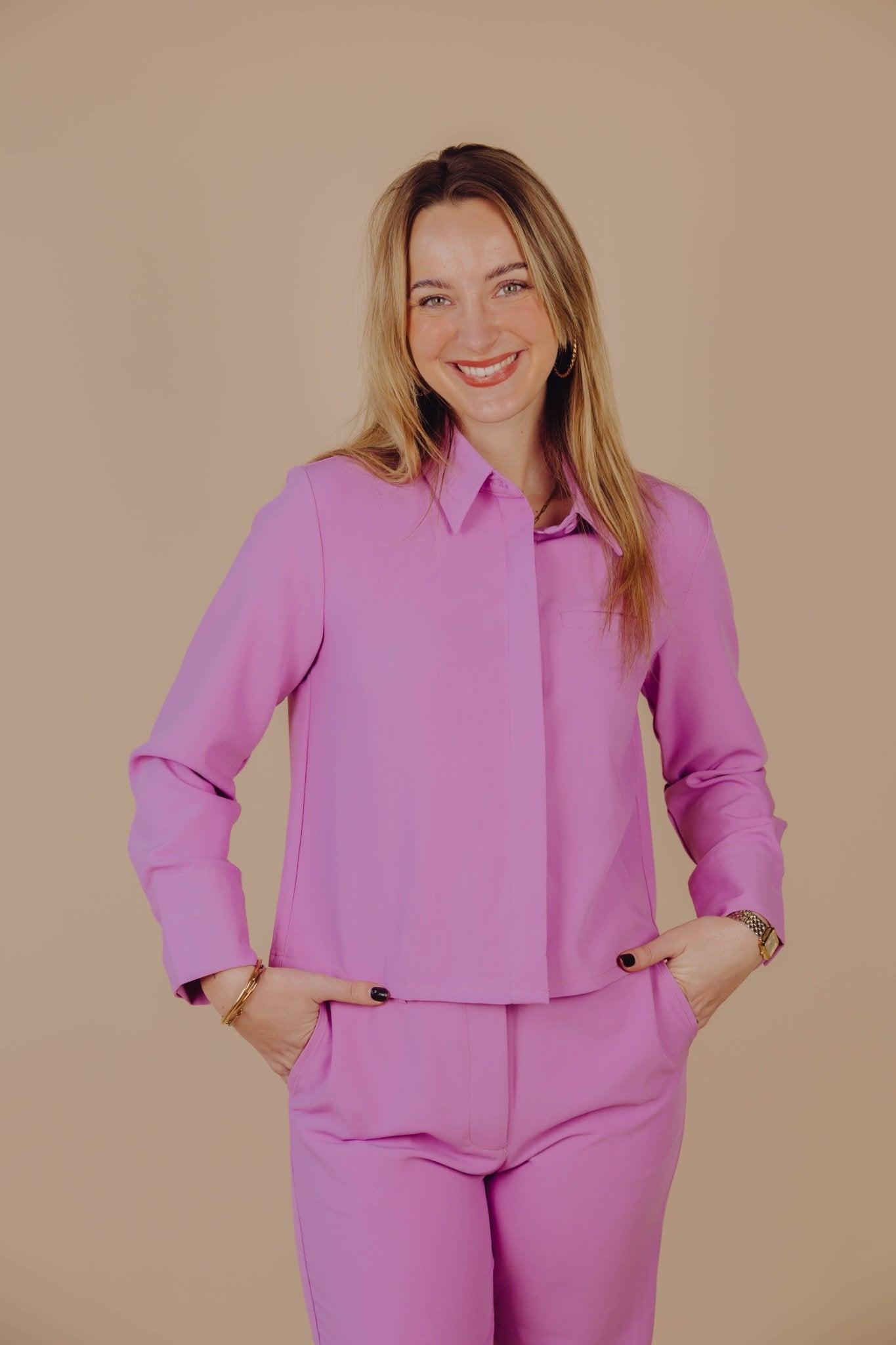De Joy Blouse in roze is een kort blousje met een kraagje, een sier borstzakje en een knoopsluiting aan de voorkant. Combineer deze blouse met de Joy Pants voor een complete set.