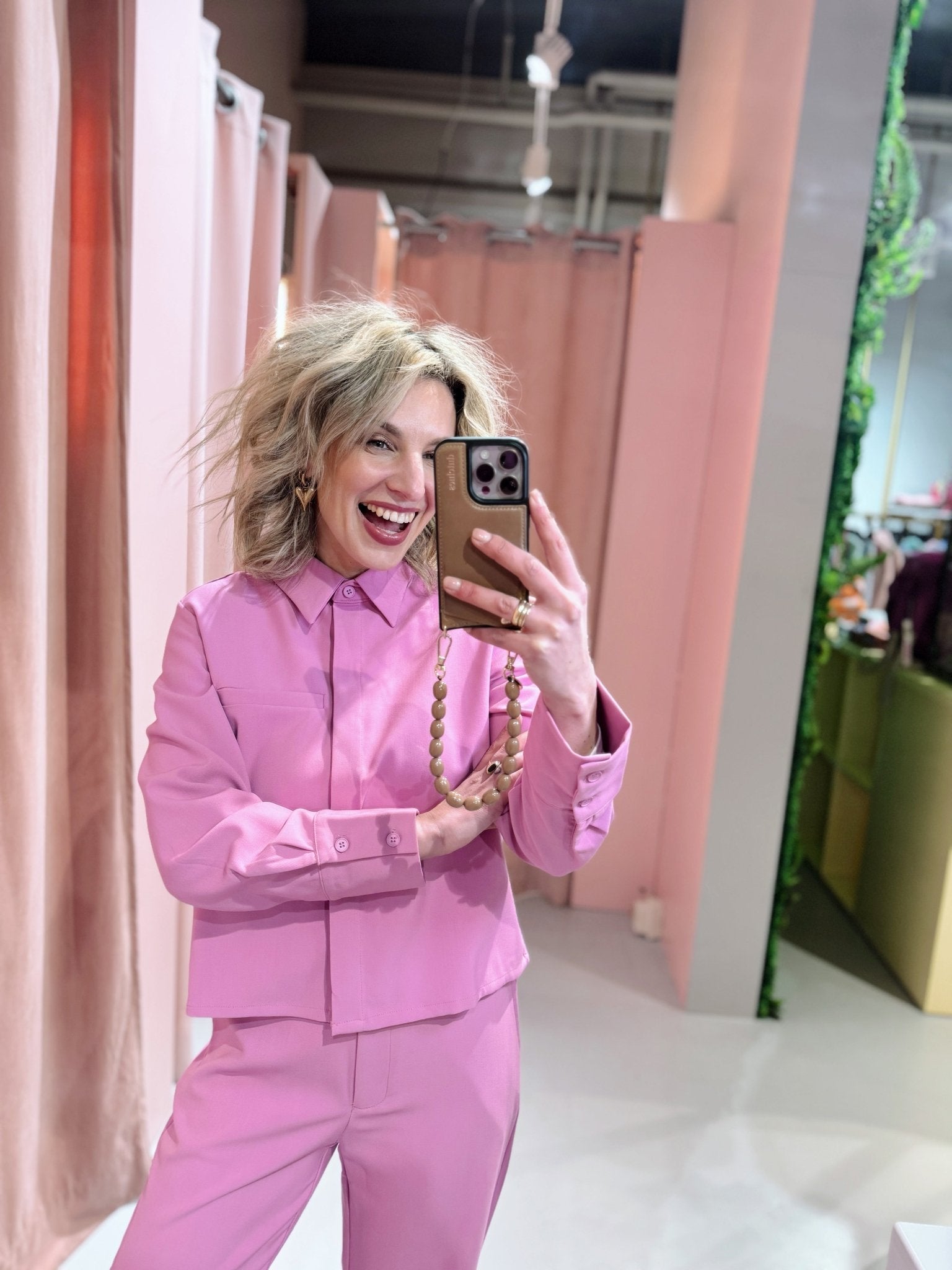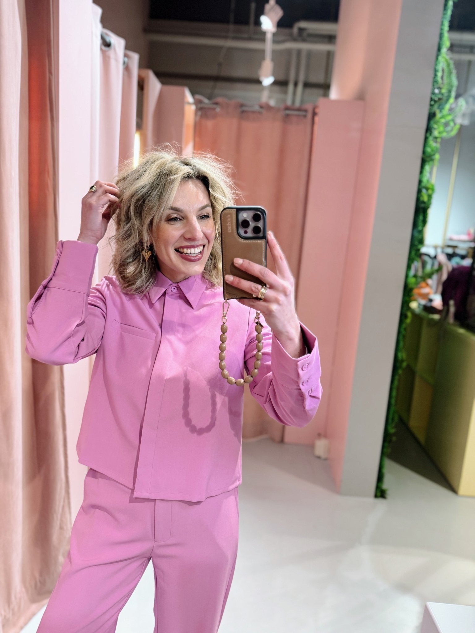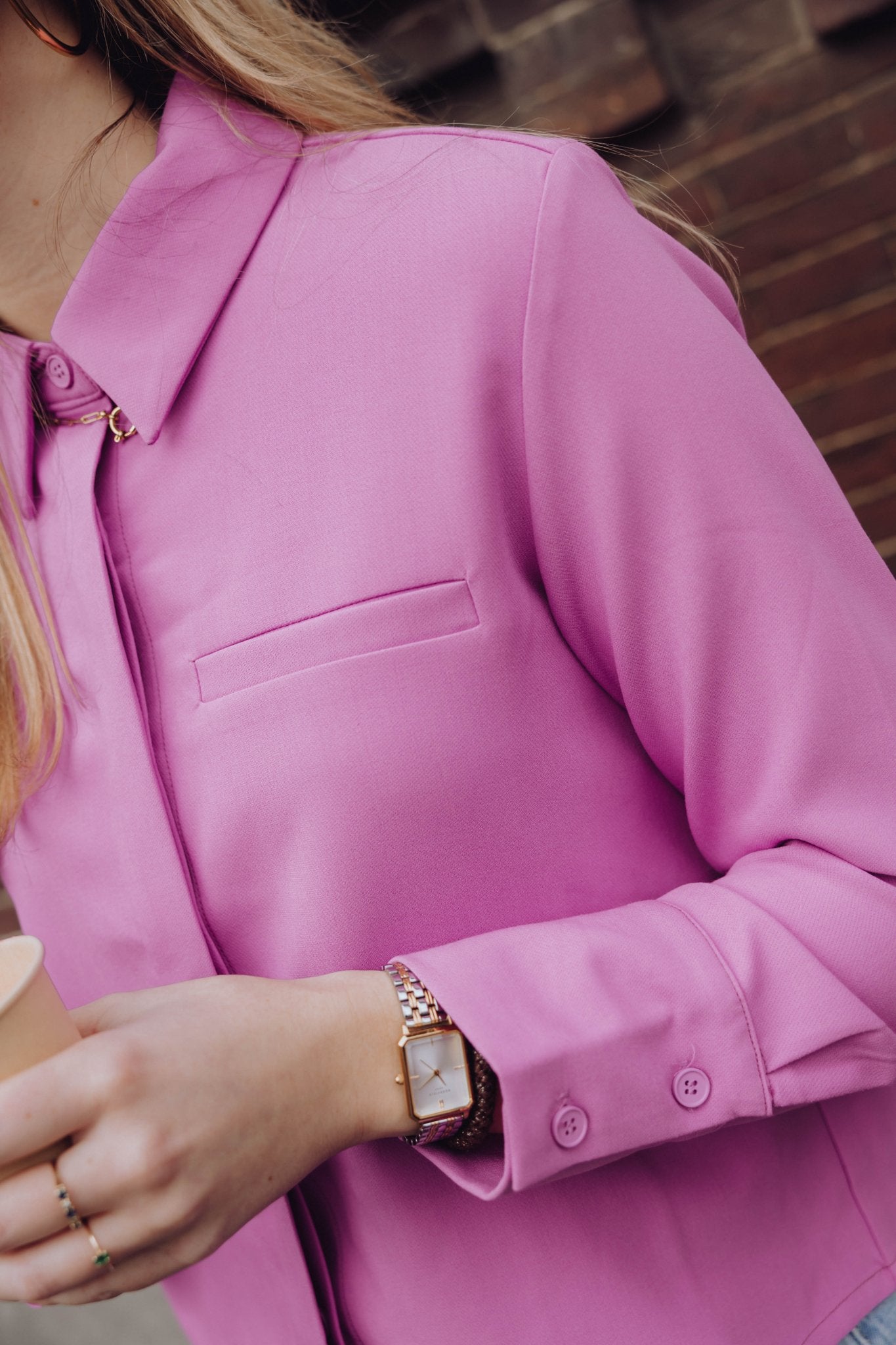 De Joy Blouse in roze is een kort blousje met een kraagje, een sier borstzakje en een knoopsluiting aan de voorkant. Combineer deze blouse met de Joy Pants voor een complete set.