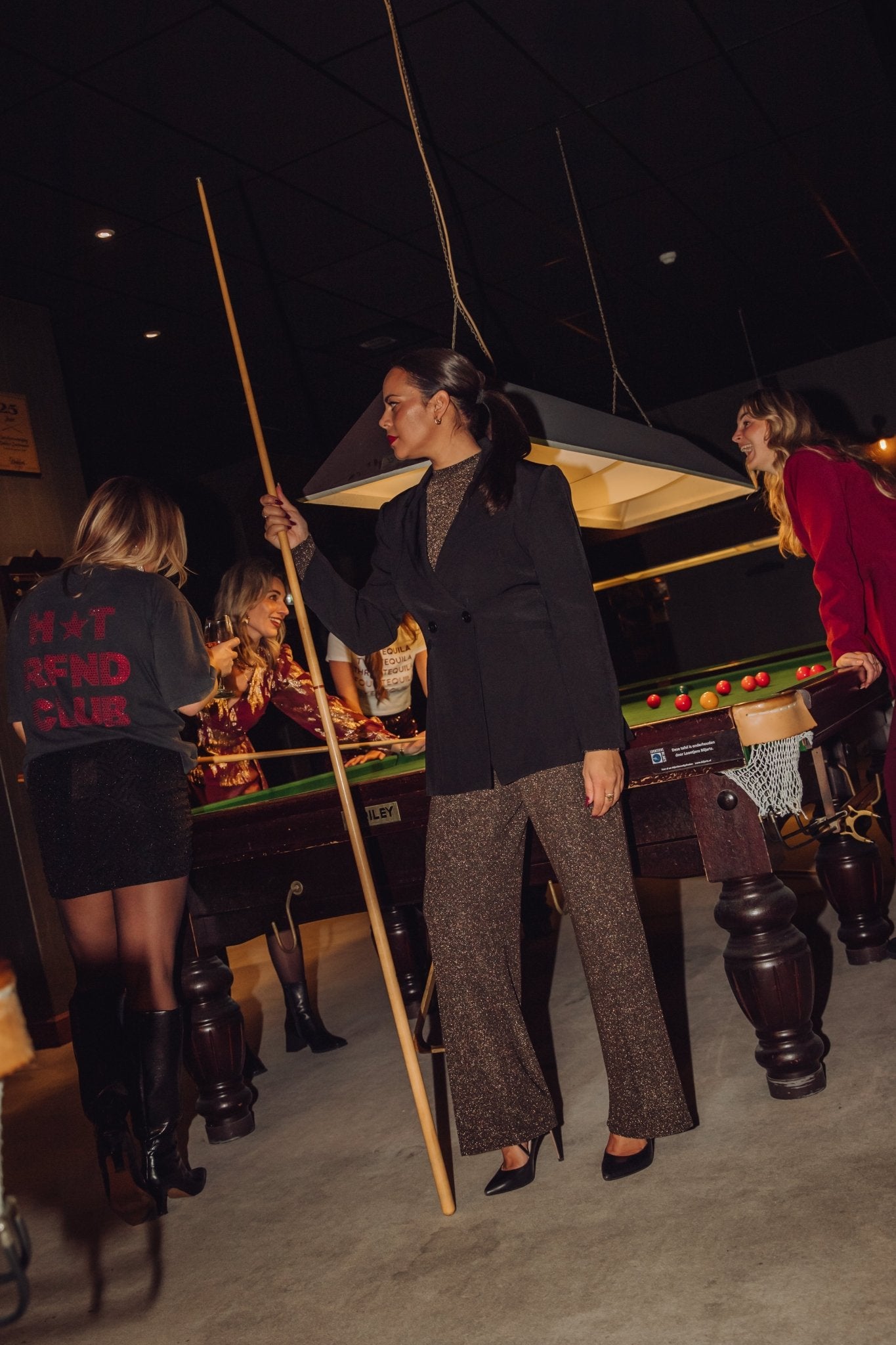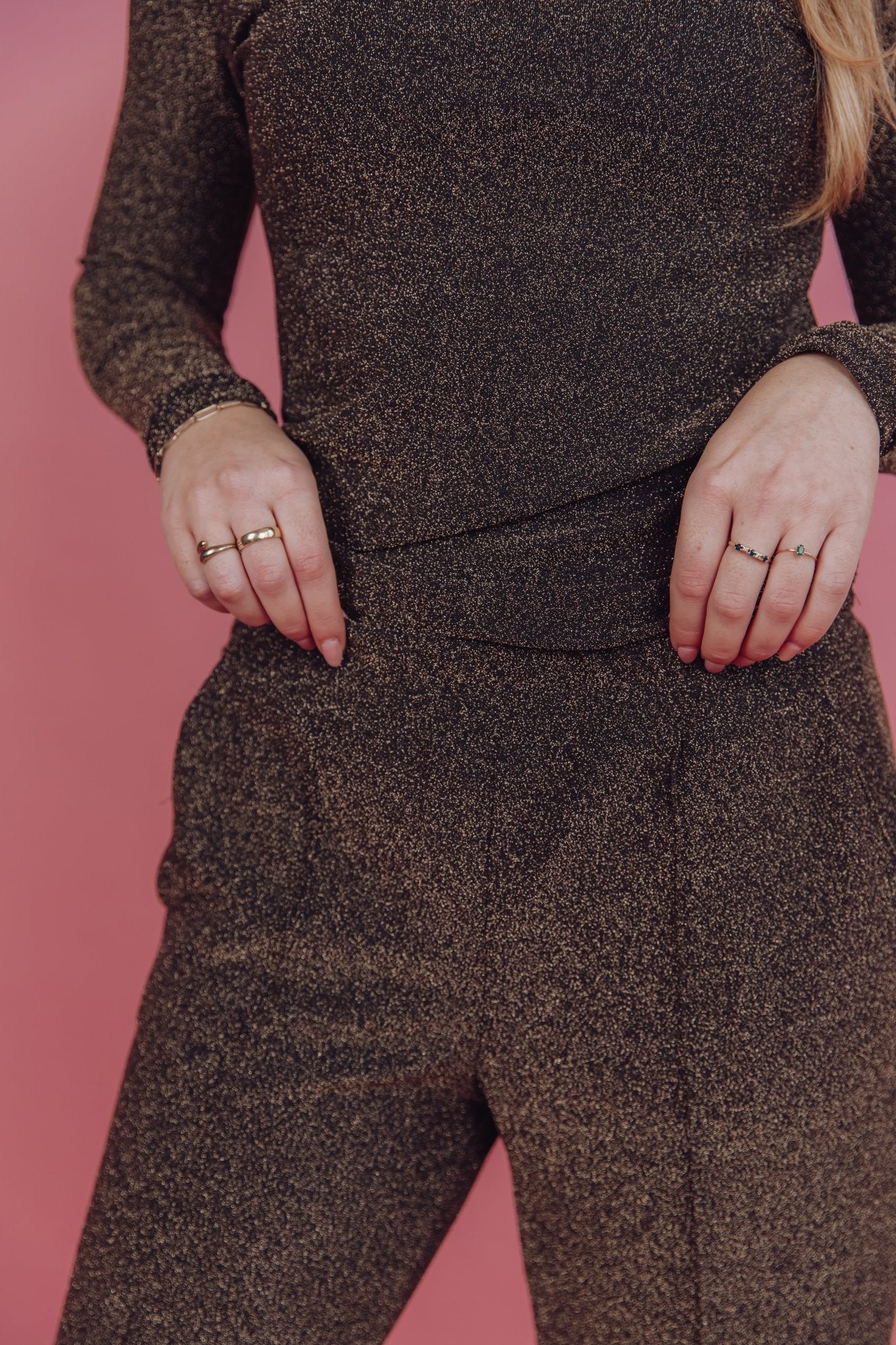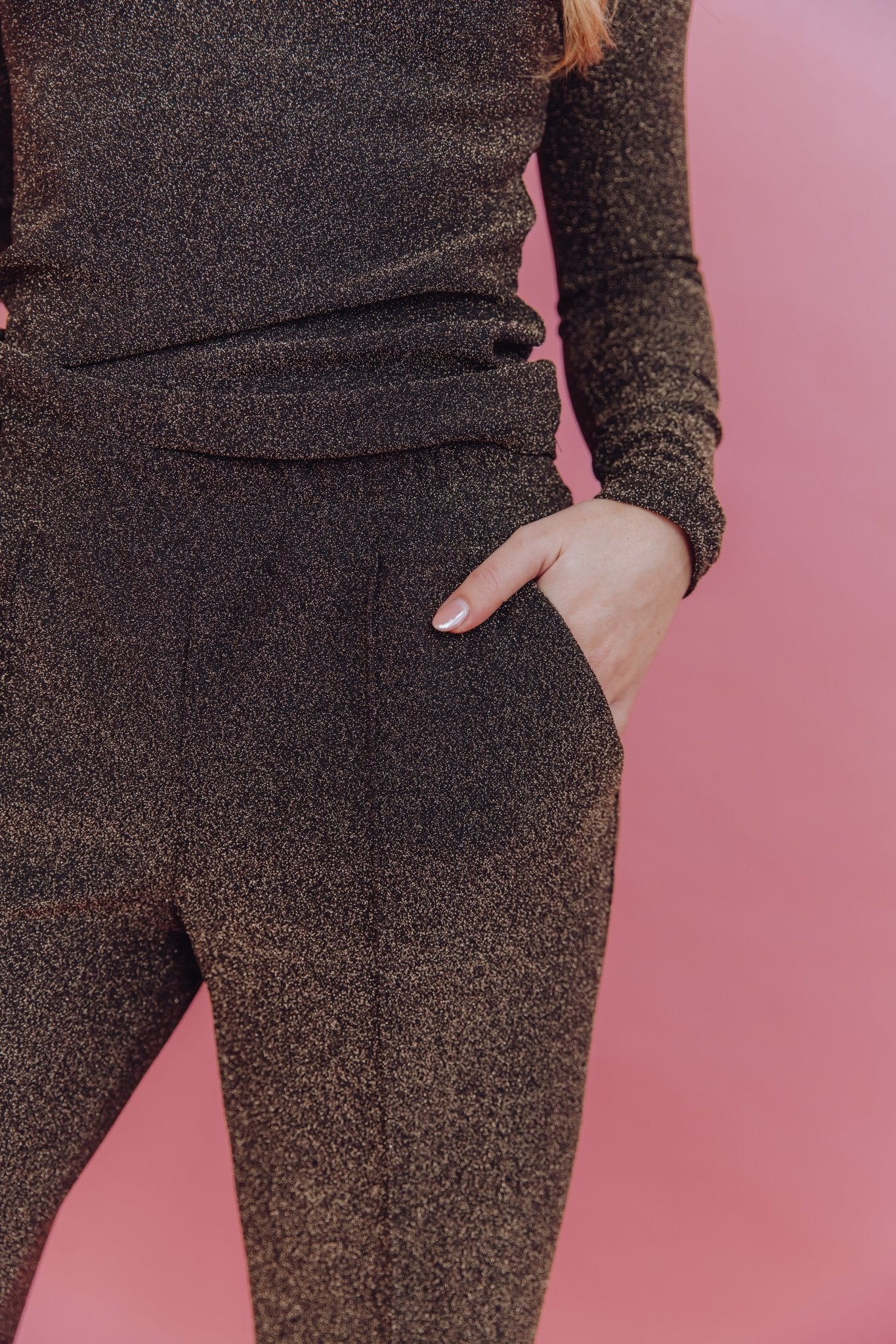 De Joyce Pants in goud is een comfortabele wide leg glitter jogger met een elastische tailleband en twee steekzakken. De voorkant van de broek is voorzien van een biesje, wat hem een classy touch geeft.