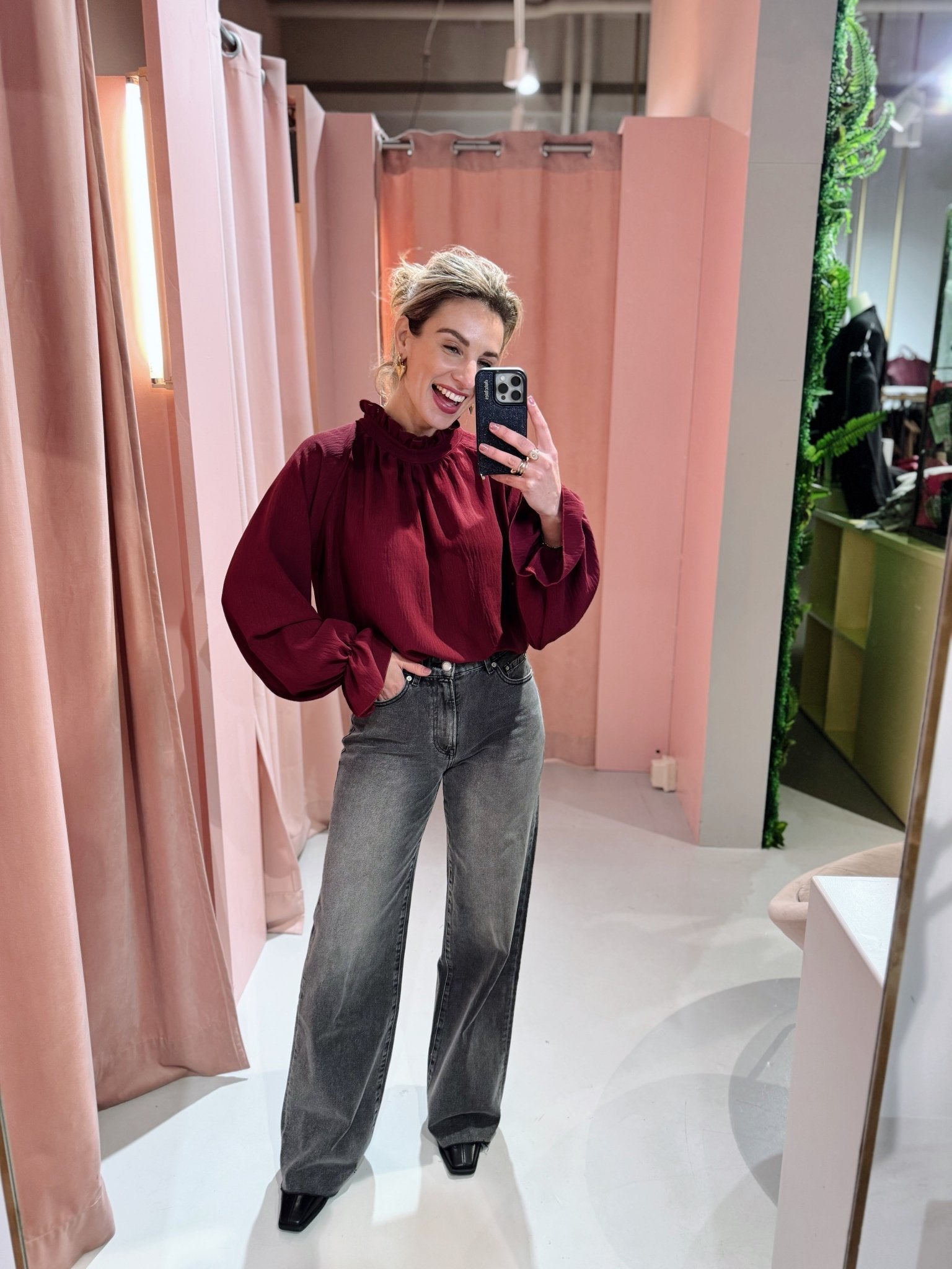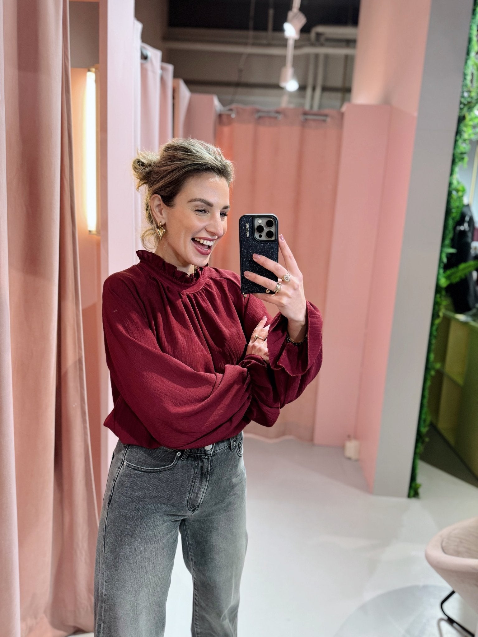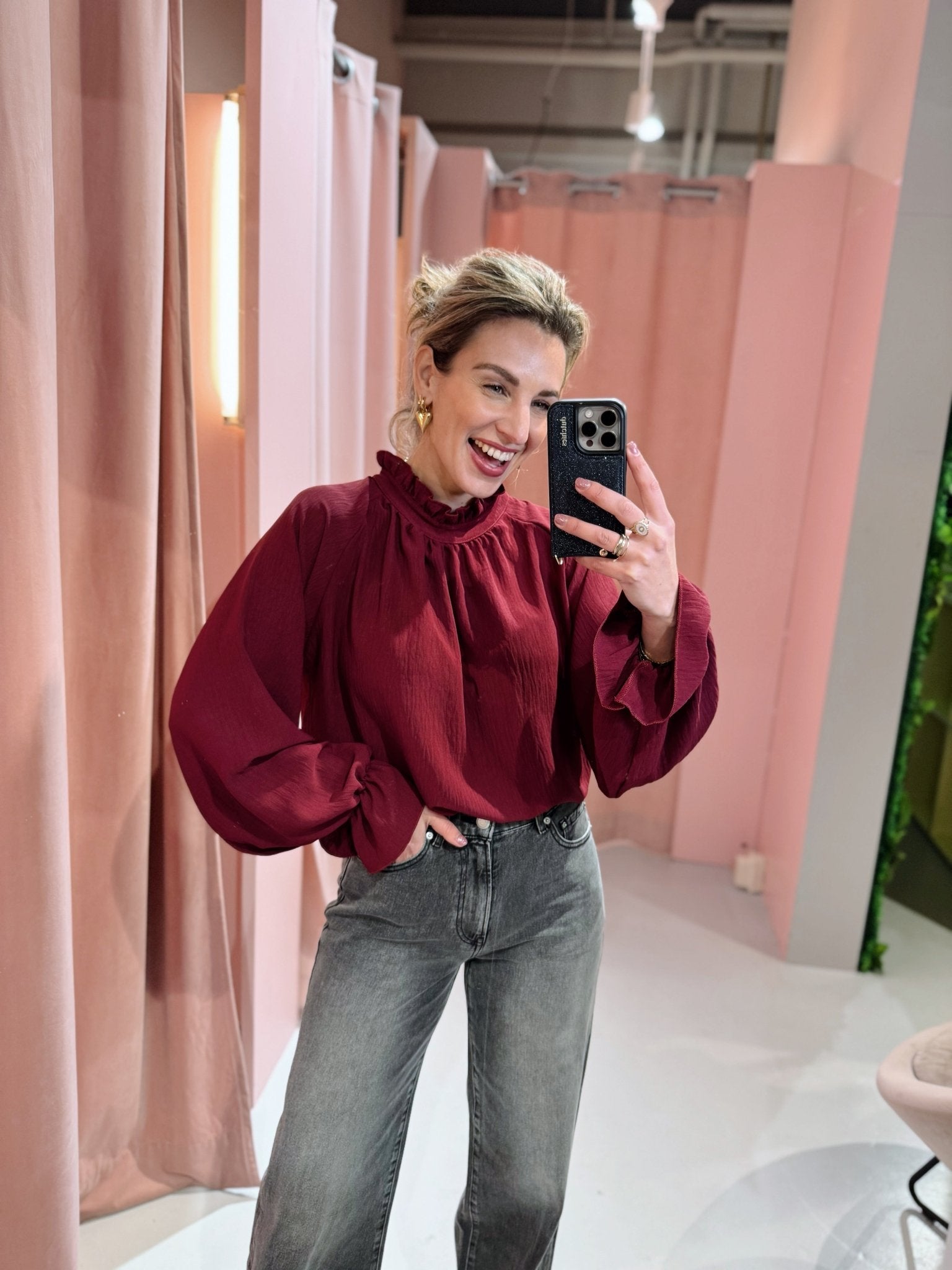 De Julie Blouse in bordeaux is gemaakt van een luchtige stof en is voorzien van lange pofmouwen en een ruched kraagje. De blouse heeft een boxy fit en is gemakkelijk sluiten door middel van de knoopsluiting aan de achterkant.
