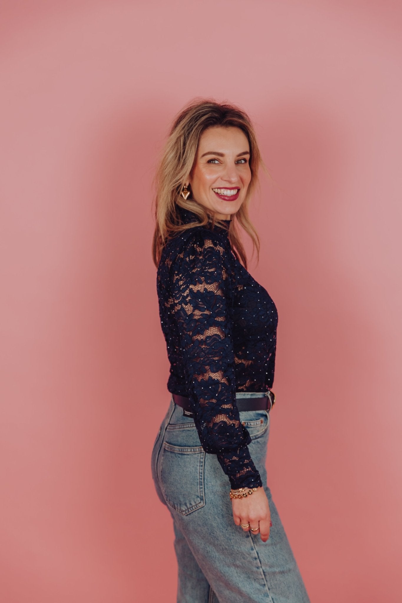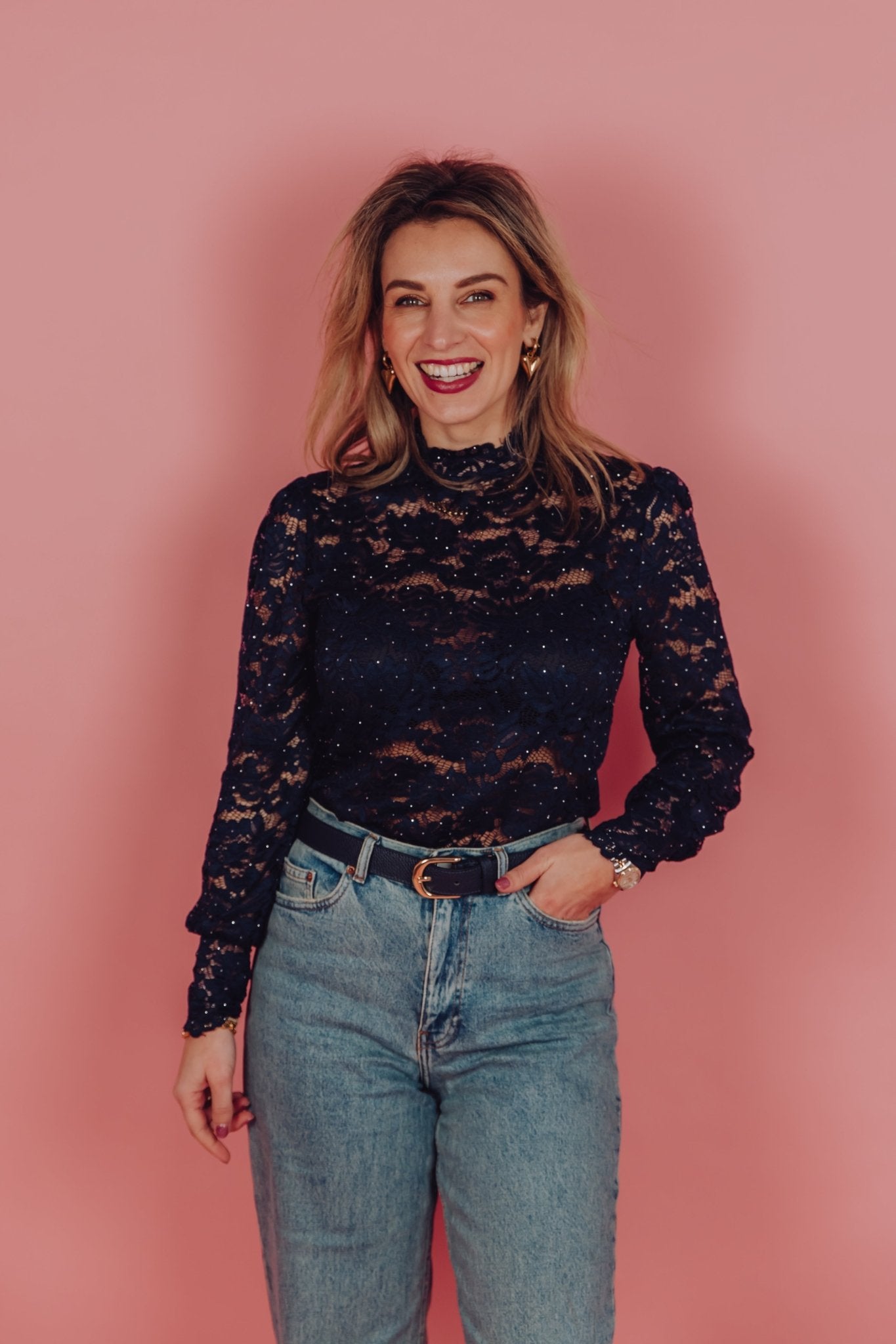 De Kacey Top in navy is een kanten top gemaakt van een kanten stof en heeft een ingewerkt bloemen patroon met strass steentjes. De top heeft lange mouwen en een hoge halslijn met een kleine col. De top is achter in de nek te sluiten met een klein knoopje. Deze top is een echte musthave voor de feestdagen.