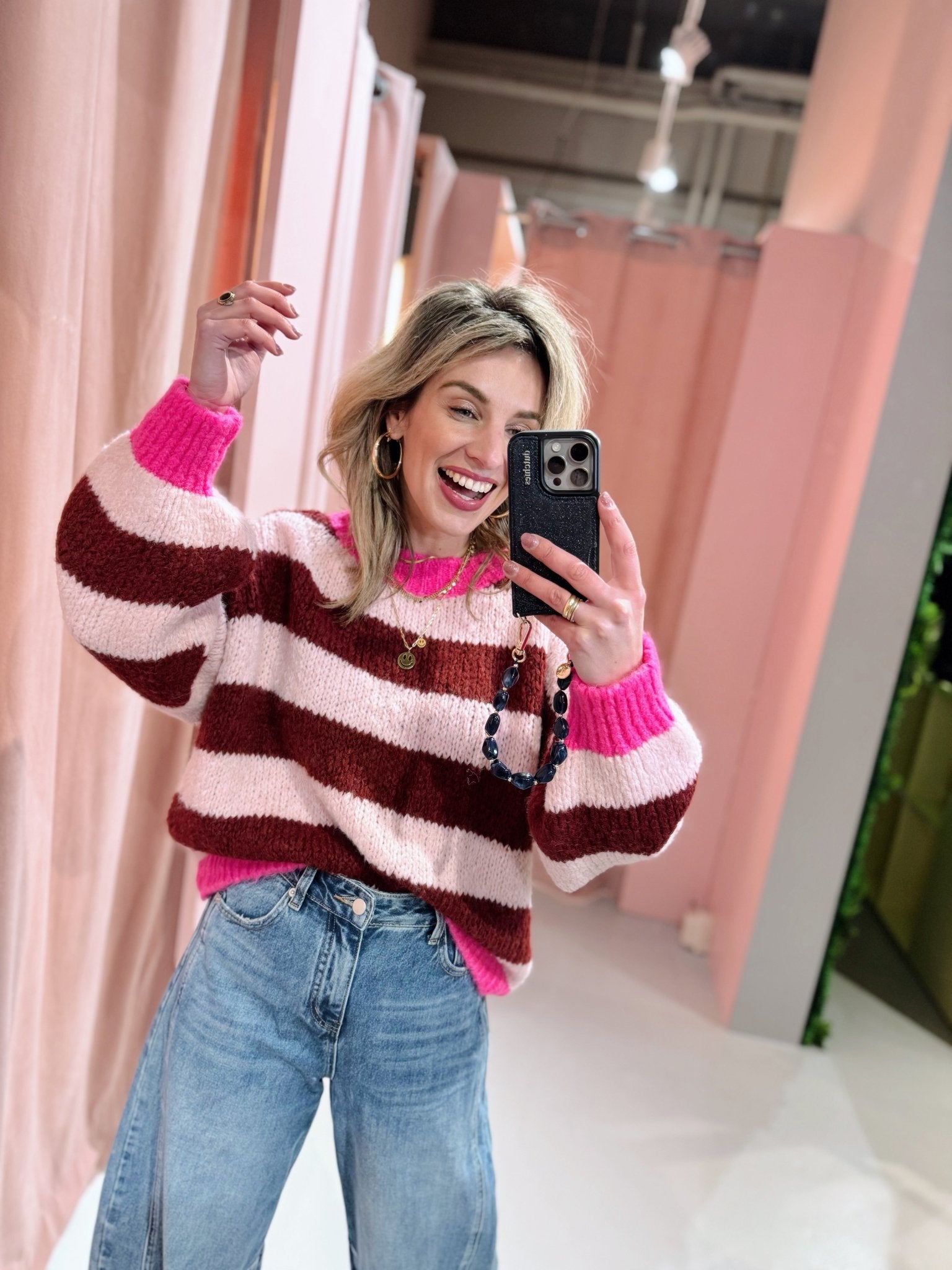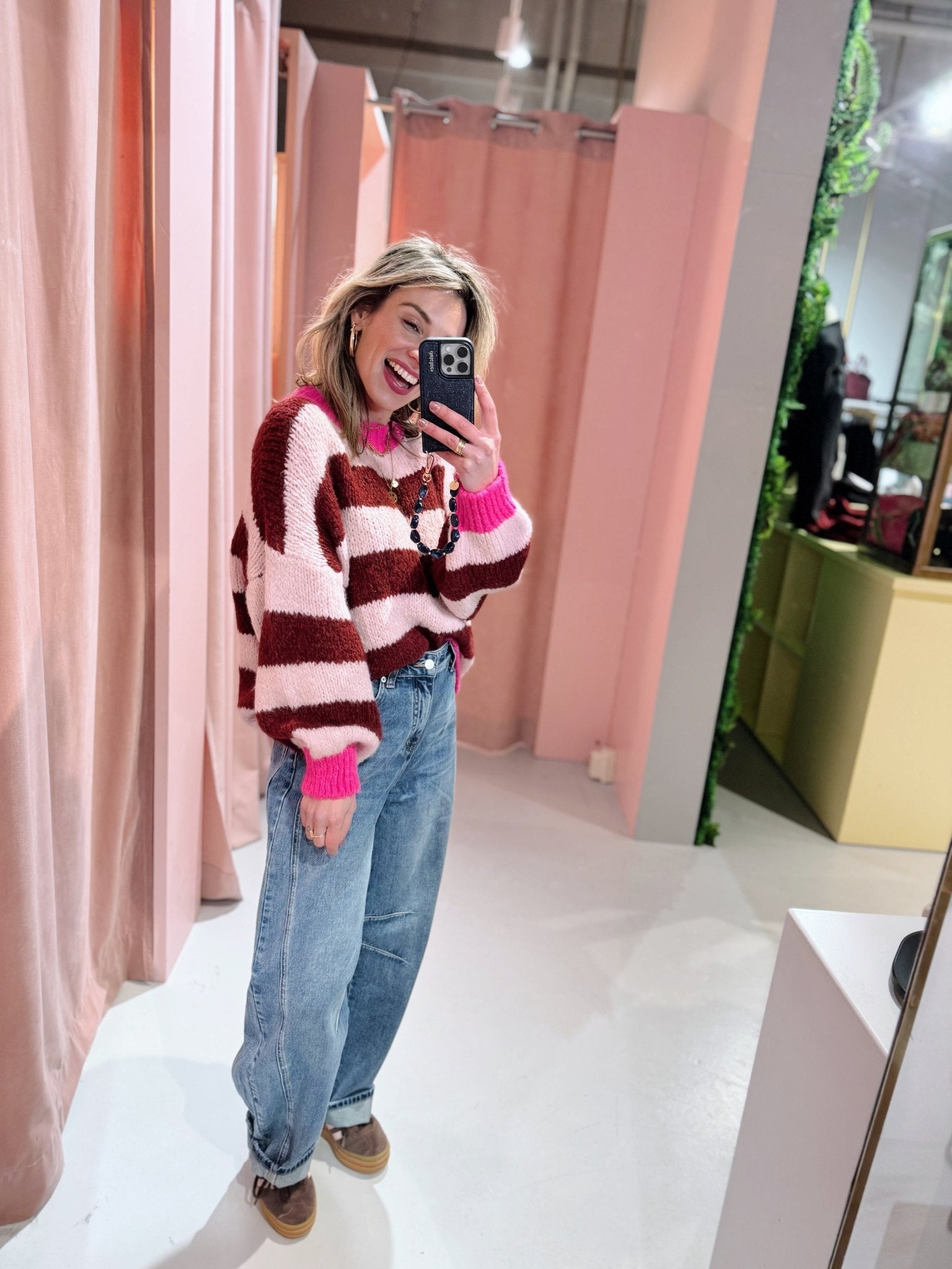 De Kai Knit is een harige, oversized trui met een boxy fit voor een moderne en comfortabele look. De speelse kleurencombinatie van roze, bordeaux en fuchsia sluit perfect aan bij de trendkleuren van dit seizoen.