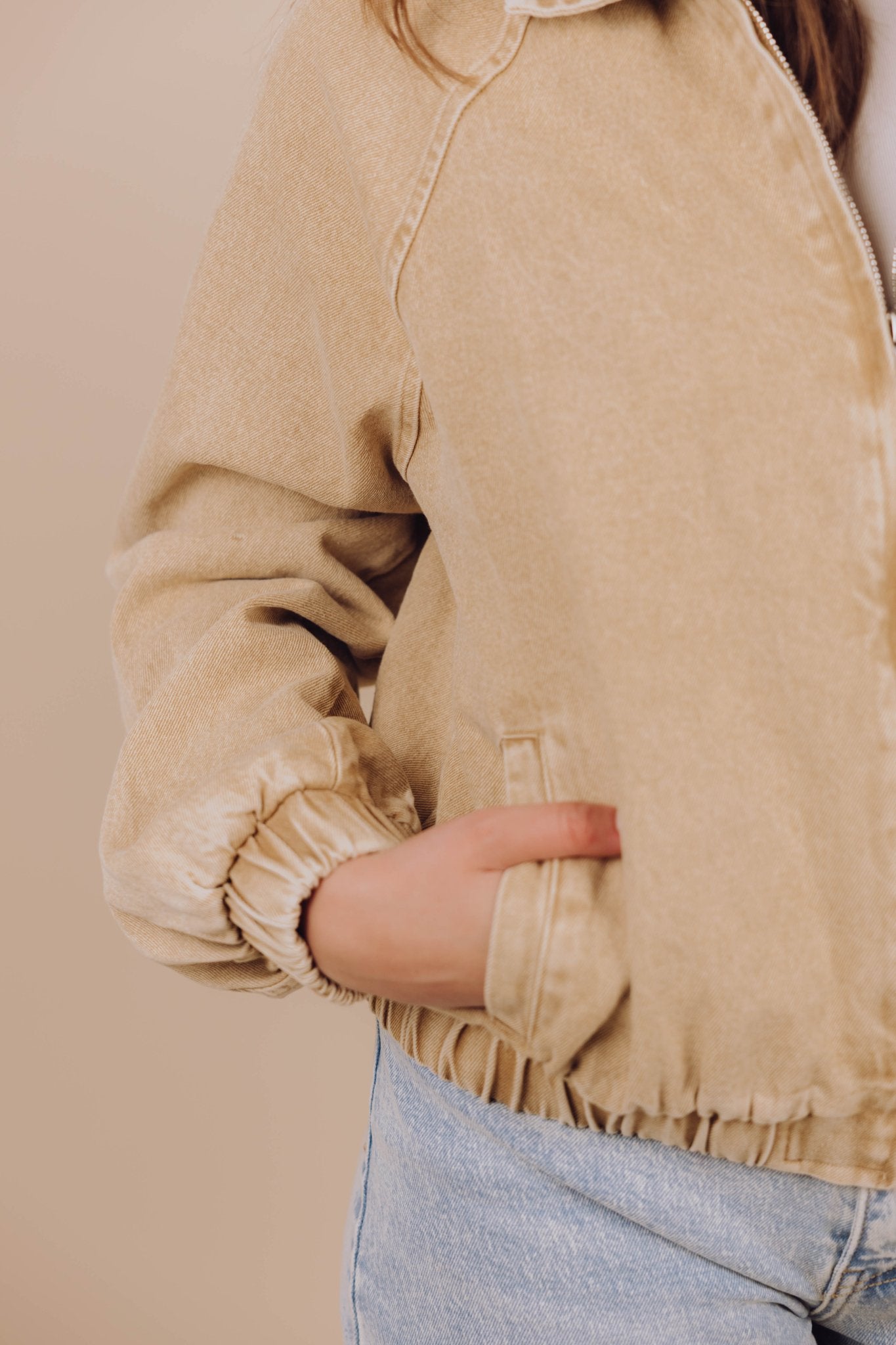 De Kaitlyn Bomber in beige is gemaakt van een denim stof, waardoor hij een stoere uitstraling krijgt. Het jasje heeft lange mouwen, een kraagje, een ritssluiting en valt cropped. Doordat dit jasje voorzien is van een elastische onderkant, krijgt hij een gepoft model.