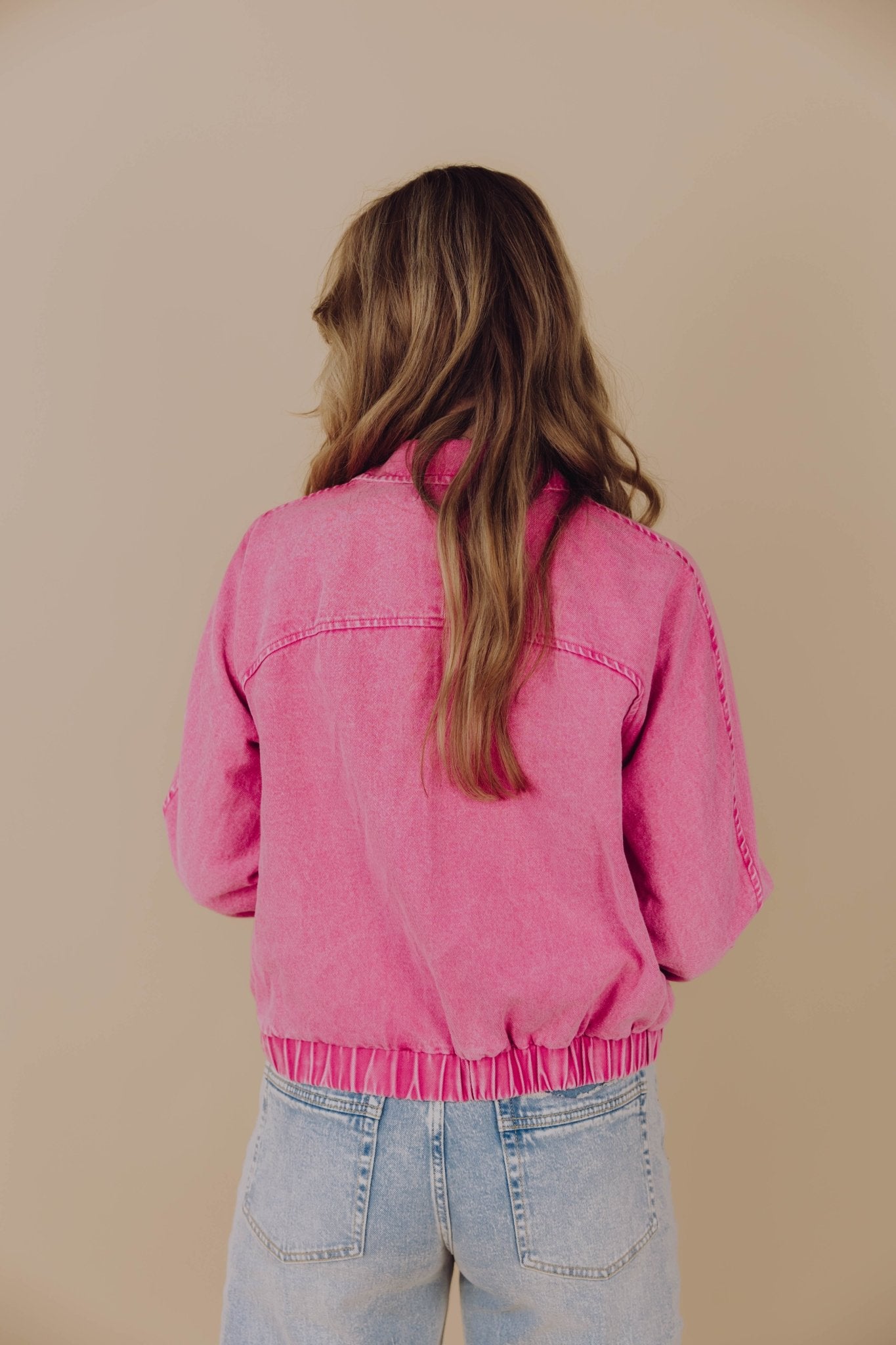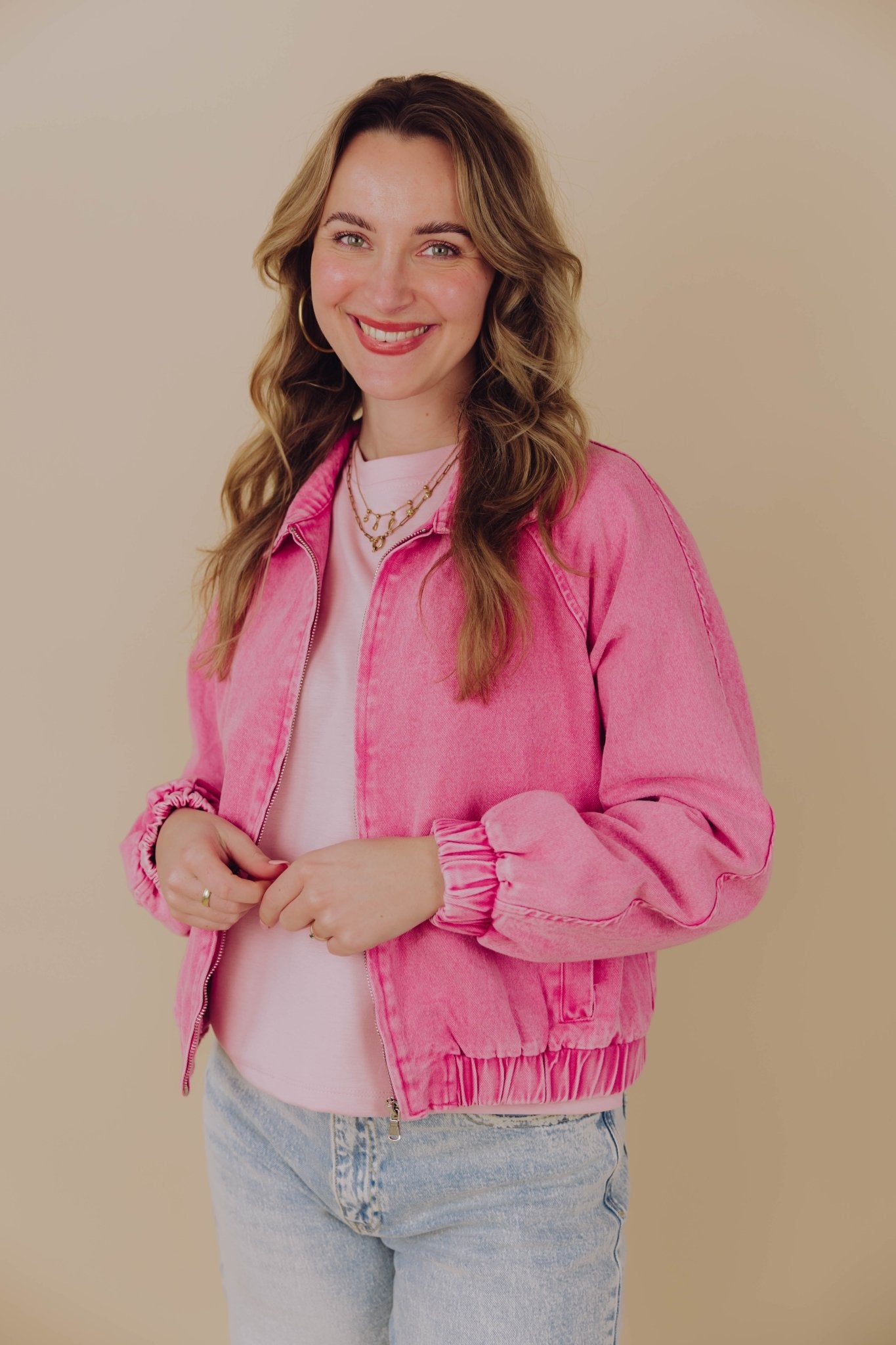 De Kaitlyn Bomber in roze is gemaakt van een denim stof, waardoor hij een stoere uitstraling krijgt. Het jasje heeft lange mouwen, een kraagje, een ritssluiting en valt cropped. Doordat dit jasje voorzien is van een elastische onderkant, krijgt hij een gepoft model.