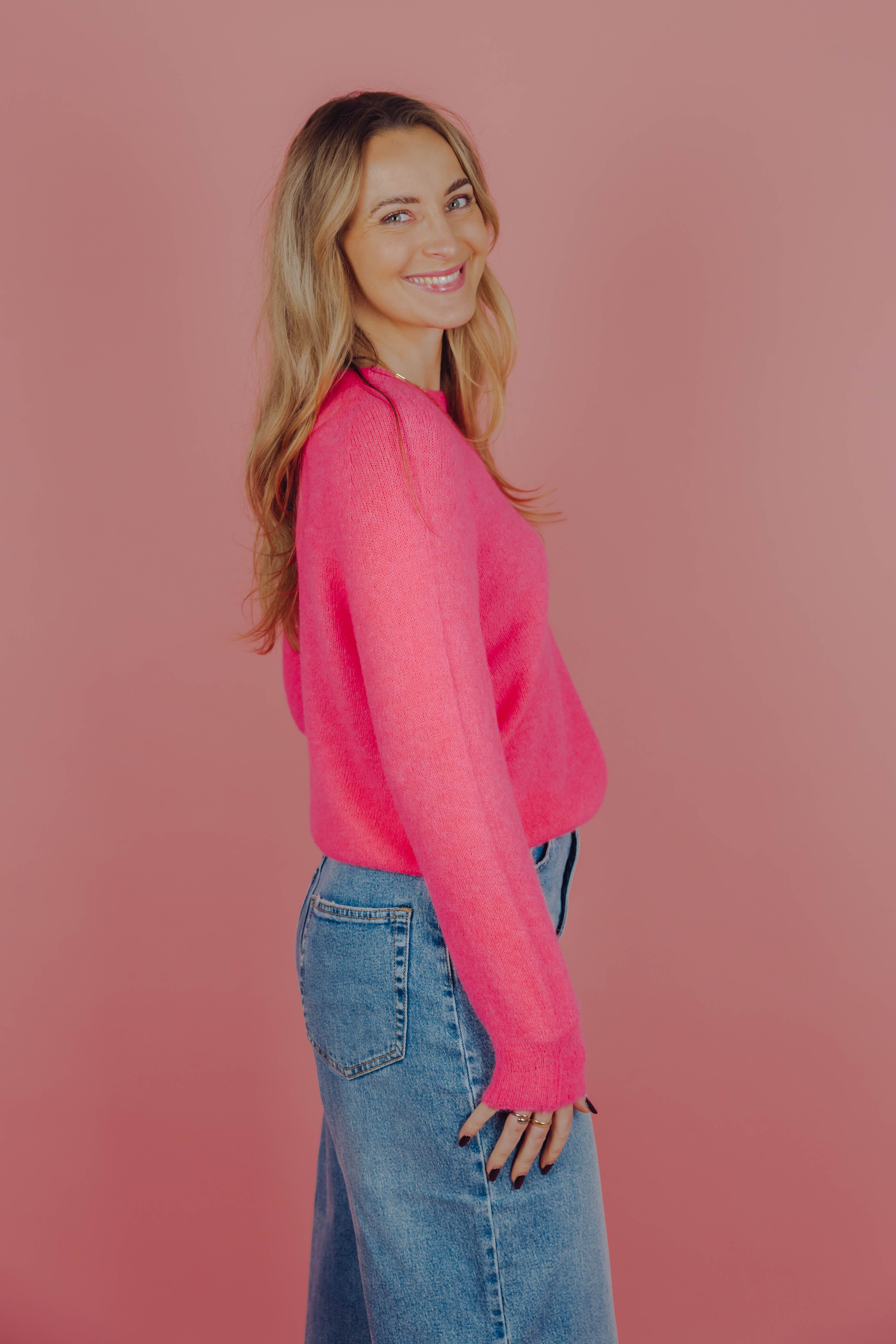 De Karlijn Knit in neon roze is gemaakt van een gebreid materiaal, waardoor hij heerlijk warm is. De sweater heeft lange mouwen, een ronde halslijn en is perfect voor de koude dagen!