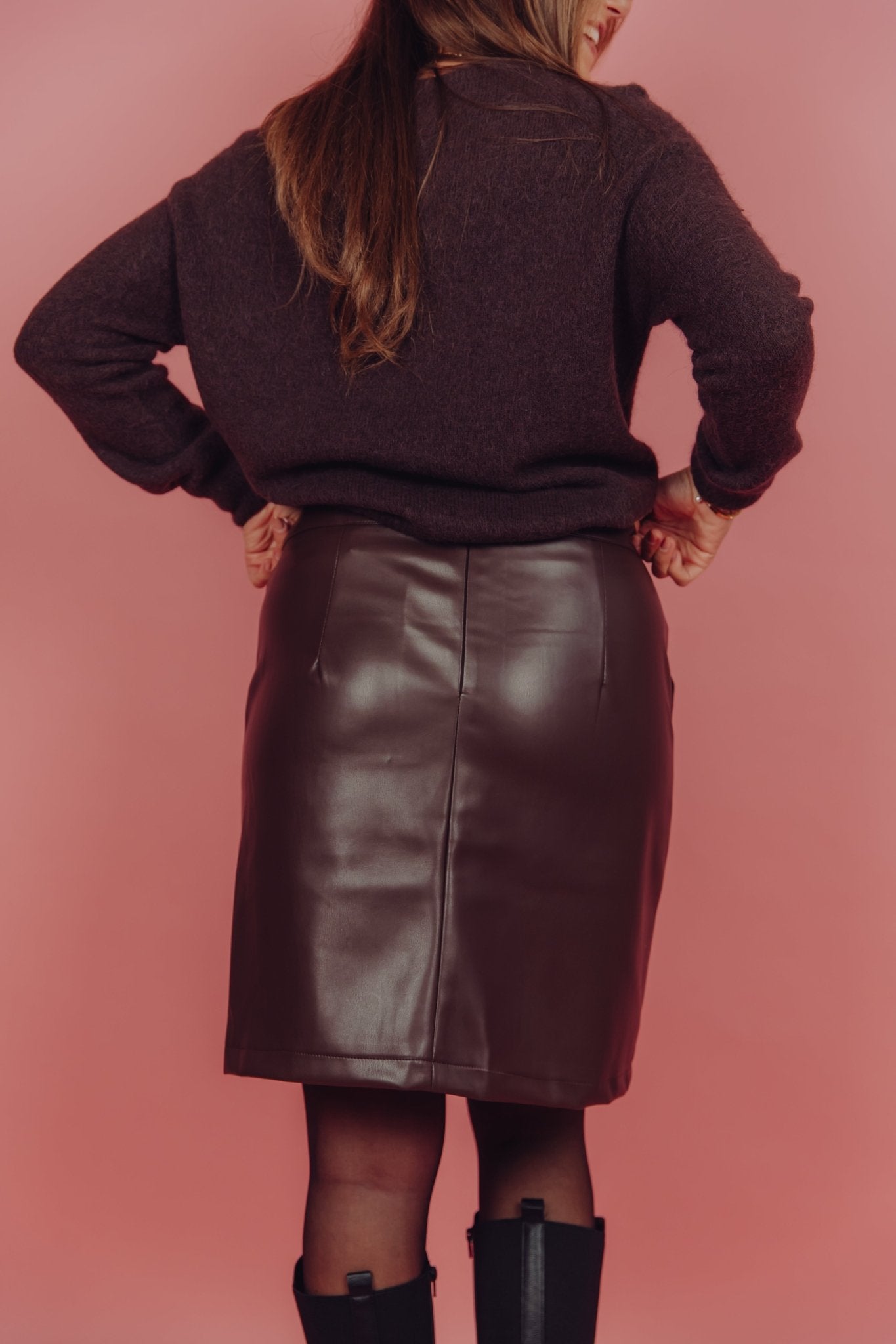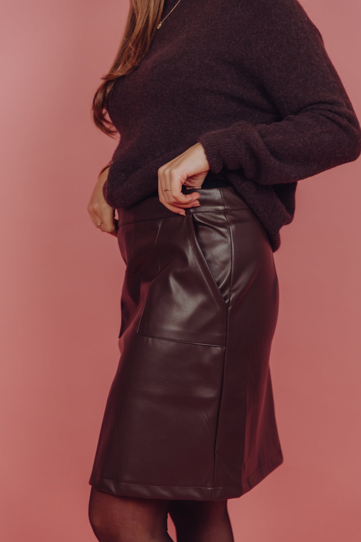 Kate is een stijlvol faux-leather rokje met opgestikte zakken voor een trendy, stoere look. Het rokje is netjes afgewerkt met een blinde rits aan de achterkant en heeft een fijne lengte—niet te kort, maar precies goed. Een perfecte toevoeging aan je garderobe!