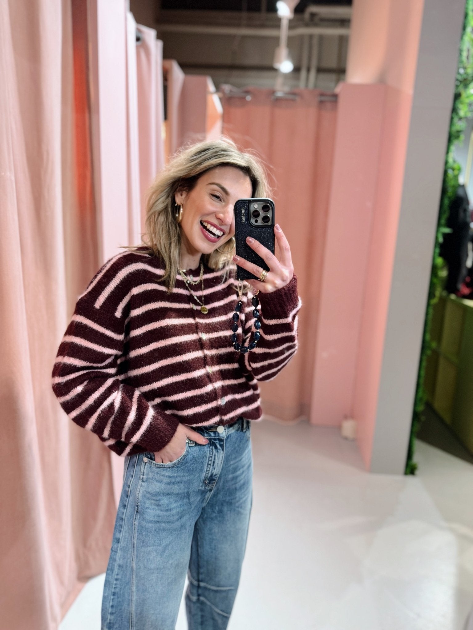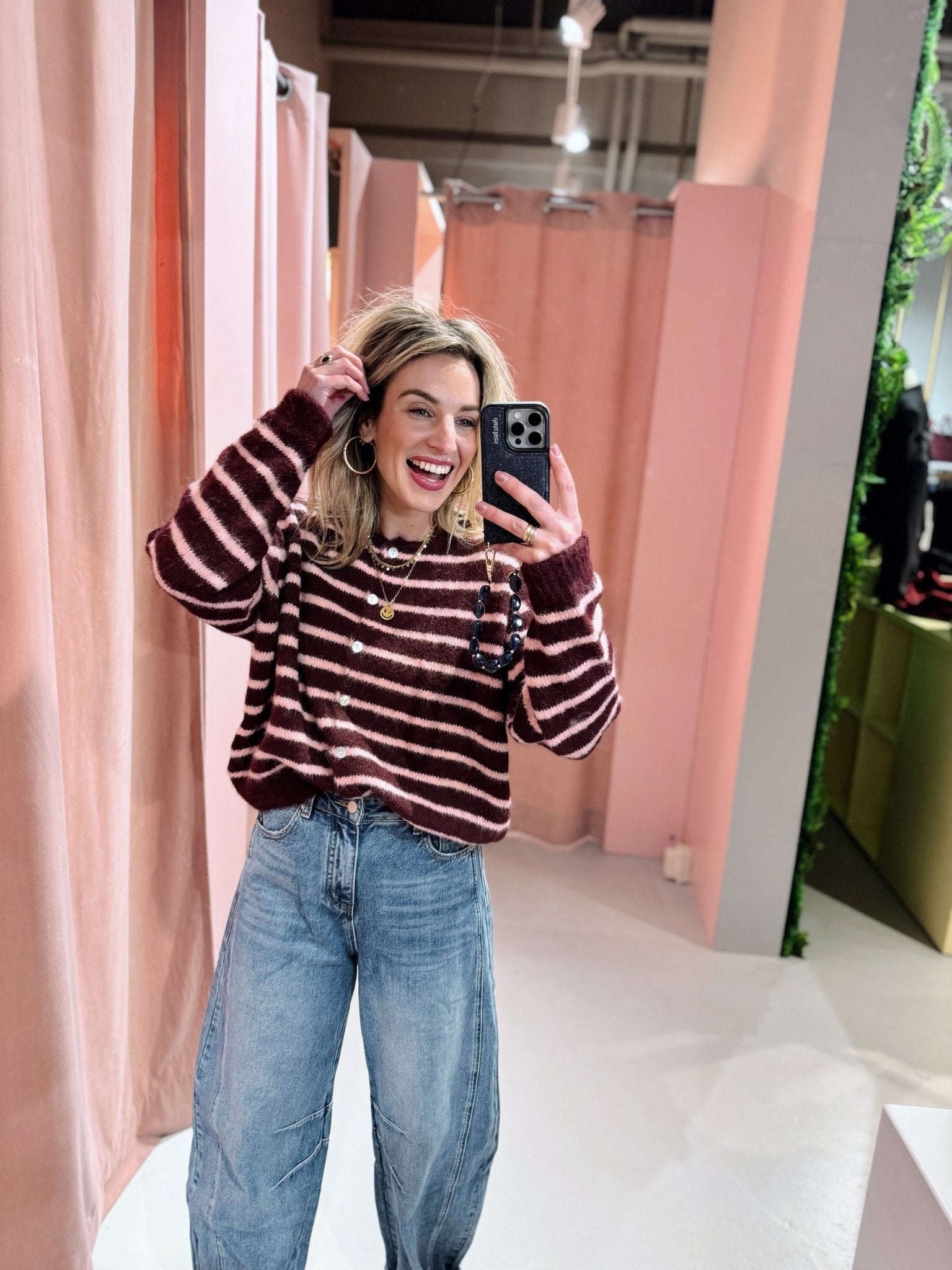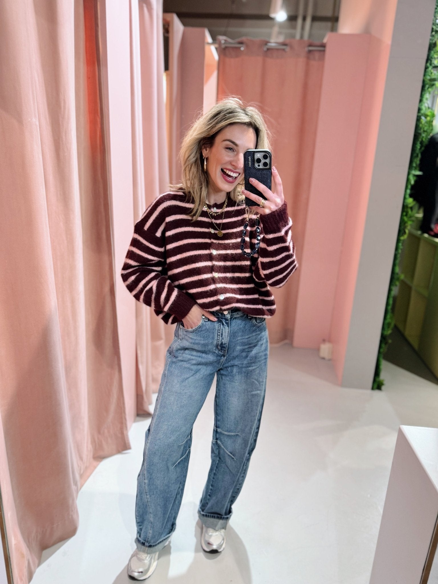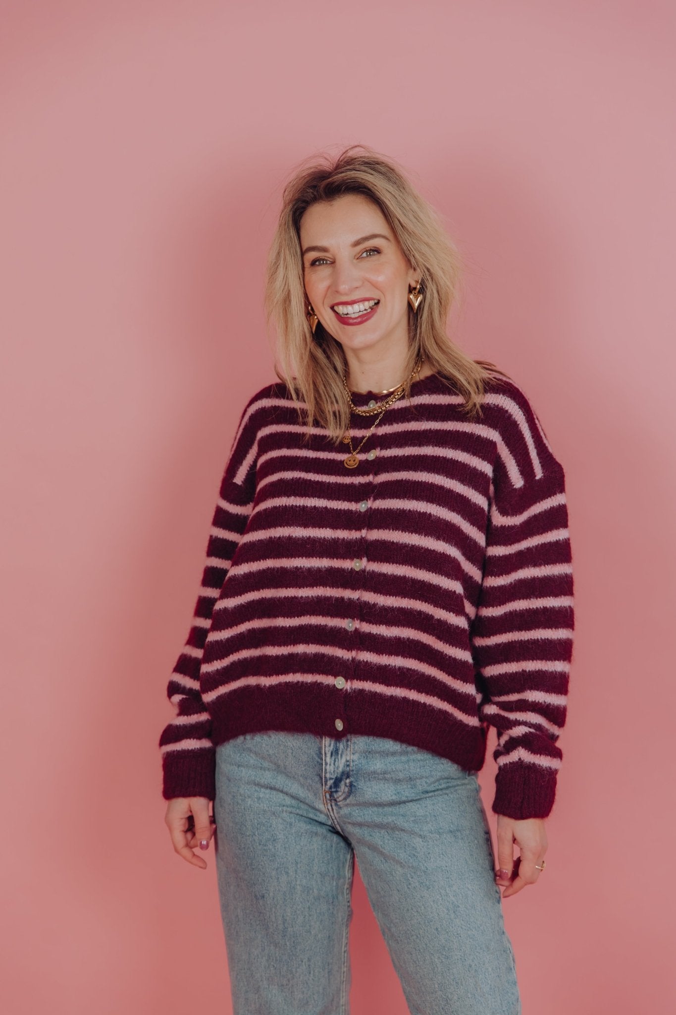 De Kaya Cardigan in bordeaux heeft een boxy oversized fit en is gemaakt van een zachte, gebreide stof met een streep patroon. Het vest heeft lange mouwen, een ronde hals en holografische knoopjes. Ideaal om te dragen in laagjes met het koude weer!
