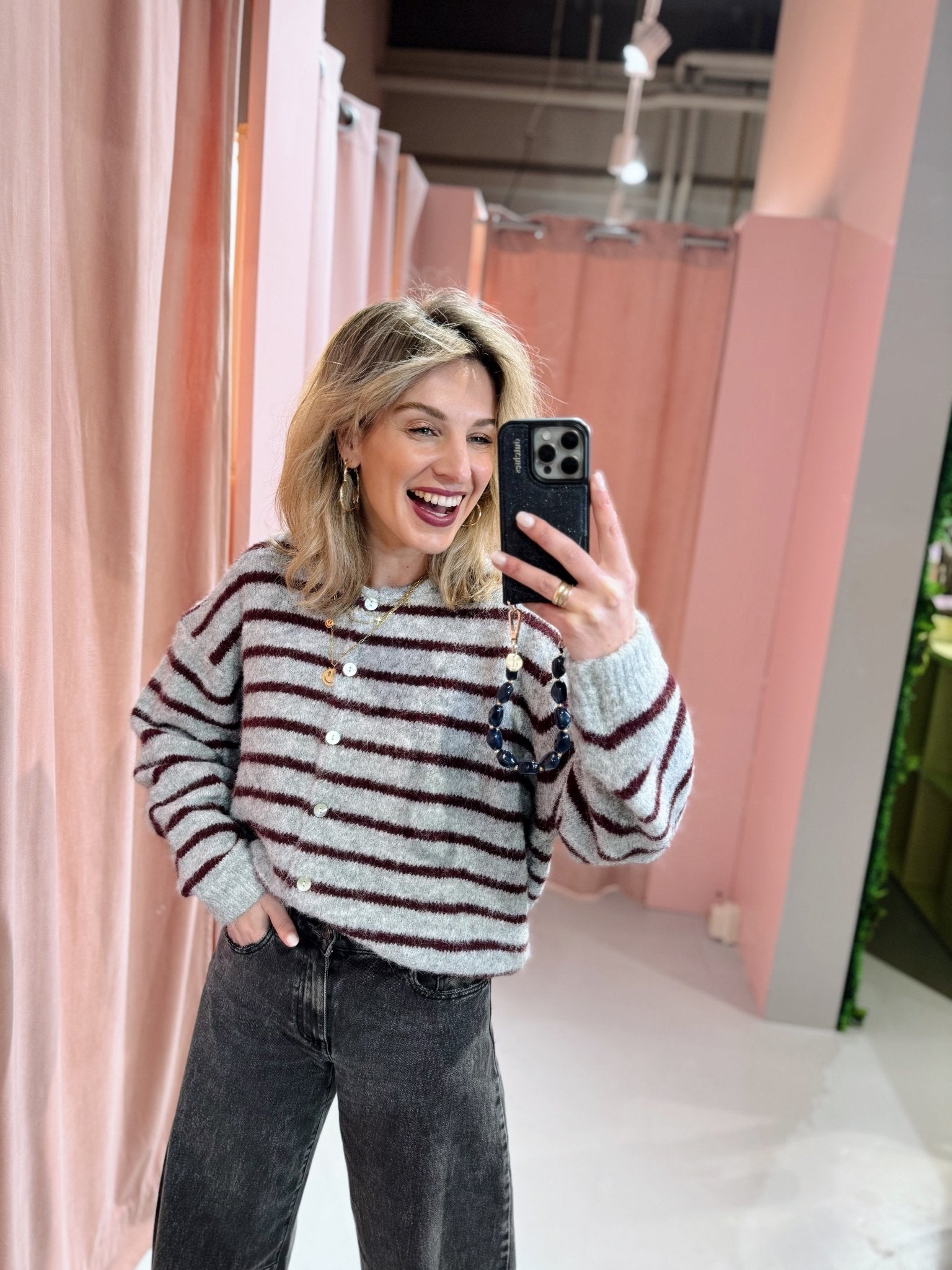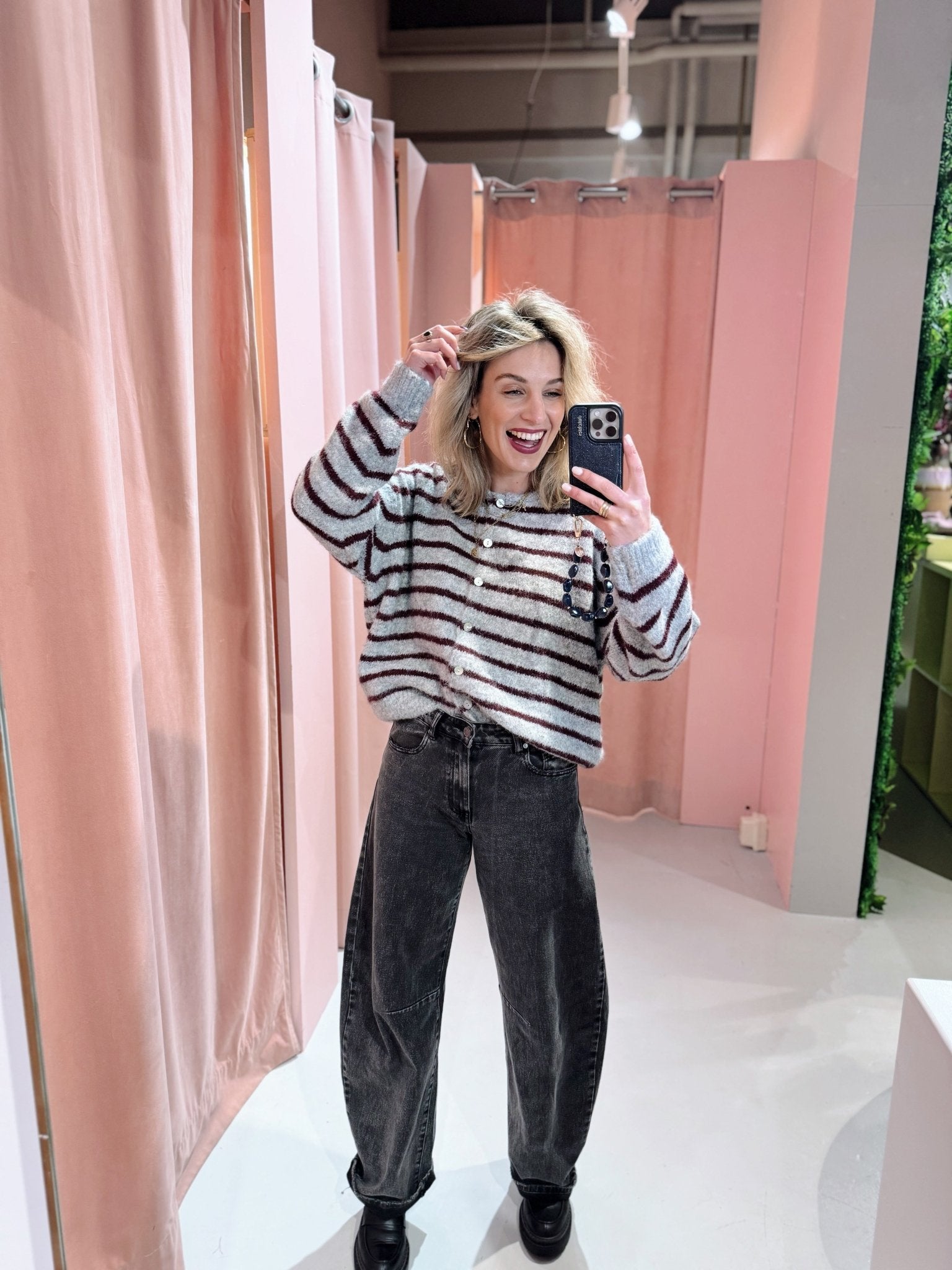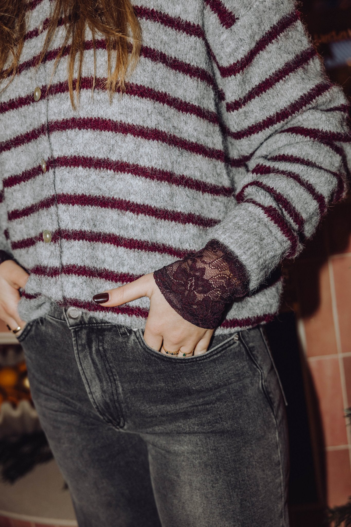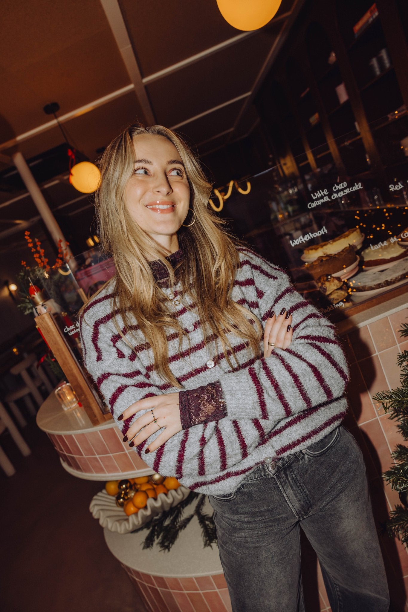 De Kaya Cardigan in grijs heeft een boxy oversized fit en is gemaakt van een zachte, gebreide stof met een streep patroon. Het vest heeft lange mouwen, een ronde hals en holografische knoopjes. Ideaal om te dragen in laagjes met het koude weer!