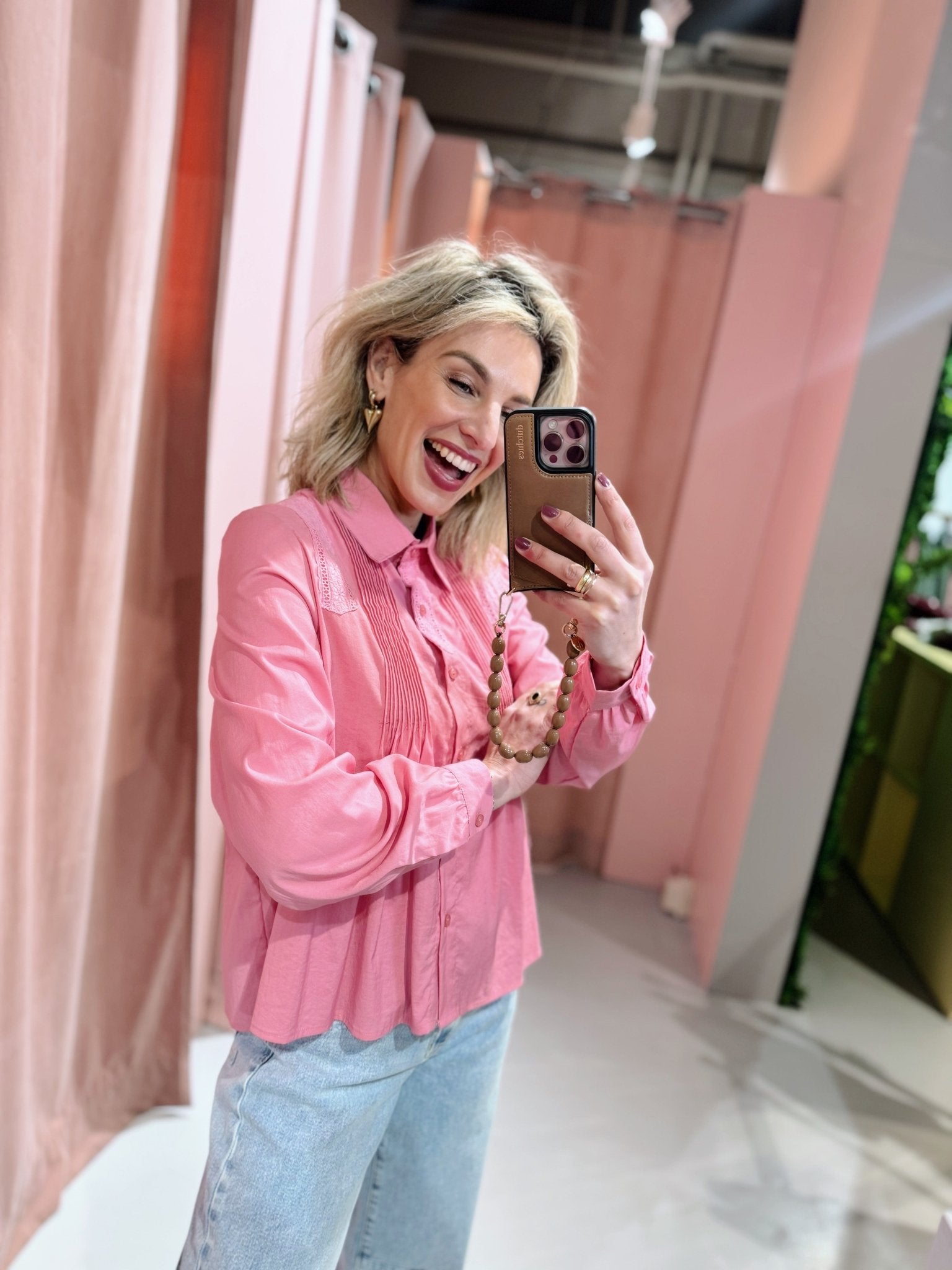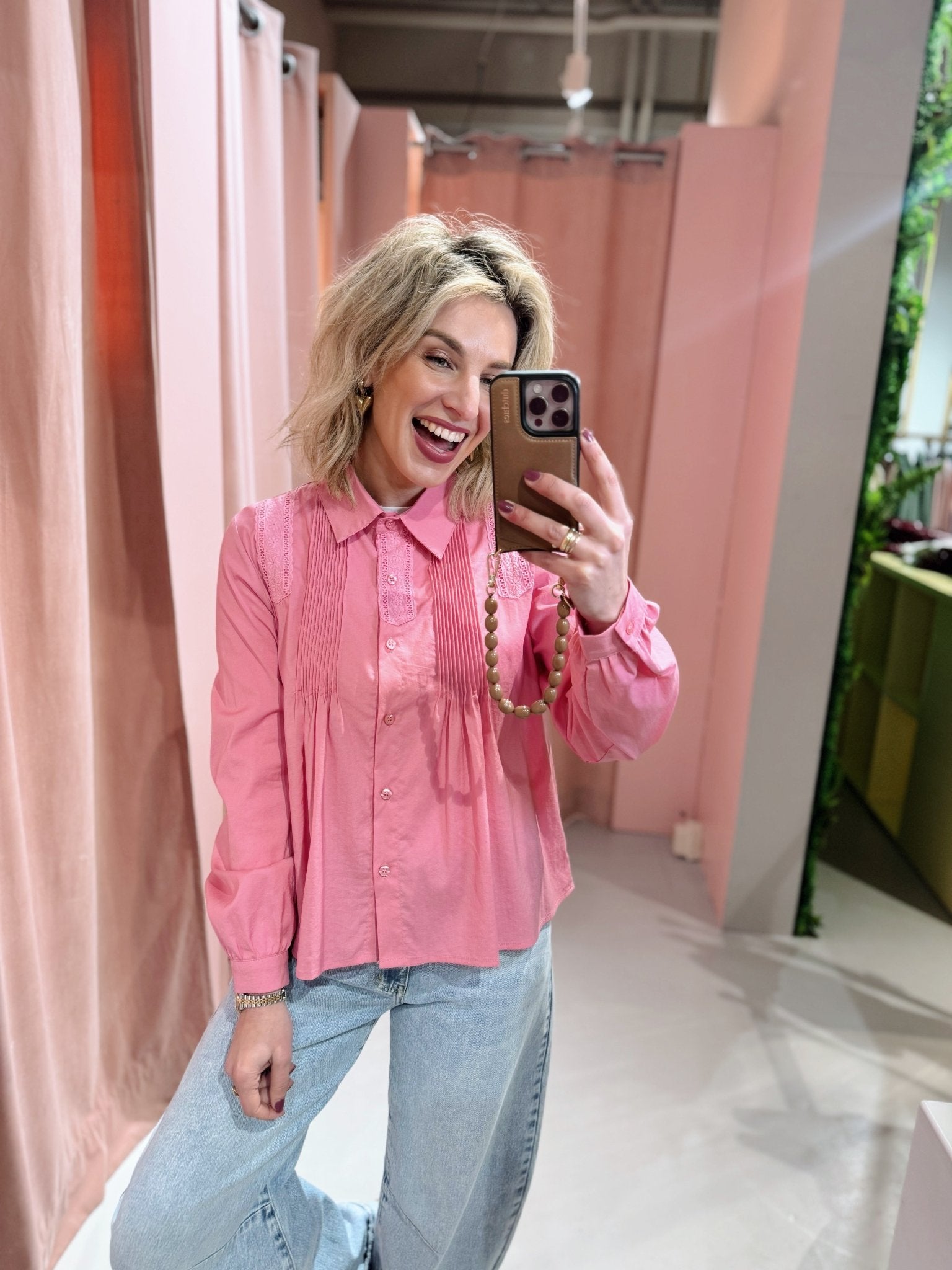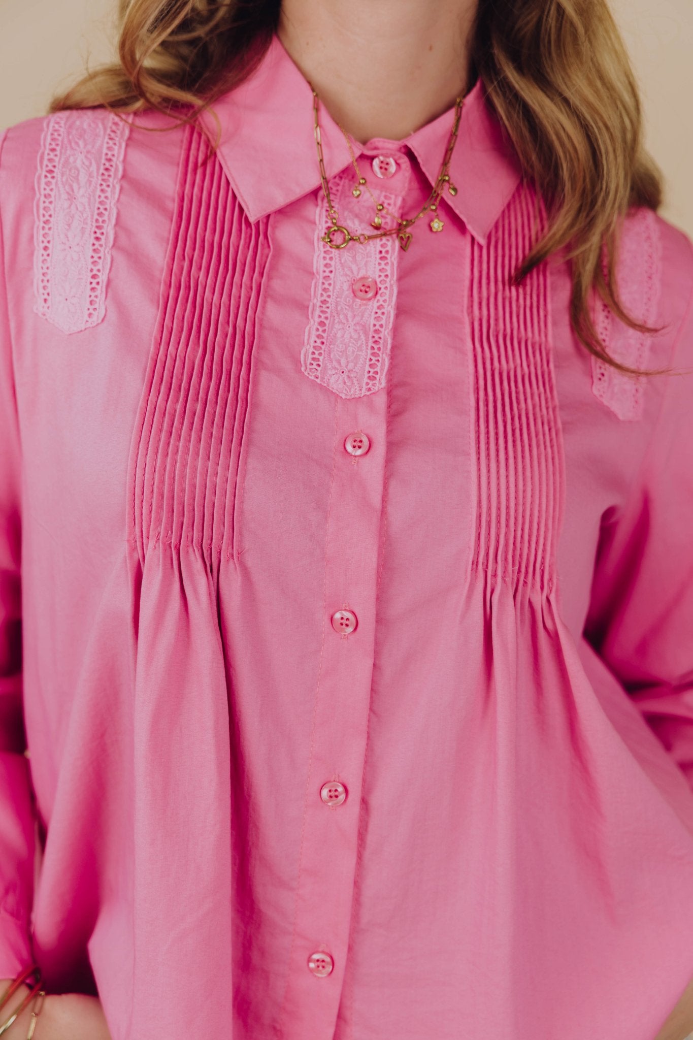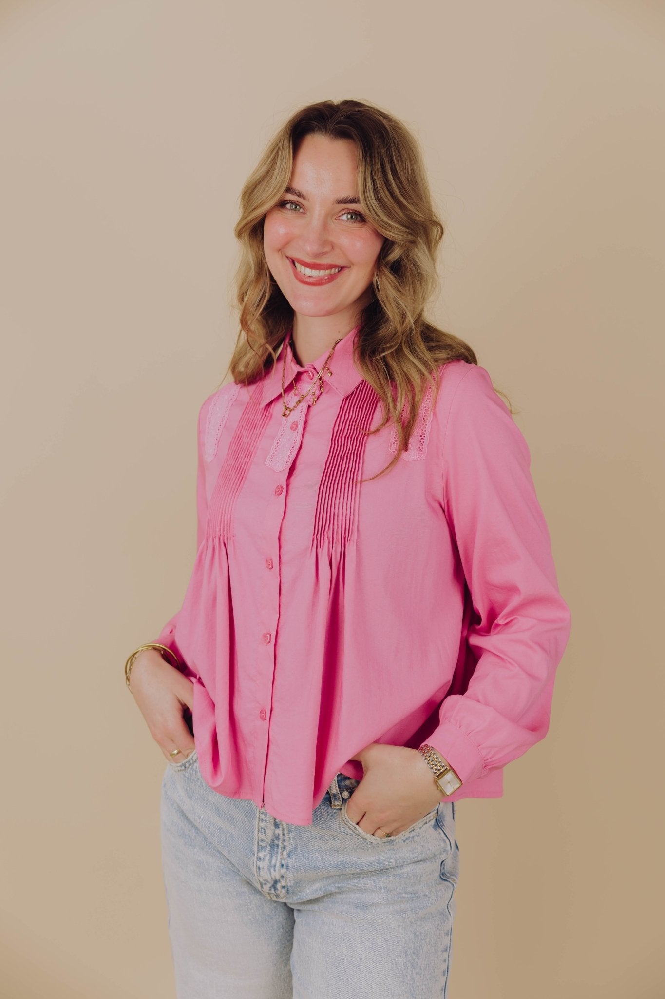 De Kaylee Blouse is een schattige roze blouse met broderie details en ruches. De blouse heeft een boxy model met lange mouwen en een kraagje en is gemakkelijk te sluiten met een knoopsluiting aan de voorkant.