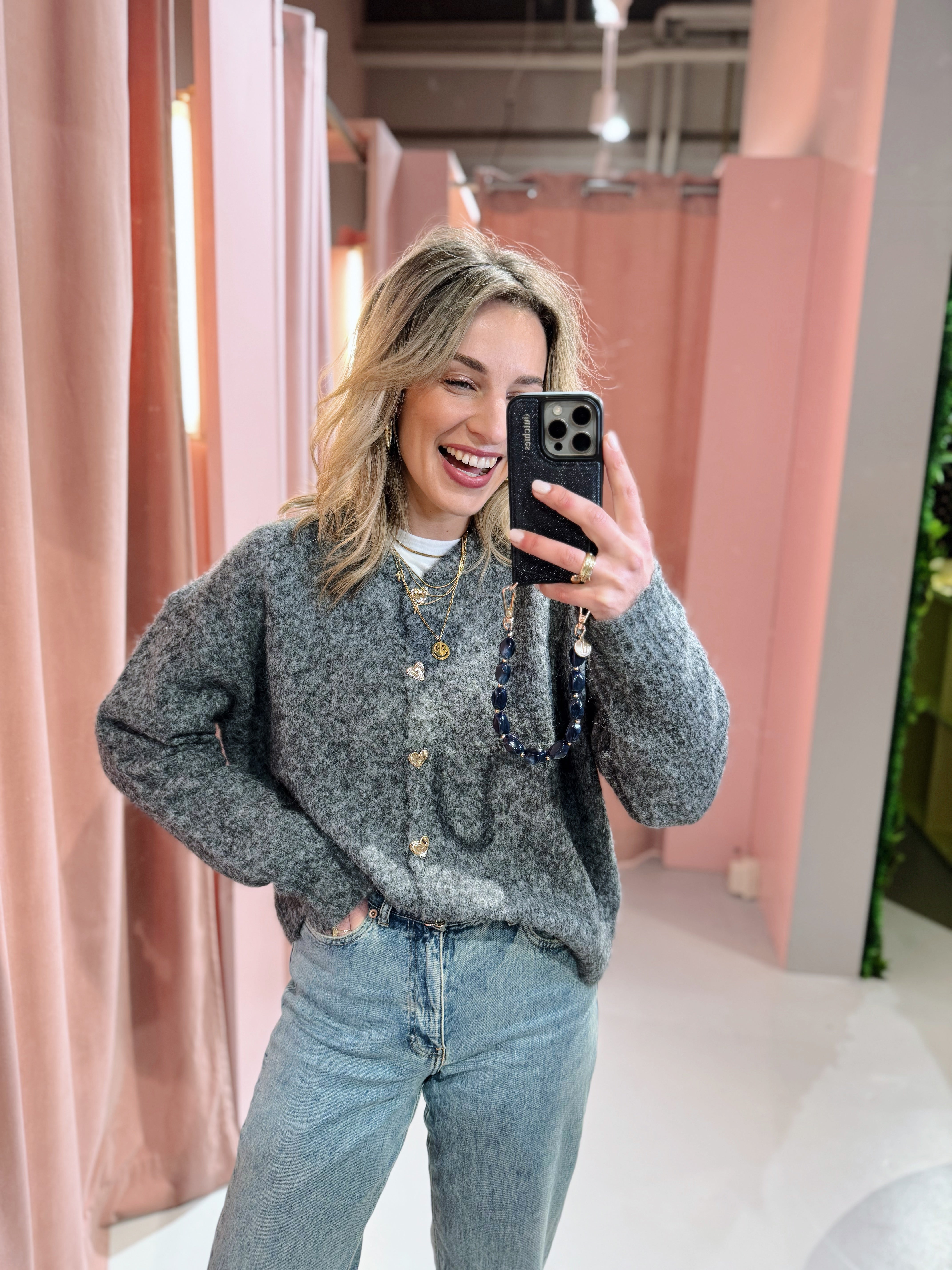 De Kiki Cardigan in grijs heeft een moderne boxy fit en is gemaakt van een zachte, gebreide stof die comfortabel aanvoelt. Het vest heeft lange mouwen, een V-hals en is afgewerkt met goudkleurige, hartvormige knoopjes voor een subtiele, vrouwelijke touch.