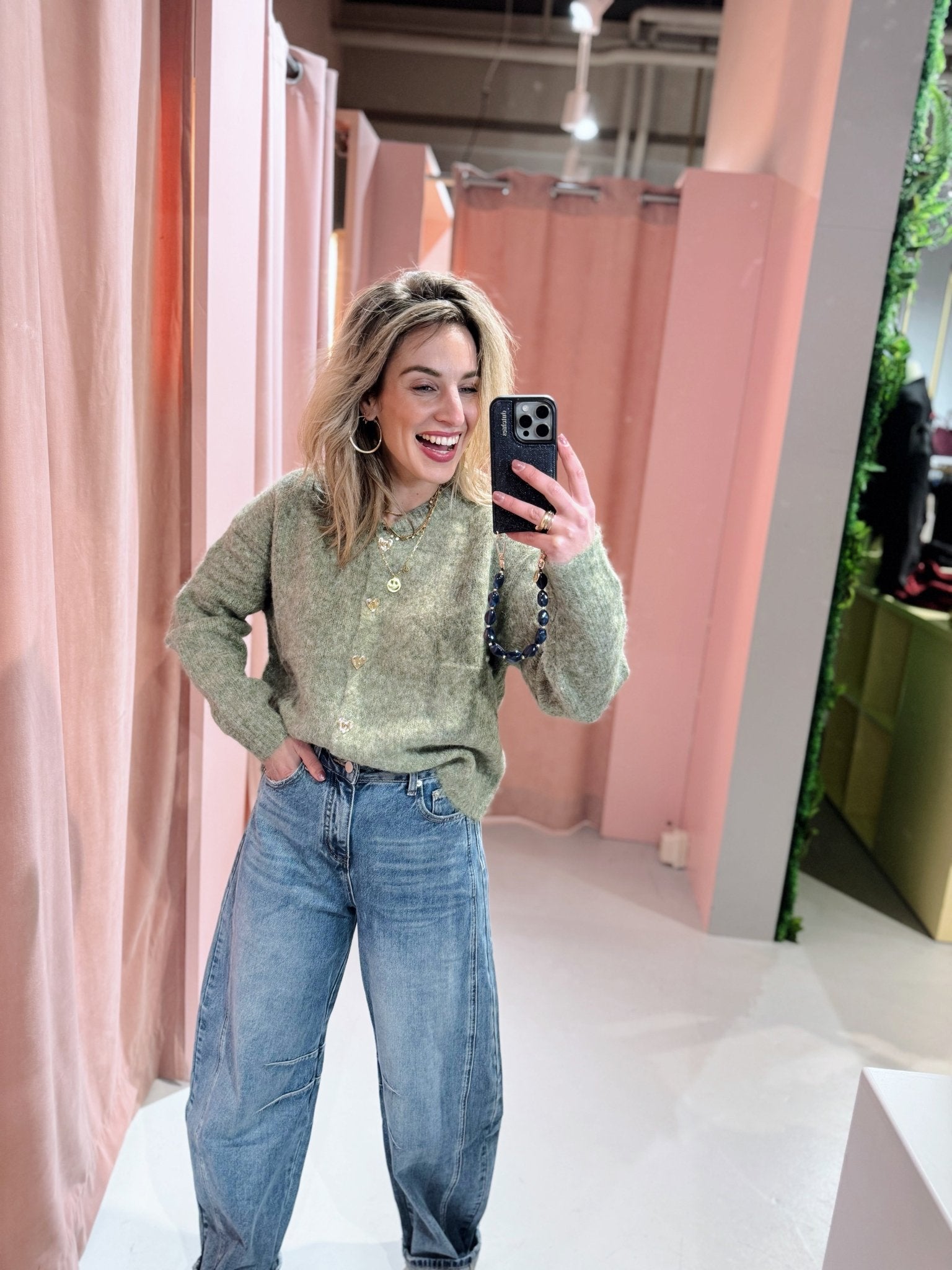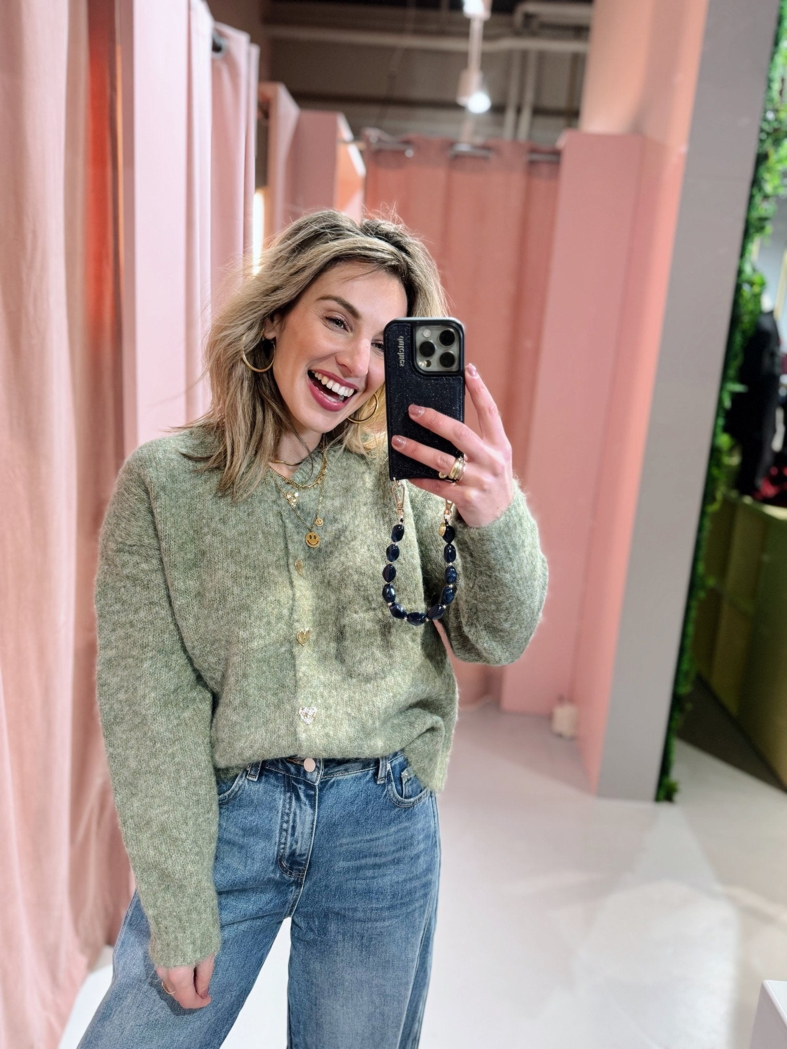 De Kiki Cardigan in groen heeft een moderne boxy fit en is gemaakt van een zachte, gebreide stof die comfortabel aanvoelt. Het vest heeft lange mouwen, een V-hals en is afgewerkt met goudkleurige, hartvormige knoopjes voor een subtiele, vrouwelijke touch.