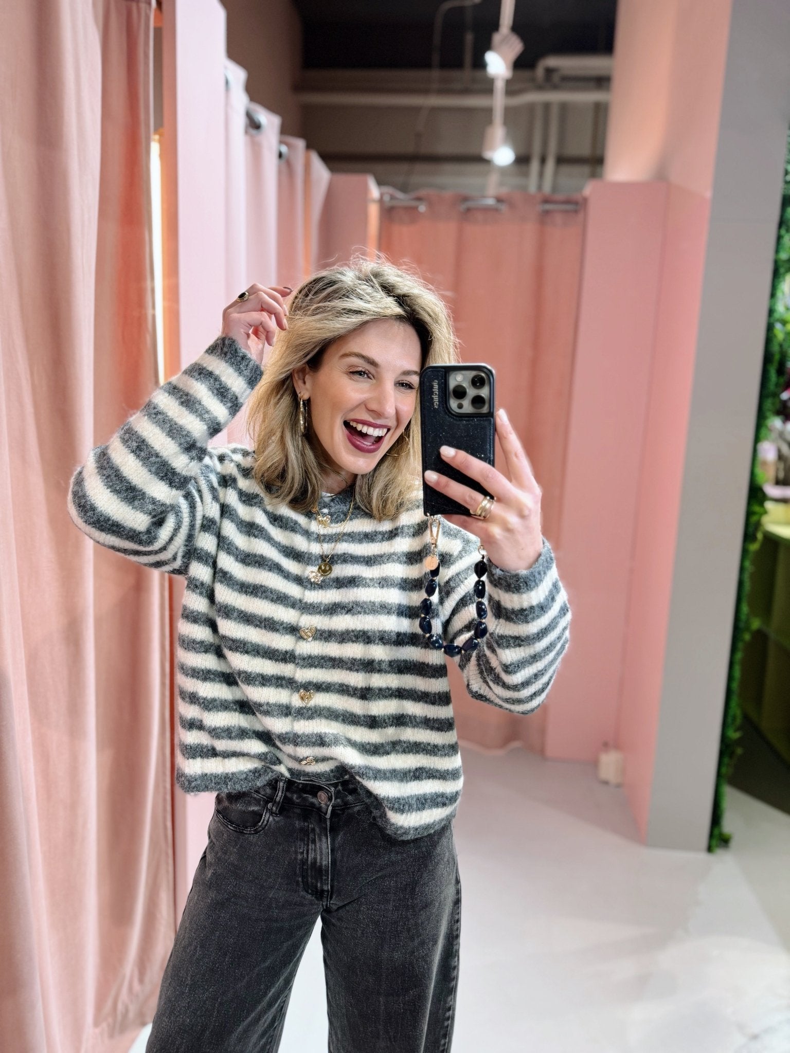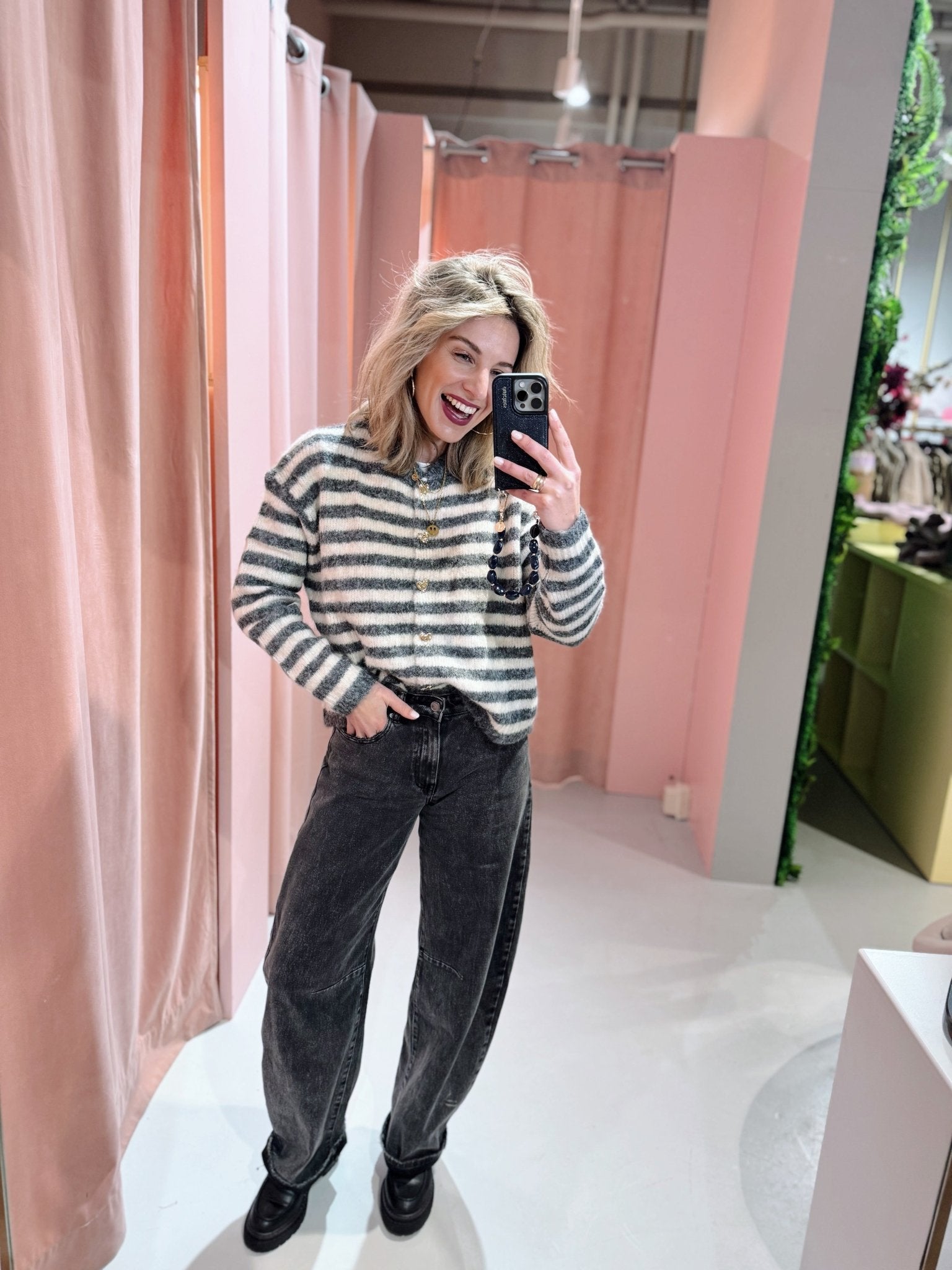 De Kiki Cardigan in grijs heeft een moderne boxy fit en is gemaakt van een zachte, gebreide stof die comfortabel aanvoelt. Het vest heeft lange mouwen, een V-hals en is afgewerkt met goudkleurige, hartvormige knoopjes voor een subtiele, vrouwelijke touch. Een extra leuk detail, is het grijs met witte streep ontwerp.