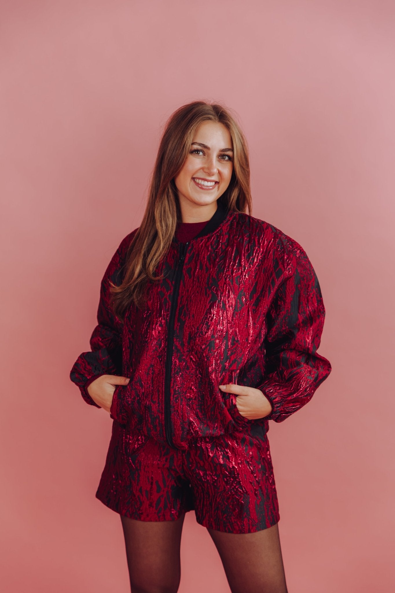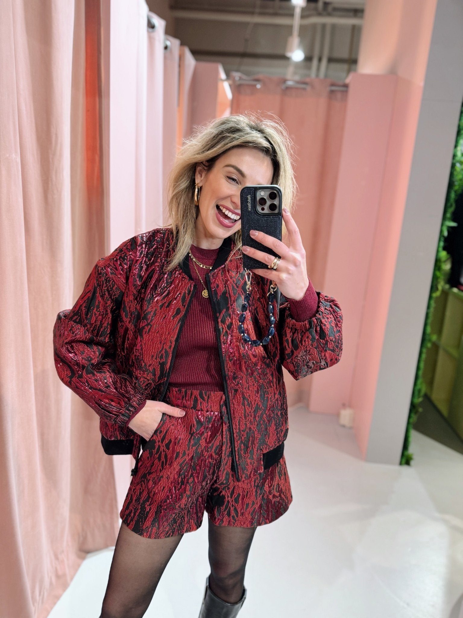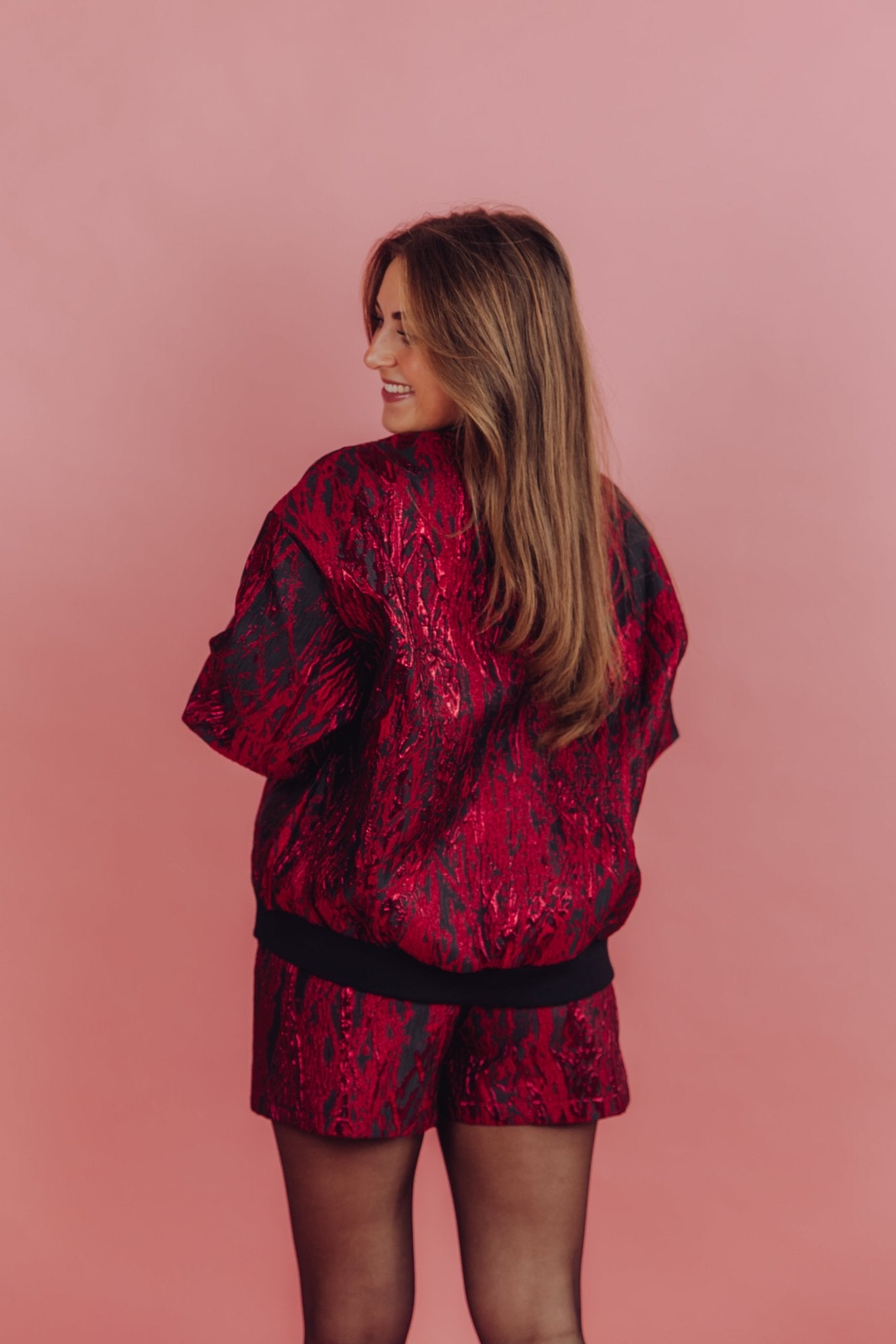 De Kira Bomber in bordeaux is gemaakt van een metallic jacquard stof, waardoor hij een échte eyecatcher is! De jas heeft steekzakken en een ritssluiting en valt oversized. Combineer de Kira Bomber met de Kira Short voor een complete set!