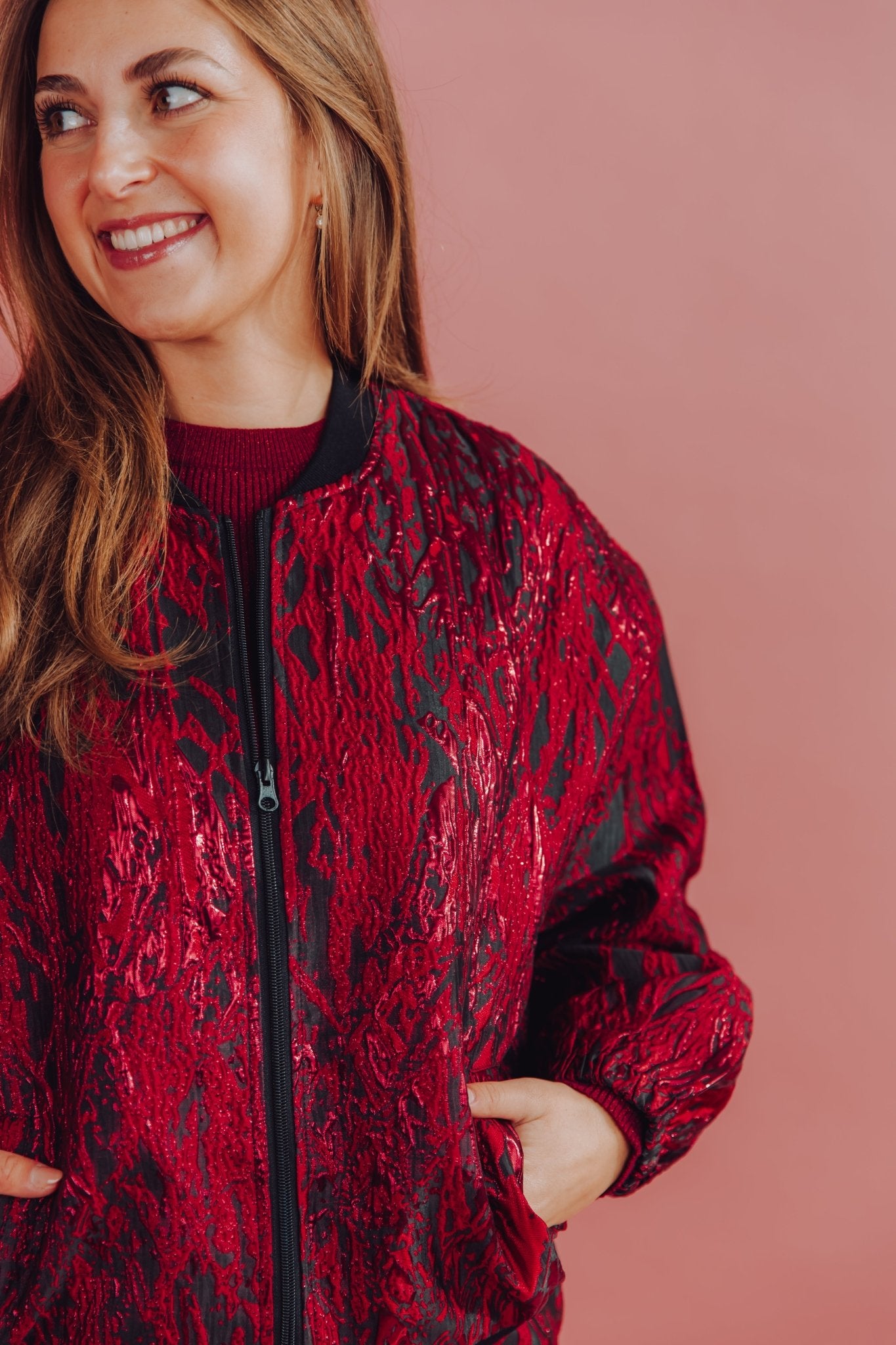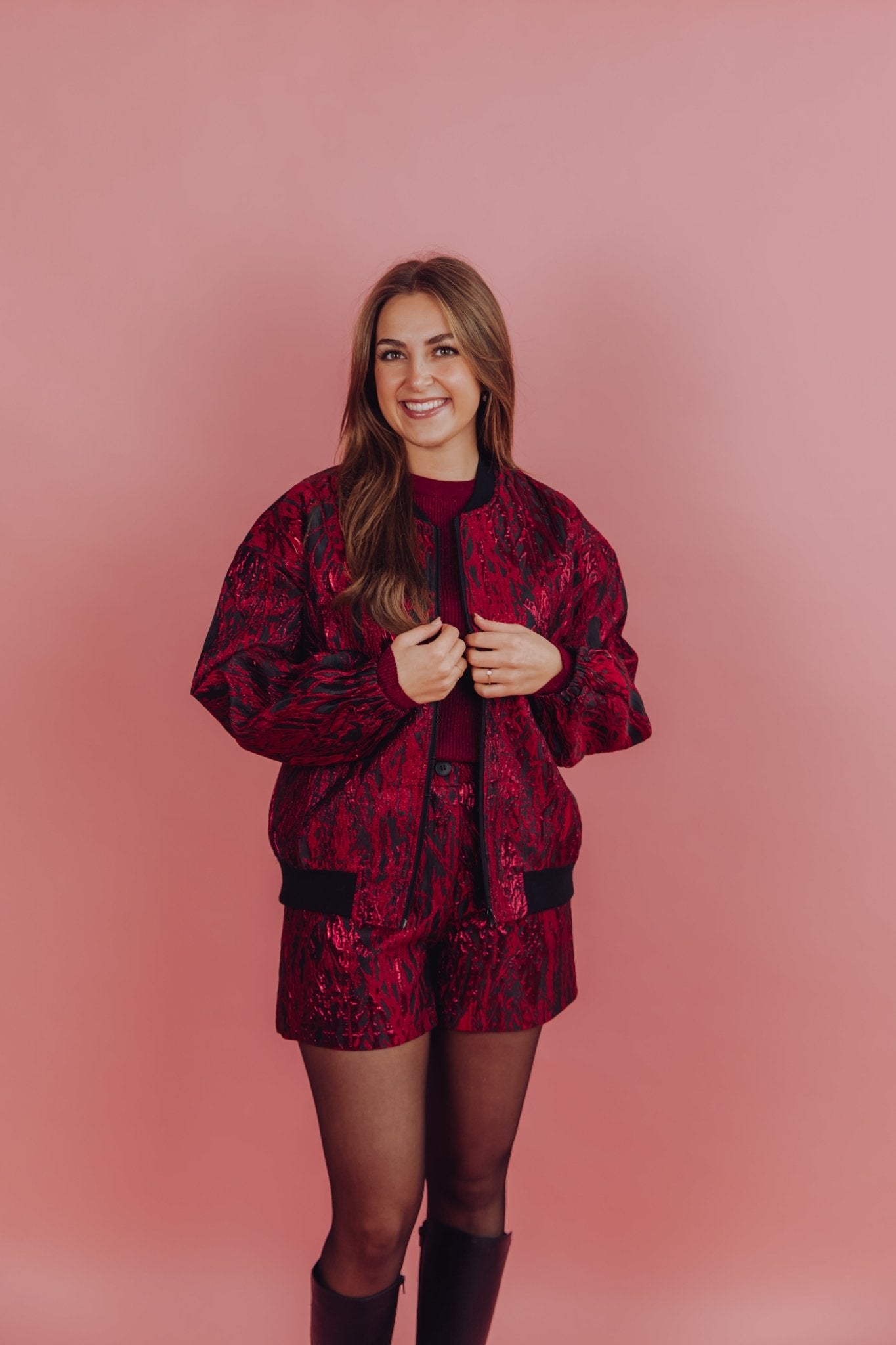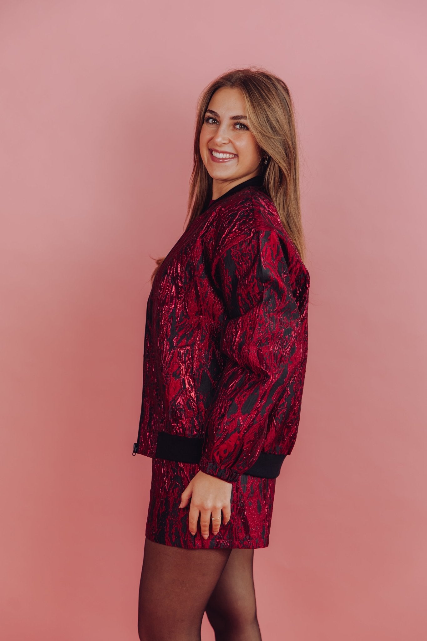 De Kira Bomber in bordeaux is gemaakt van een metallic jacquard stof, waardoor hij een échte eyecatcher is! De jas heeft steekzakken en een ritssluiting en valt oversized. Combineer de Kira Bomber met de Kira Short voor een complete set!