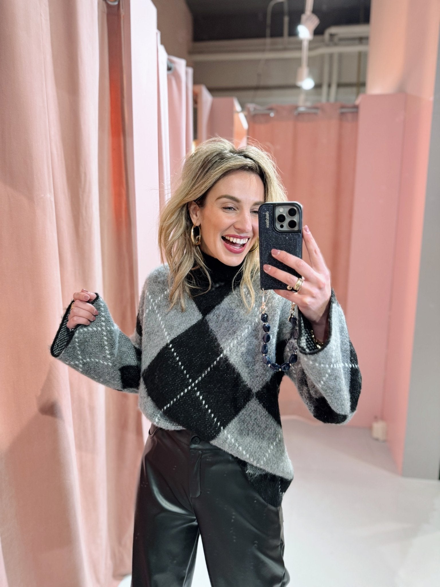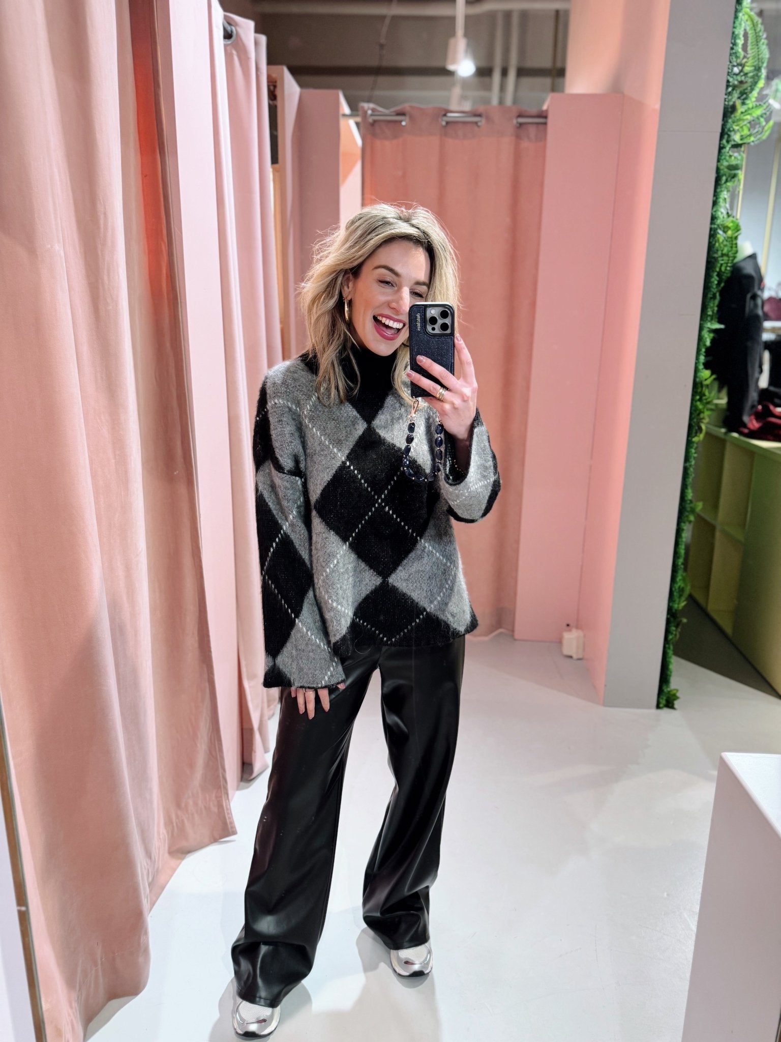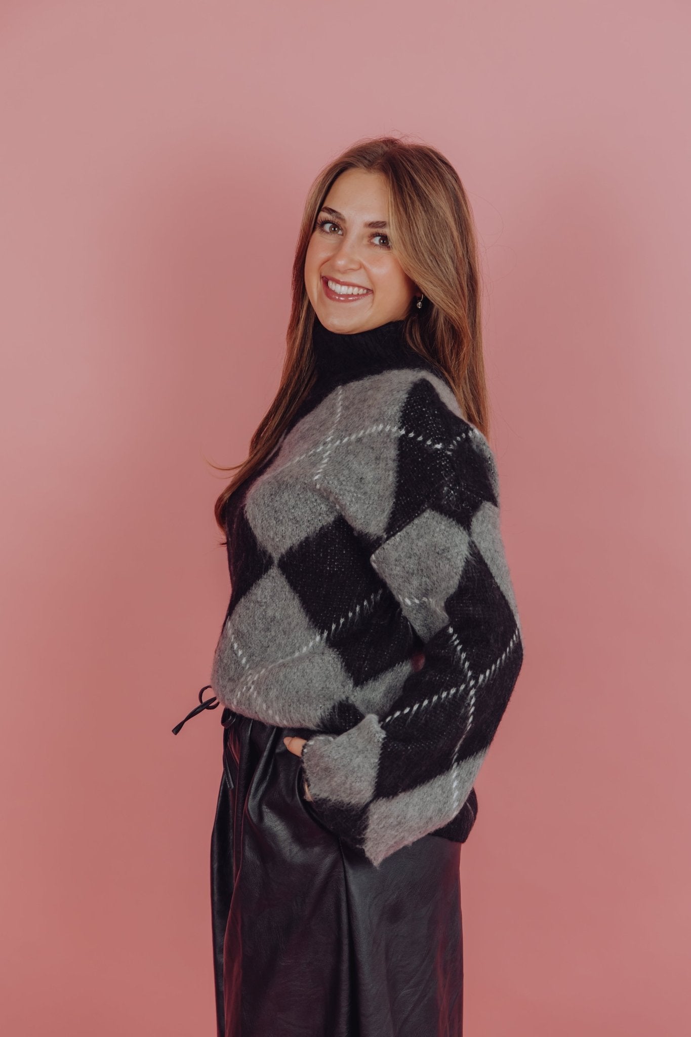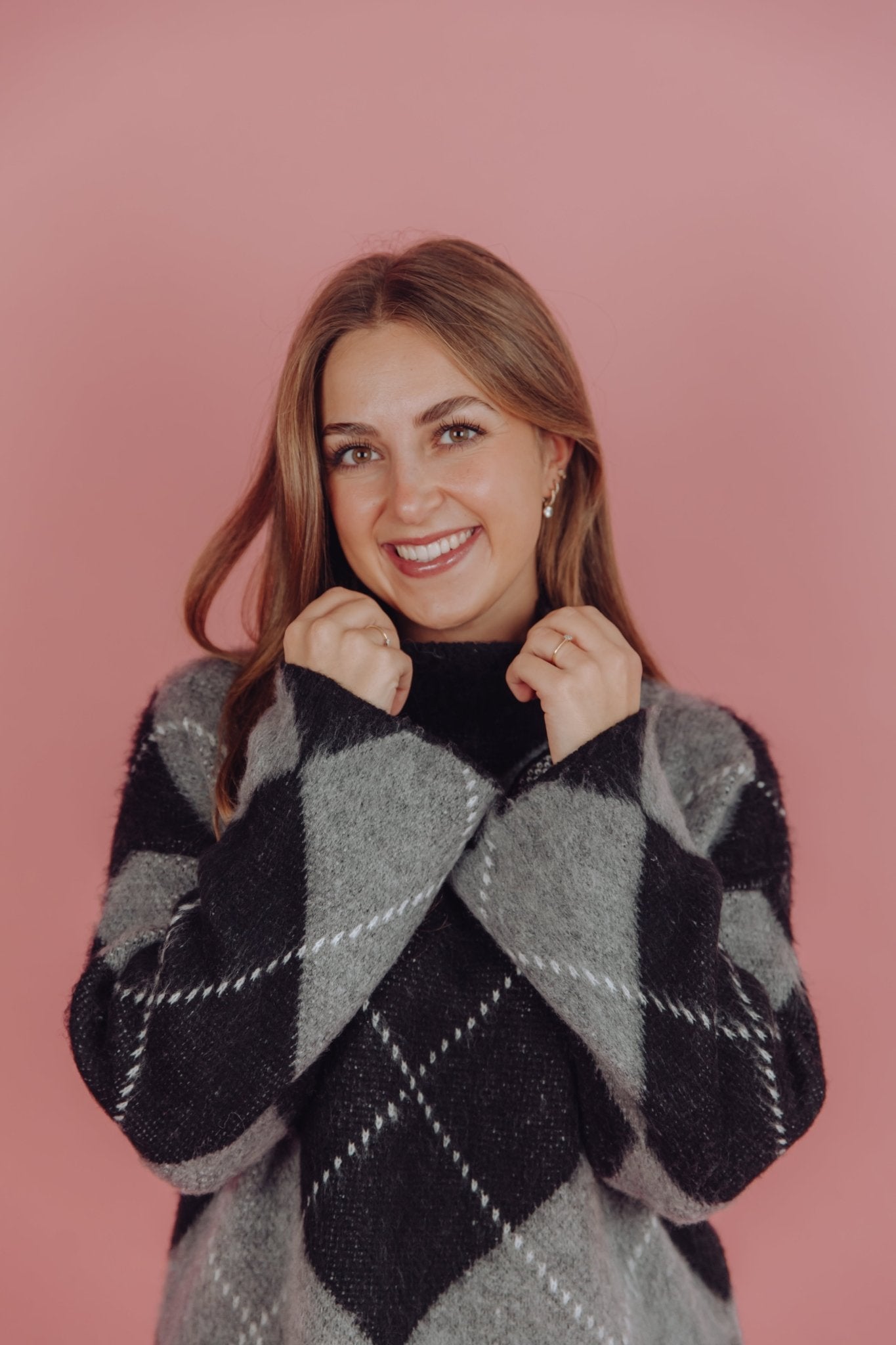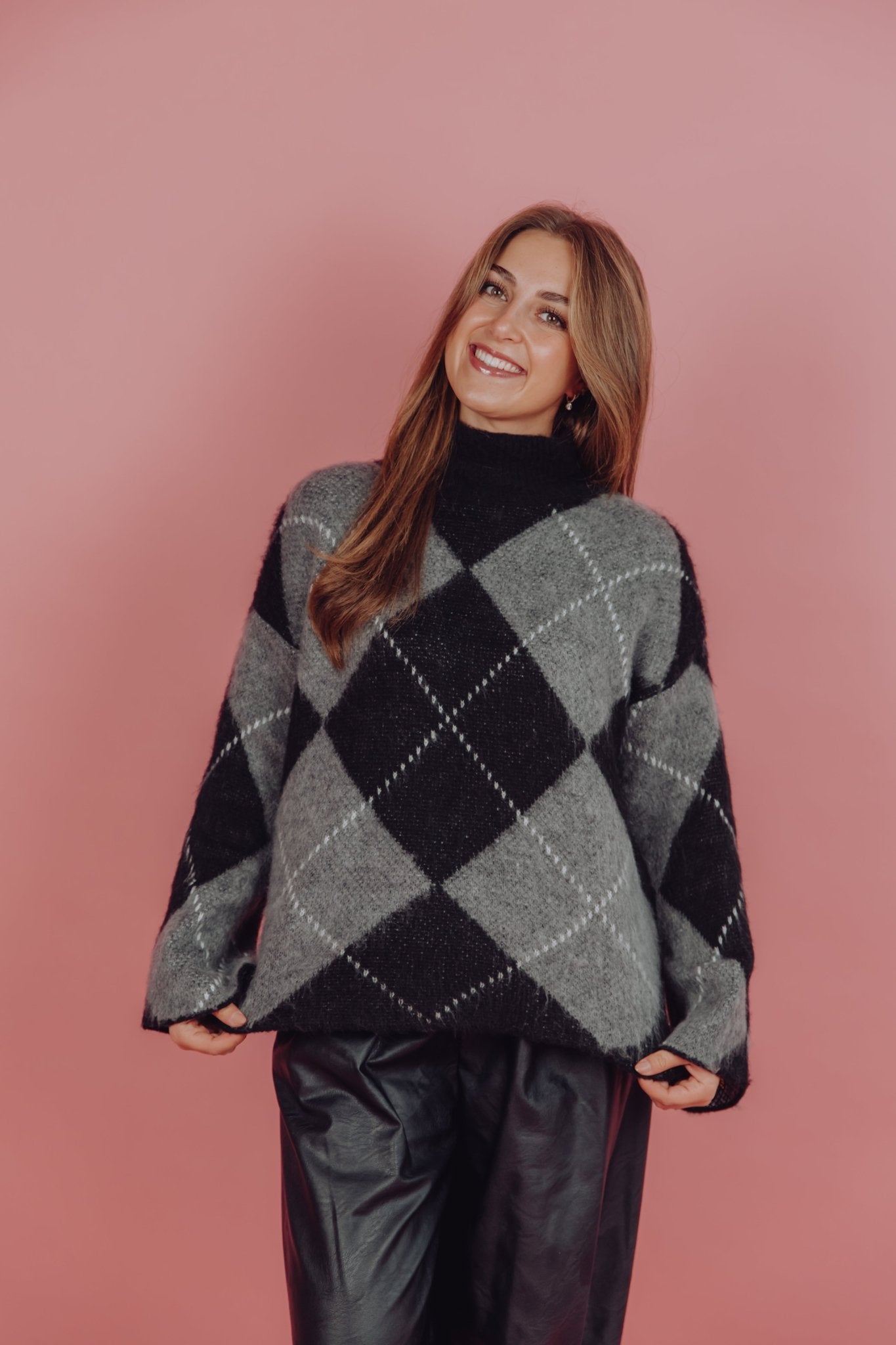 De Kyani Knit in donkergroen is gemaakt van een gebreid materiaal, waardoor hij heerlijk warm is! De trui heeft lange mouwen en een col en is voorzien van een ruitjes patroon waarin de kleuren combi zwart met grijs perfect tot zijn recht komt.