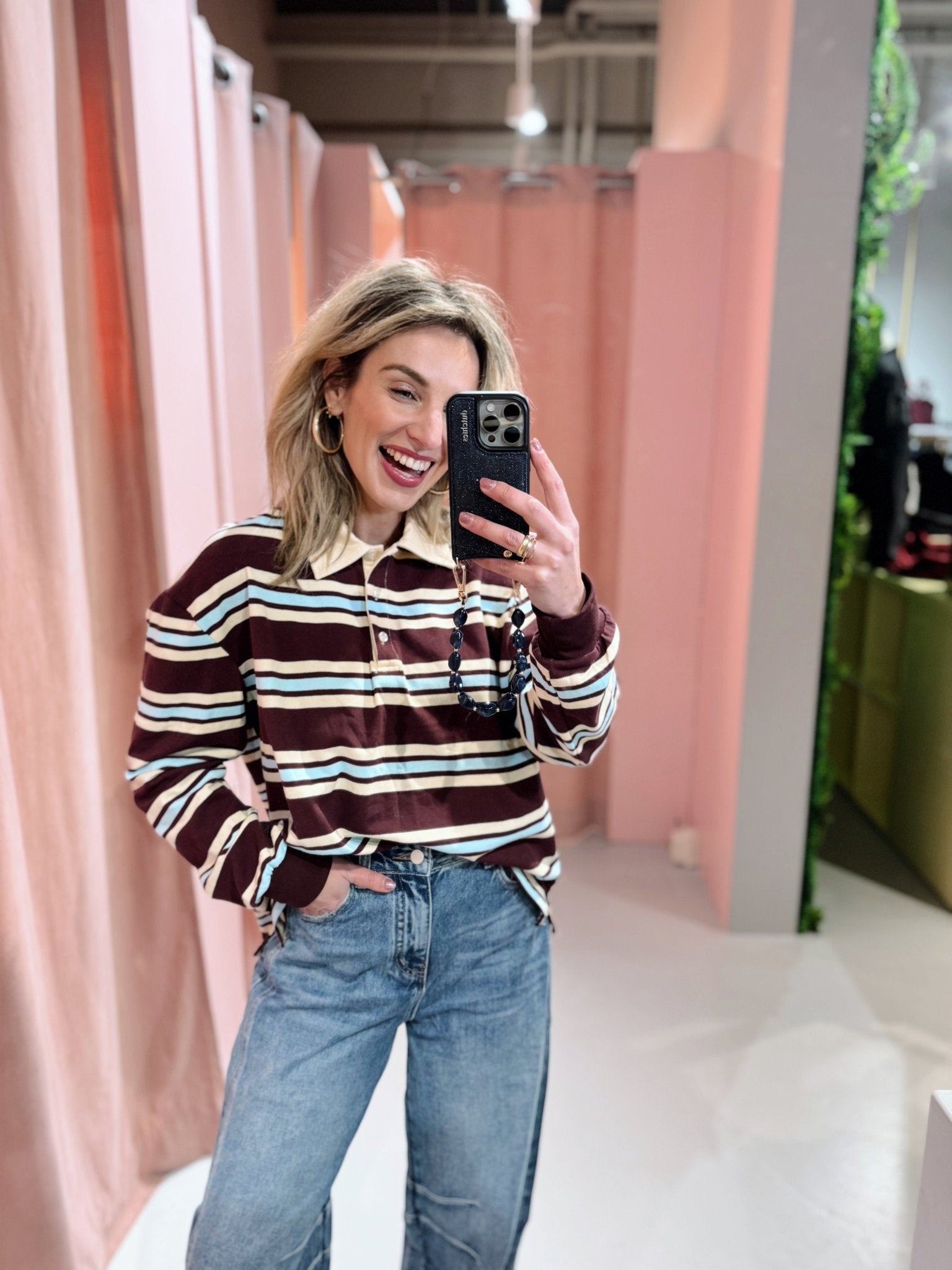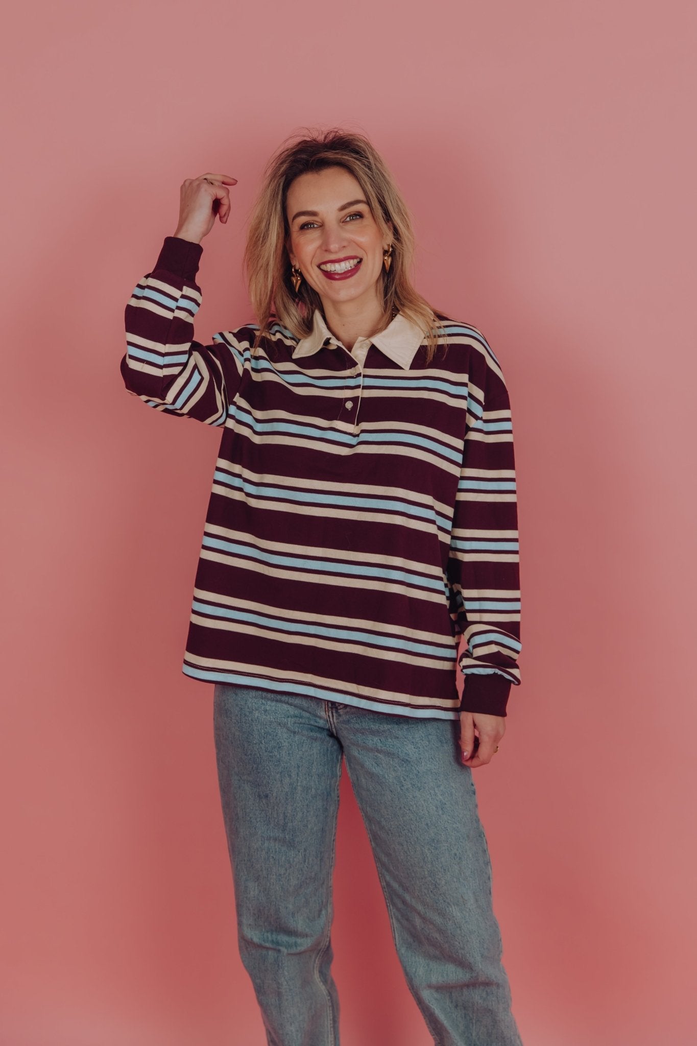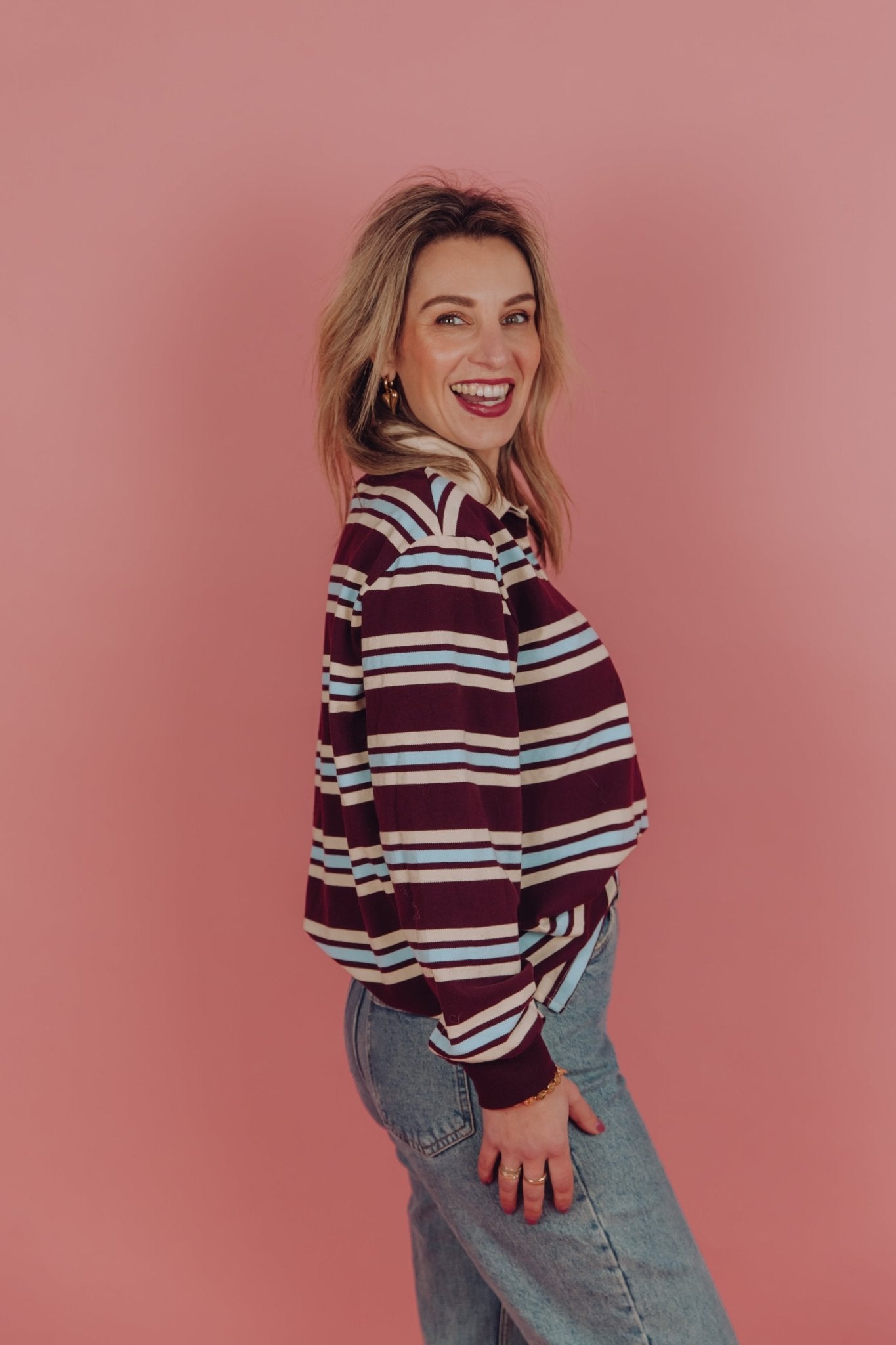 De Kyara Polo in bordeaux heeft een boxy model en een kraagje. De polo is voorzien van een blauw met bordeaux en off white streep patroon. Deze polo is perfect voor het najaar!