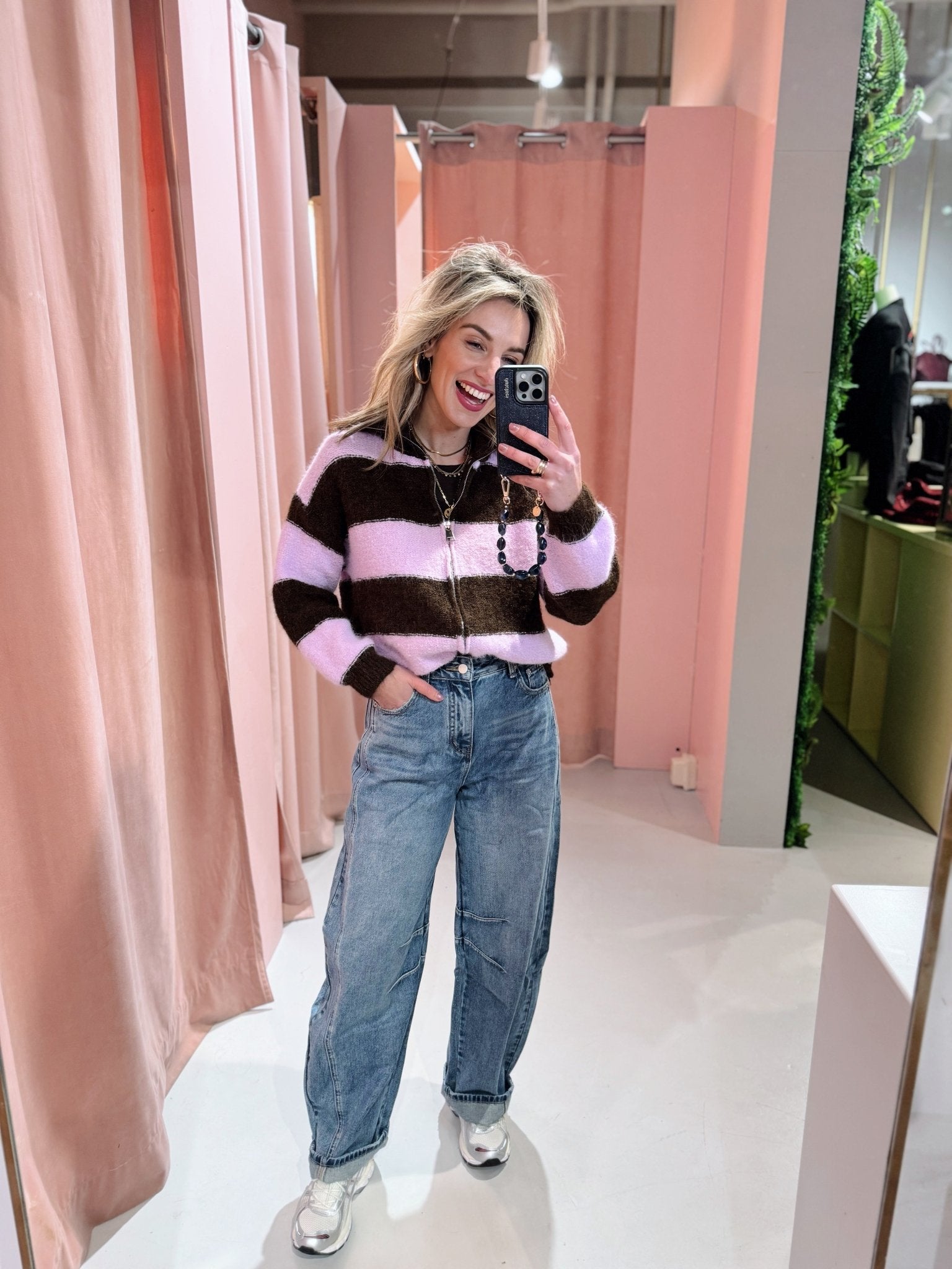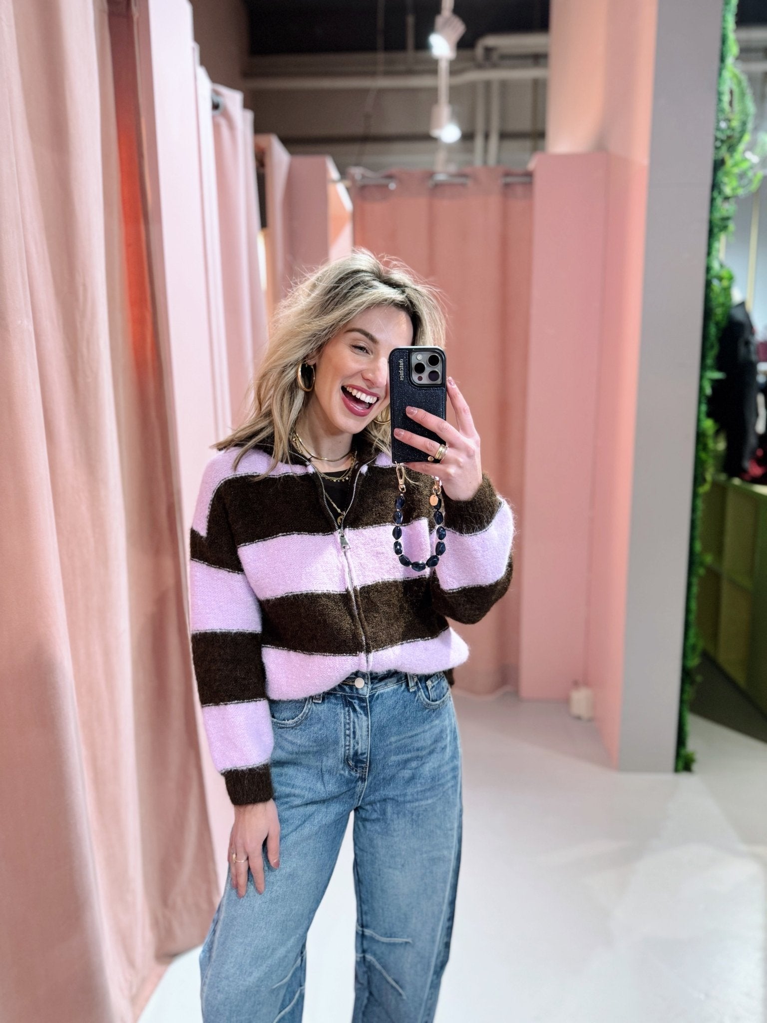 De cardigan is verkrijgbaar in een unieke bruin/roze kleurcombinatie die elke outfit een speels en eigentijds accent geeft.