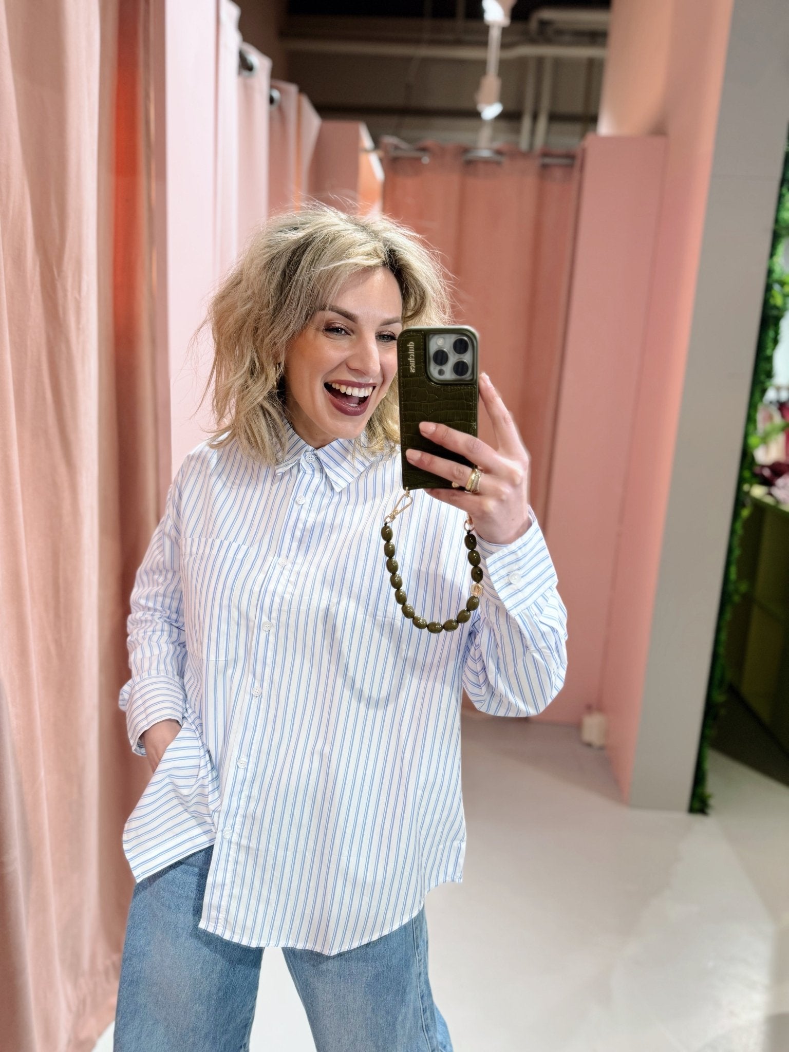 De Lara Blouse in lichtblauw is een luchtige blouse met een streep patroon. De blouse is voorzien van een kraagje en een knoopsluiting aan de voorkant. Deze blouse is perfect voor het voorjaar!