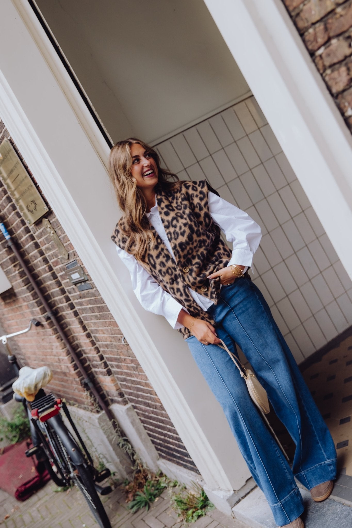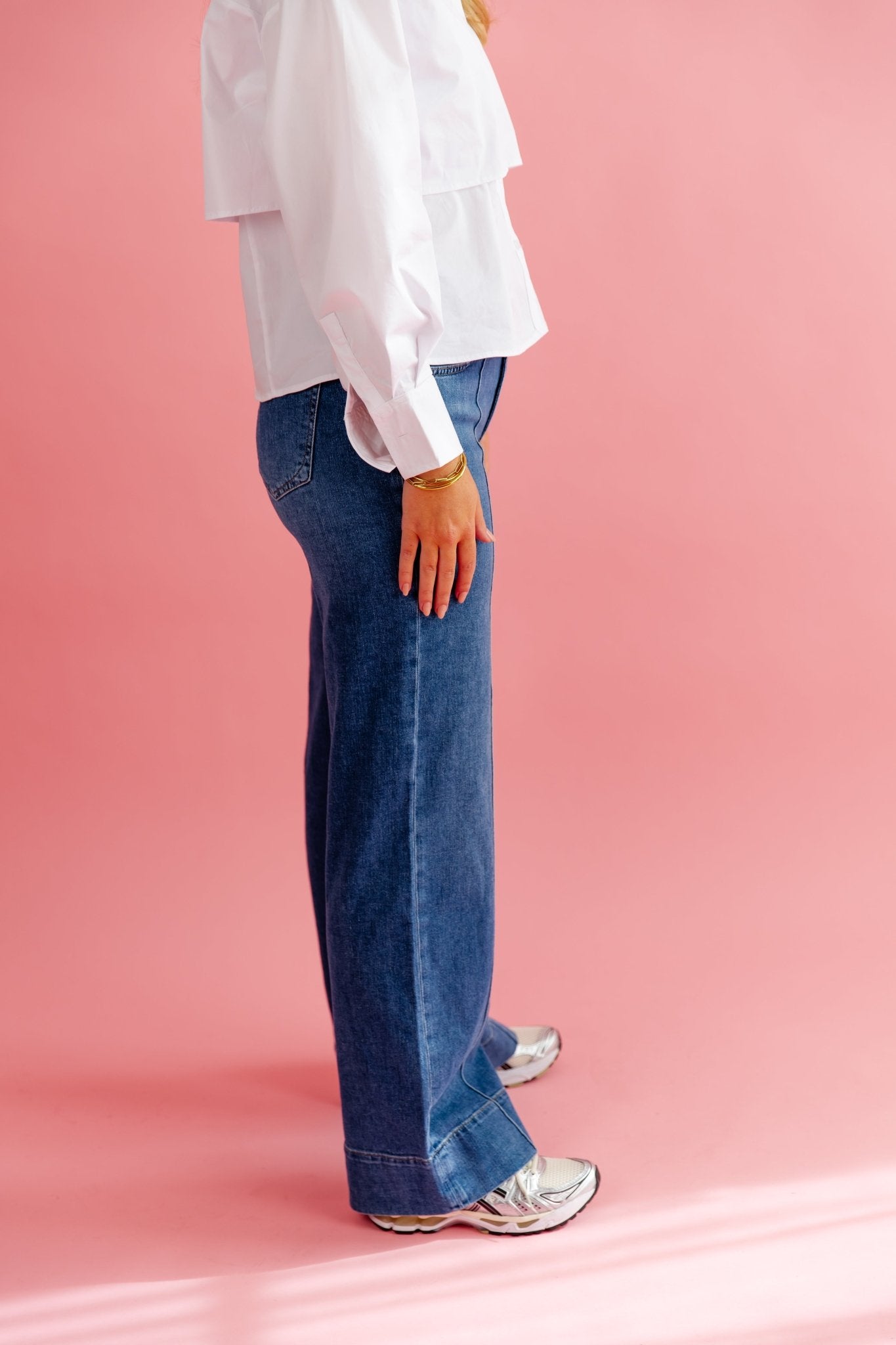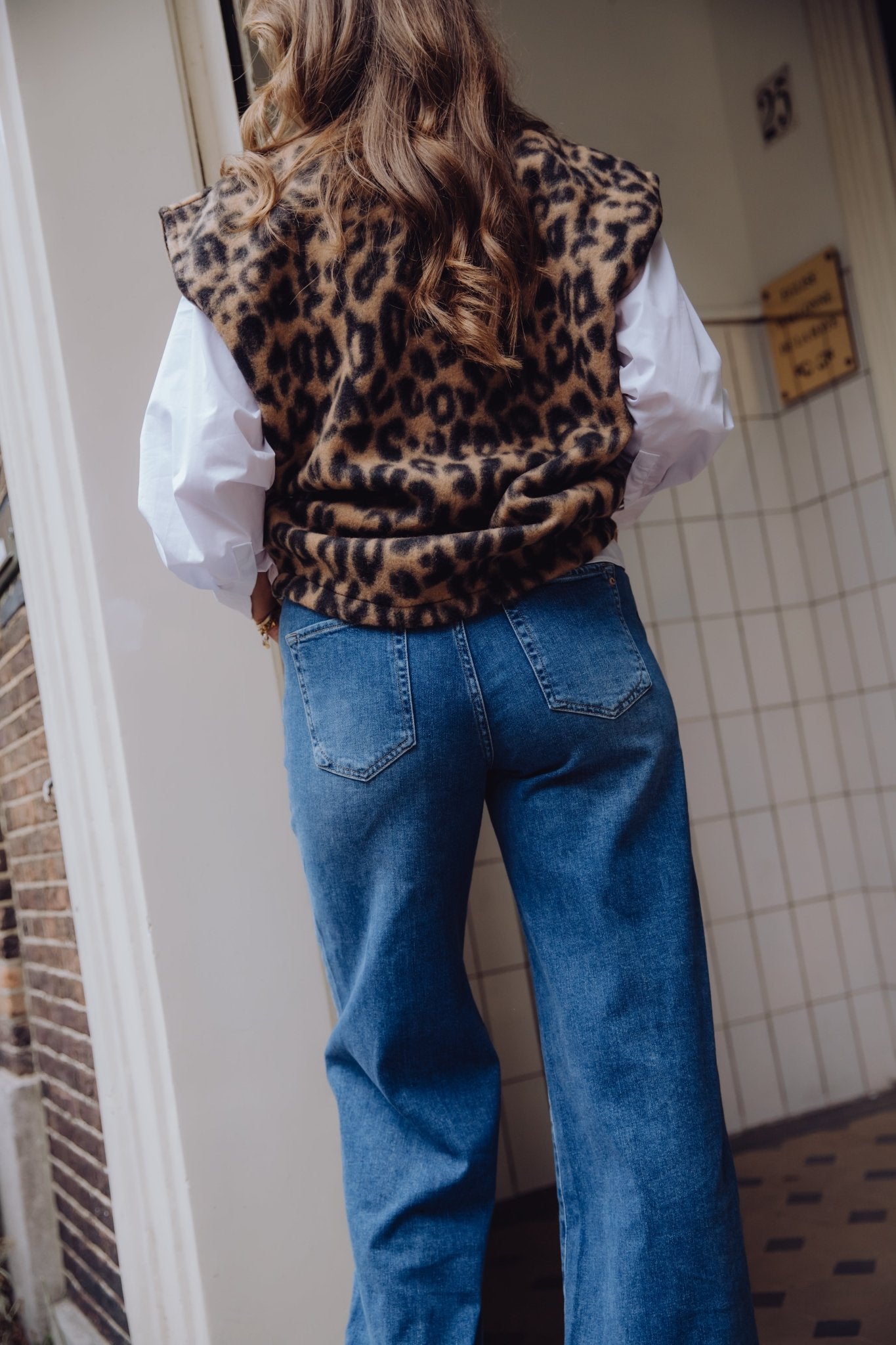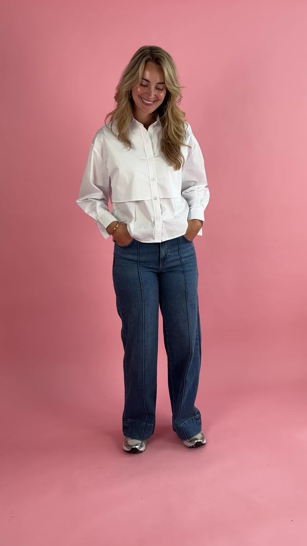 De Layla Jeans in medium blue heeft een mid waist en een wide straight fit. De broek heeft een lange lengte en is voorzien van een naad op de voorkant, wat zorgt voor een extra detail in het ontwerp. Het model heeft een klassiek 5-pocket design en is gemaakt van 99% katoen en 1% elastaan. Door deze samenstelling voelt de jeans stevig aan en biedt hij tegelijkertijd lichte stretch voor een comfortabele pasvorm.