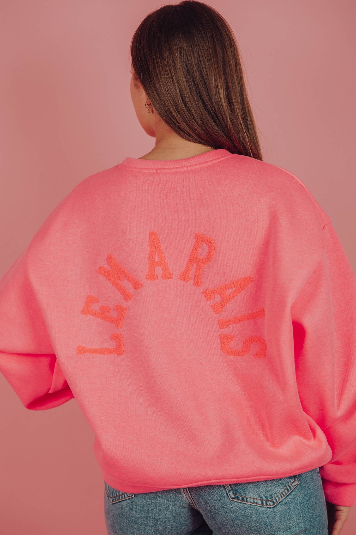 De Le Marais Sweater in neon roze is een oversized trui met lange mouwen en een ronde halslijn. De trui heeft een losse pasvorm en is voorzien van een teddy opdruk met de tekst "California" op de rug. Doordat deze sweater voorzien is van een fleece binnenkant, is hij perfect voor de koude dagen!