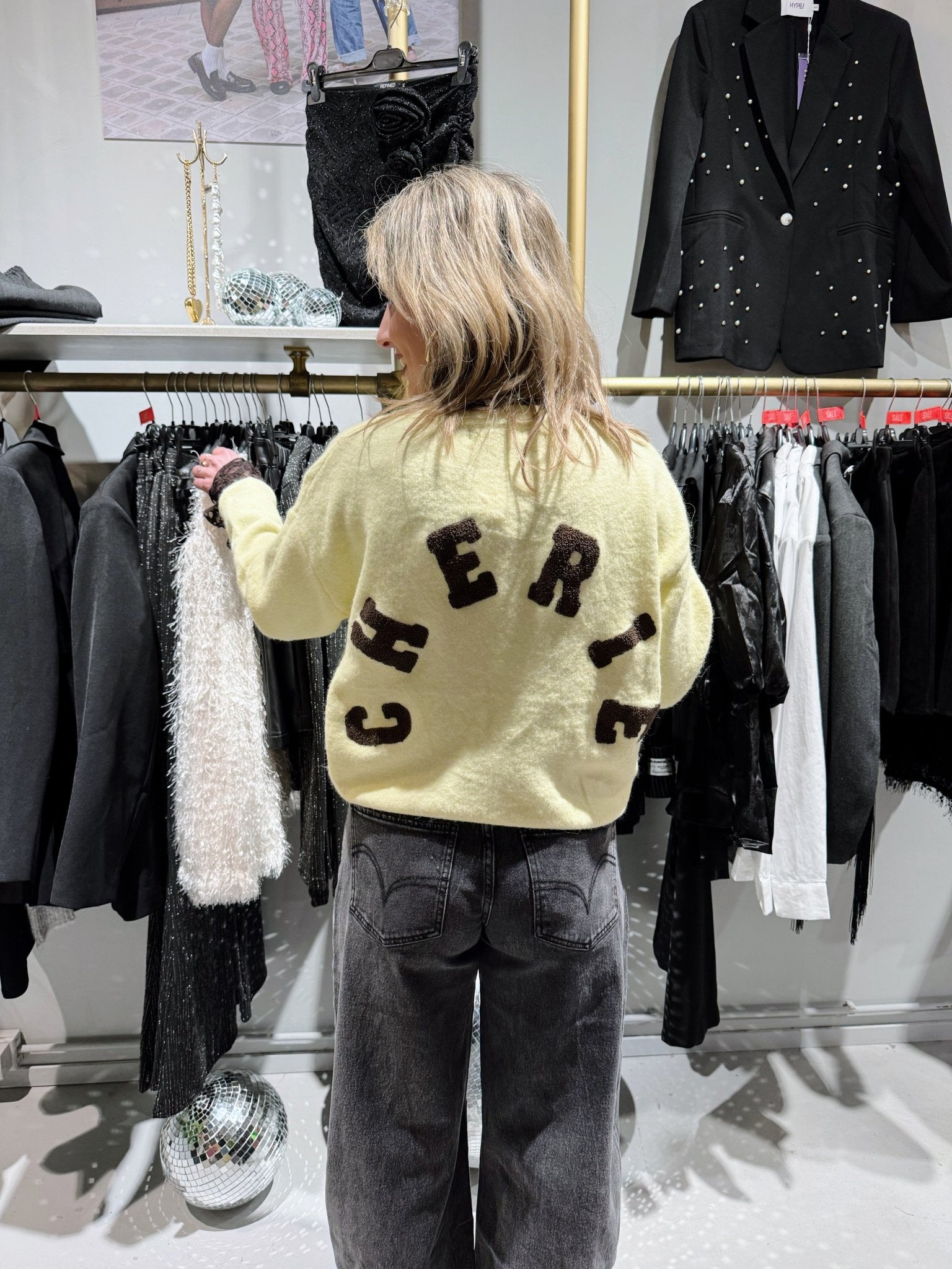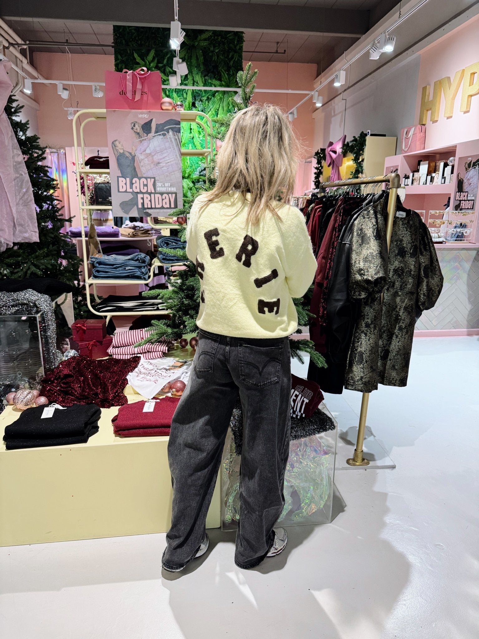 De Levi Sweater in geel is gemaakt van een gebreid materiaal, waardoor hij heerlijk warm is! De trui heeft lange mouwen en een ronde halslijn en is voorzien van een teddy opdruk op de achterkant.