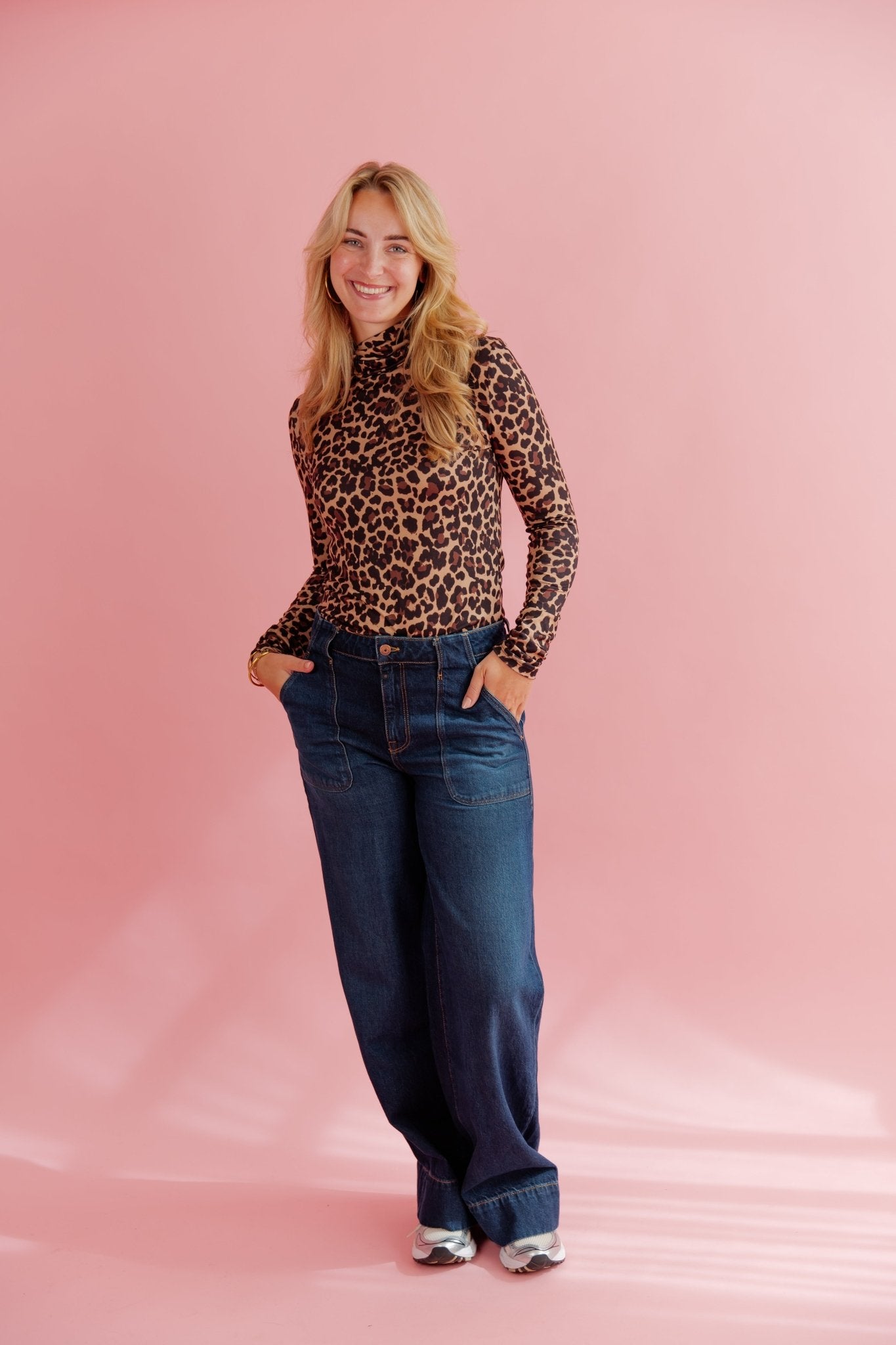 De Lili Jeans in donkerblauw heeft een hoge taille en een wide leg pasvorm. De broek heeft een lange lengte en valt ruim langs de benen. Aan de voorkant is het model voorzien van patch pockets, wat zorgt voor een stoer en praktisch detail. De jeans is gemaakt van 100% katoen, waardoor de stof stevig is en zijn vorm goed behoudt.