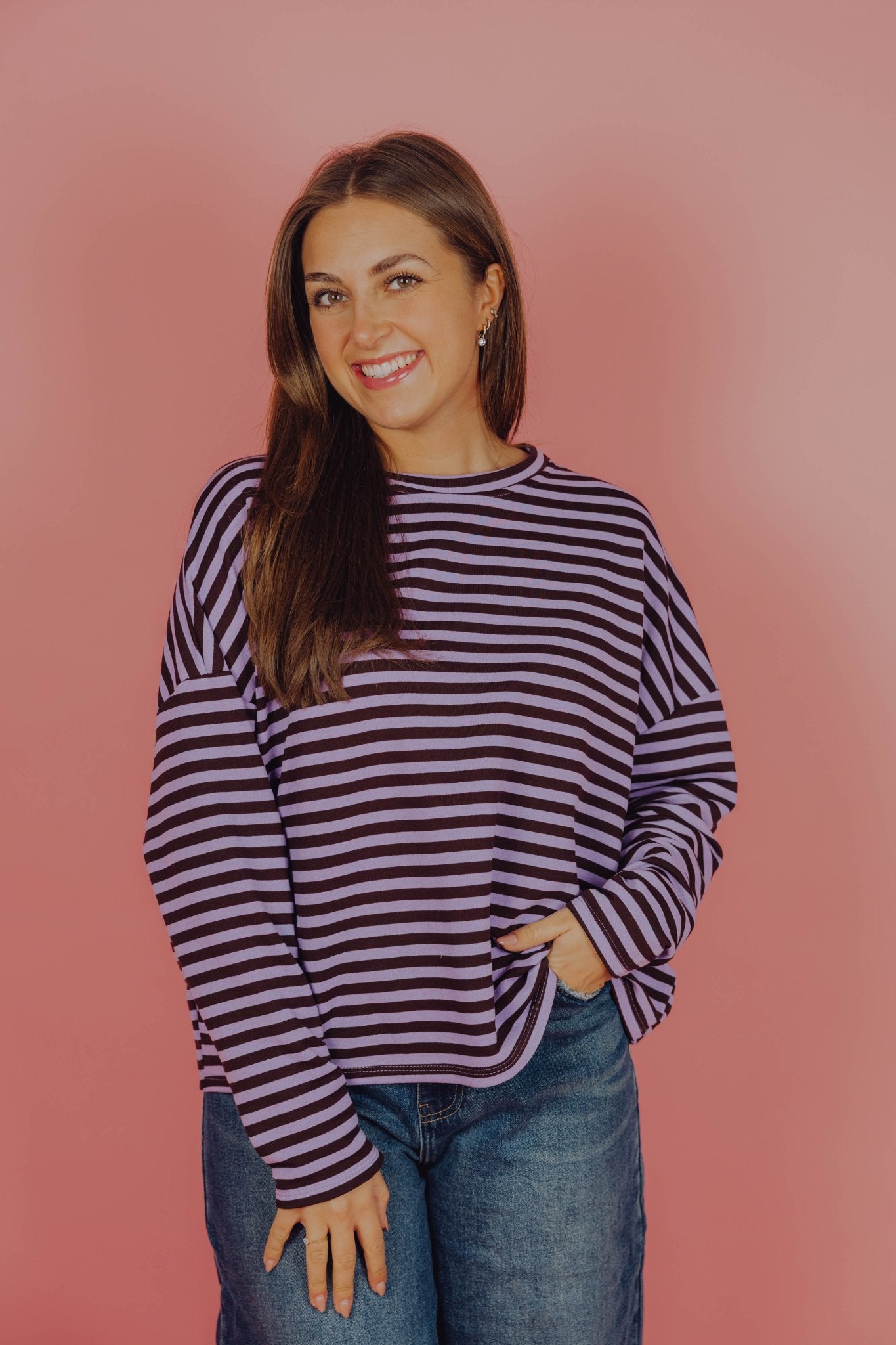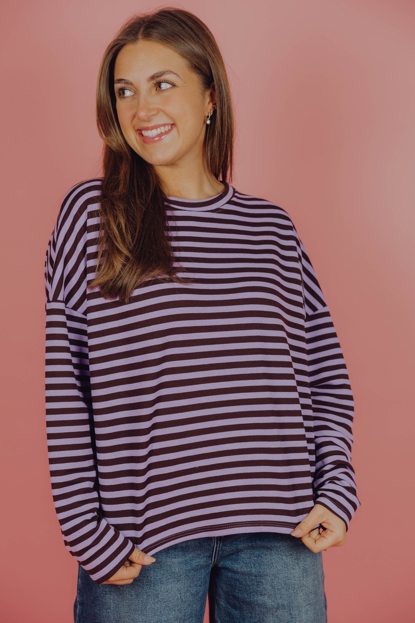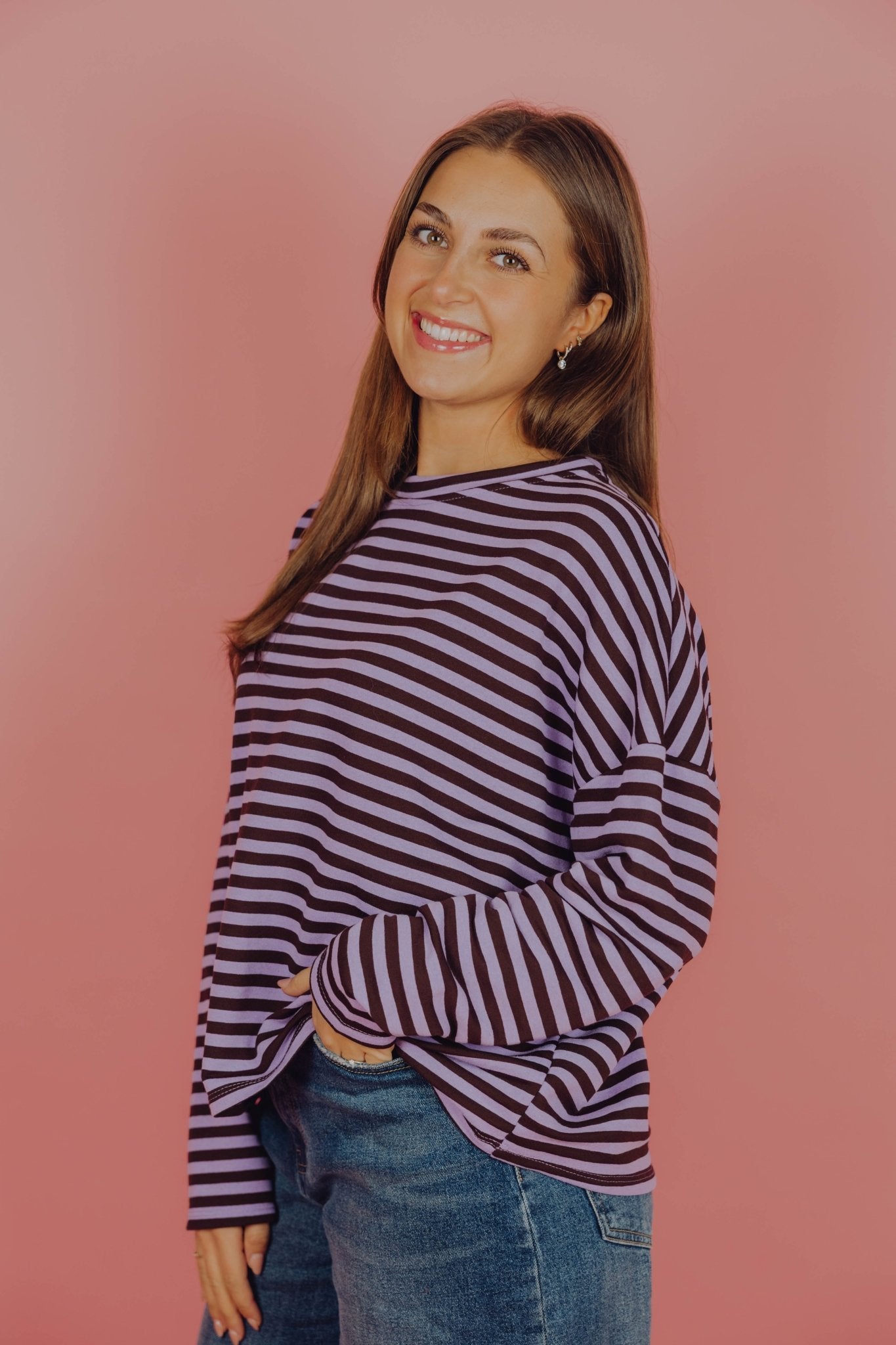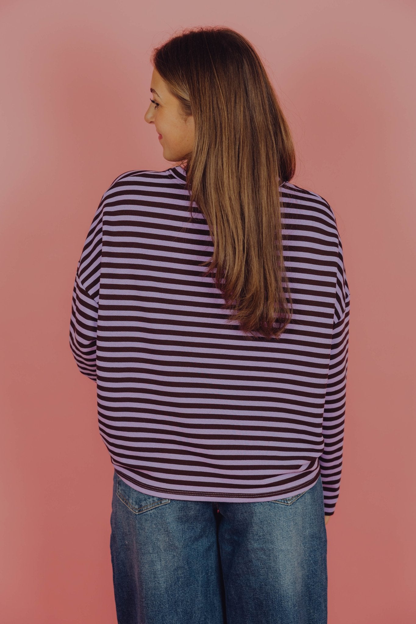 De Lisa Longsleeve in paars met bruin is een top met een iets wijder model. De top is gemaakt van een stretchy stof, heeft lange mouwen met een hoge, ronde halslijn en een streep patroon. Deze lange mouwen top is perfect om laagjes mee te creëren in het najaar.