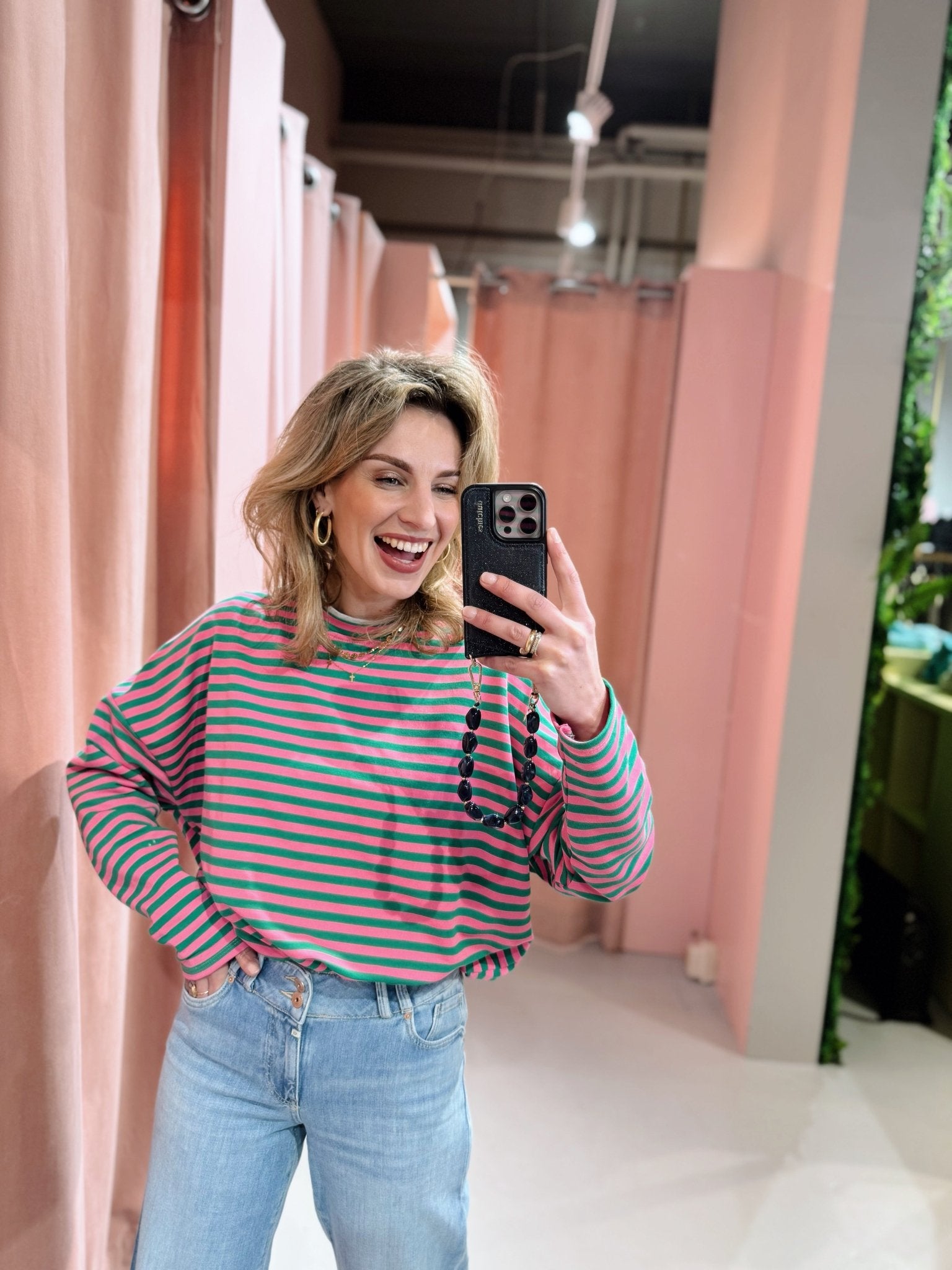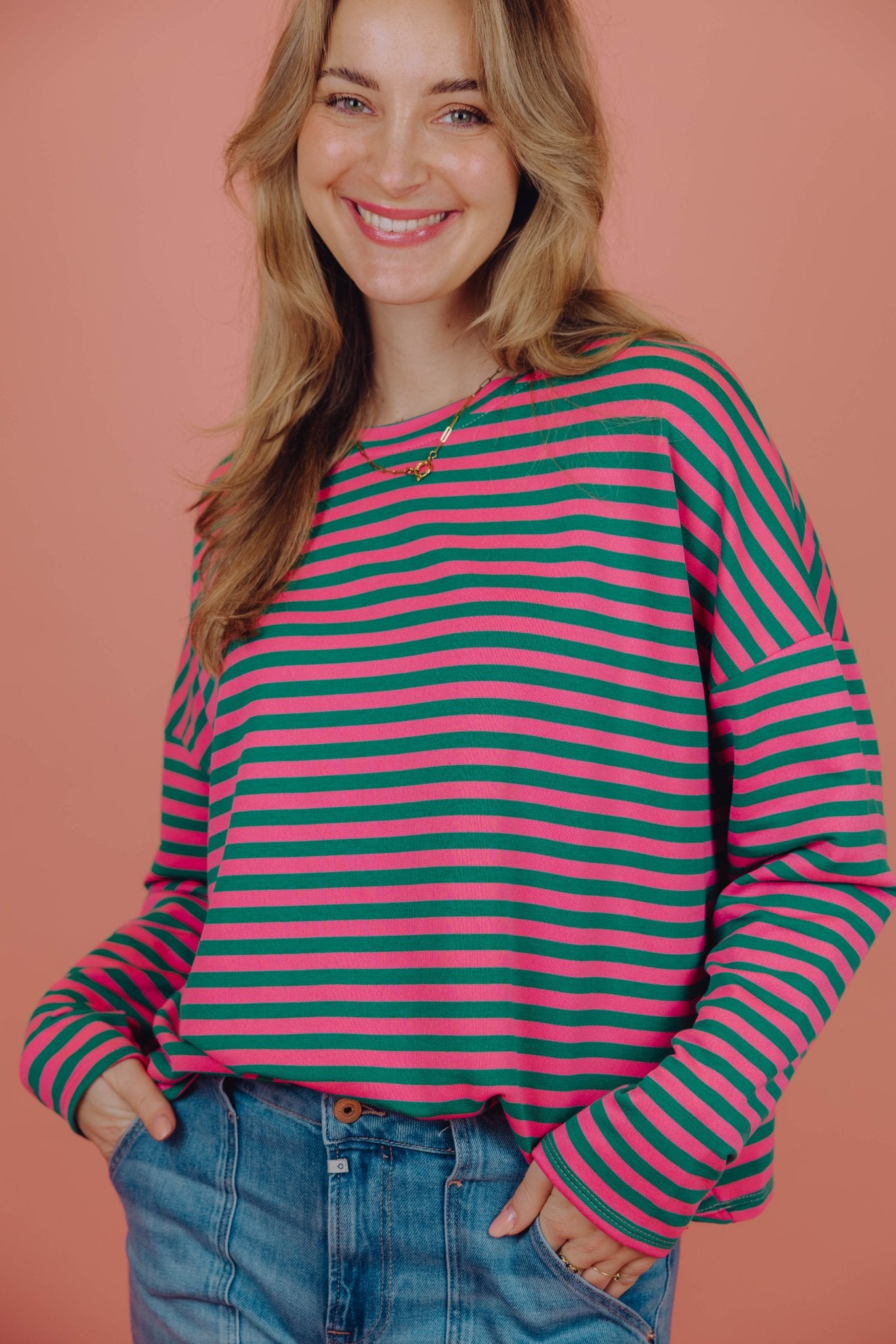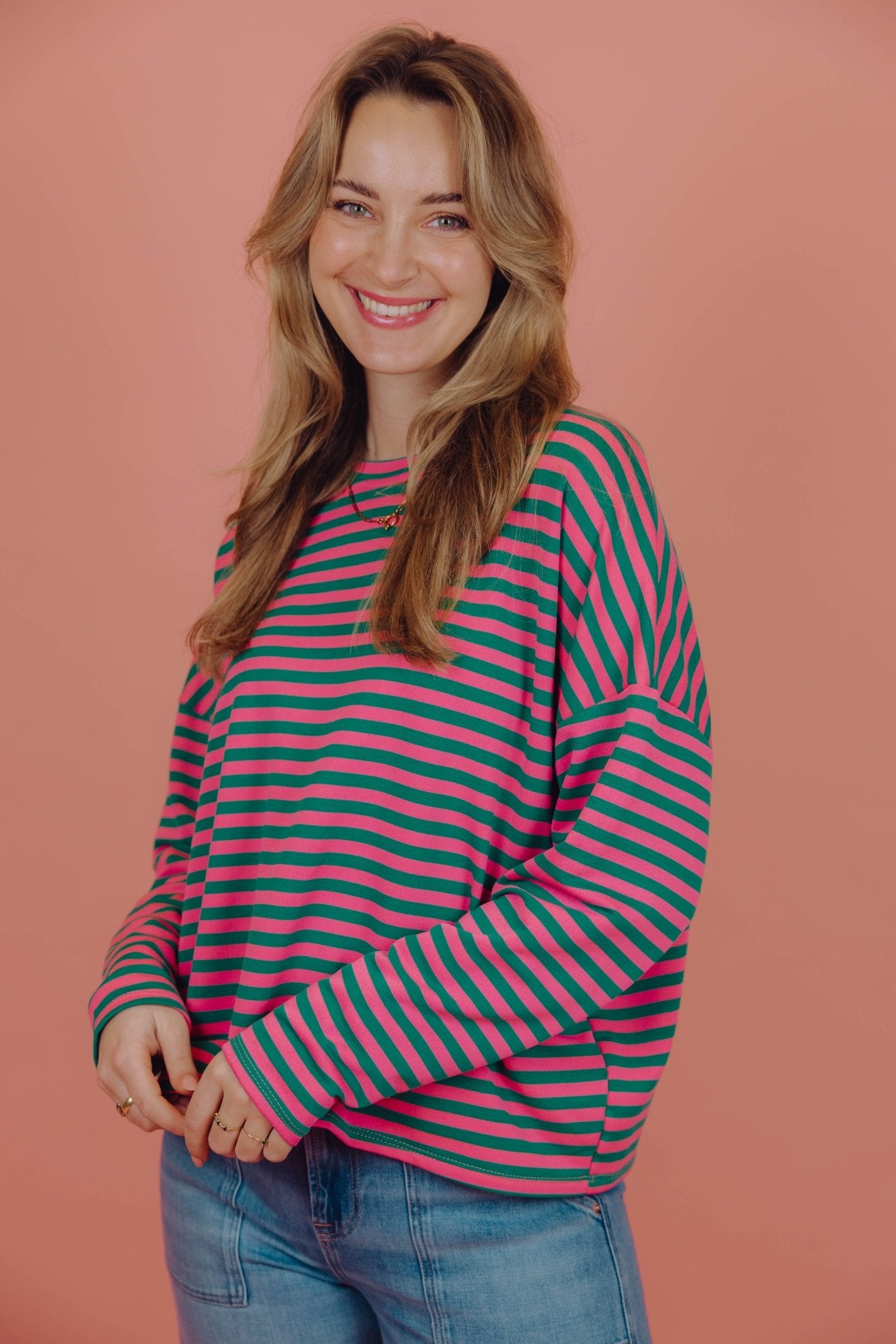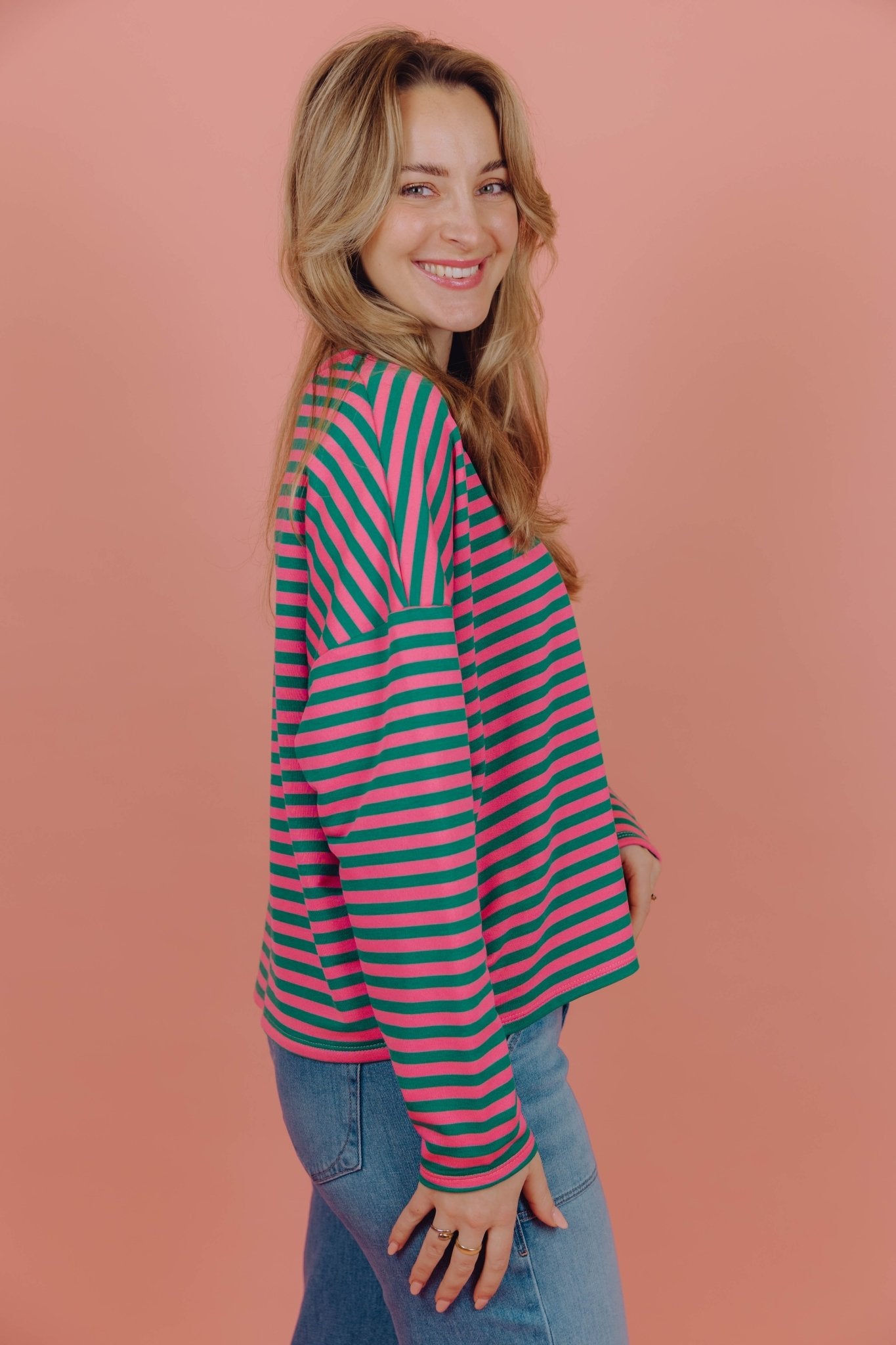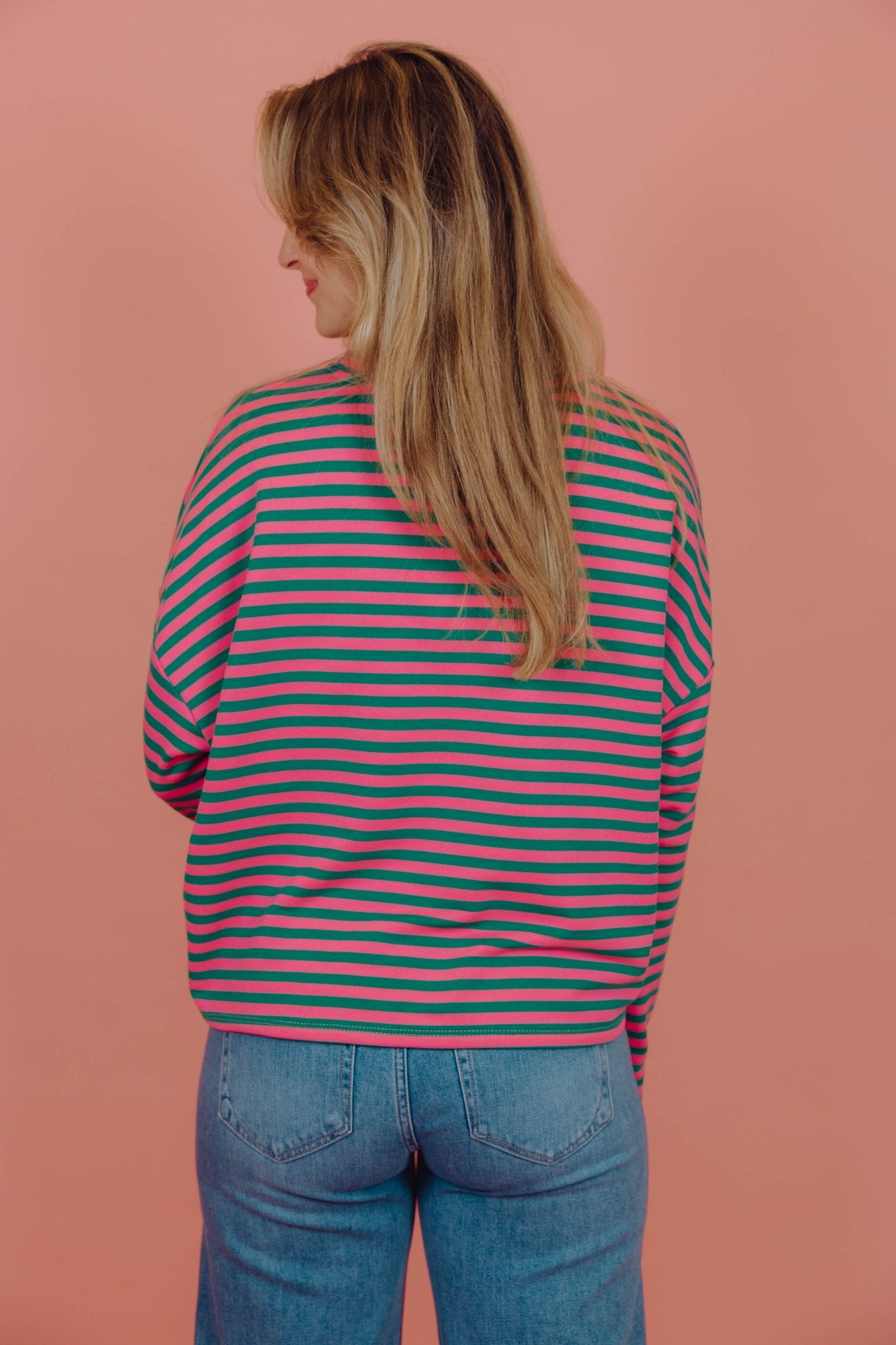 De Lisa Longsleeve in zeegroen met roze is een top met een iets wijder model. De top is gemaakt van een stretchy stof, heeft lange mouwen met een hoge, ronde halslijn en een streep patroon. Deze lange mouwen top is perfect om laagjes mee te creëren in het najaar.