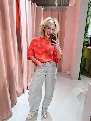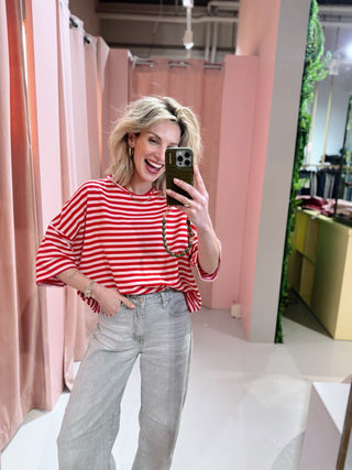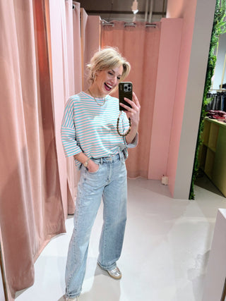 De Lisa SS Tee in lichtblauw met rood is een top met een iets wijder model. De top is gemaakt van een stretchy stof, heeft korte mouwen met een hoge, ronde halslijn en een streep patroon. Deze korte mouwen top is perfect voor het komende seizoen!