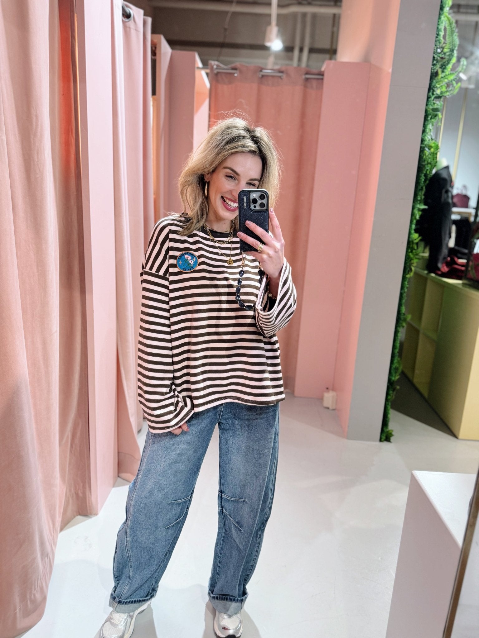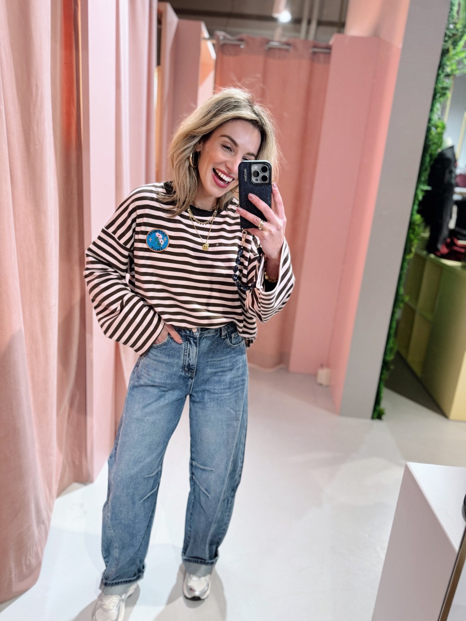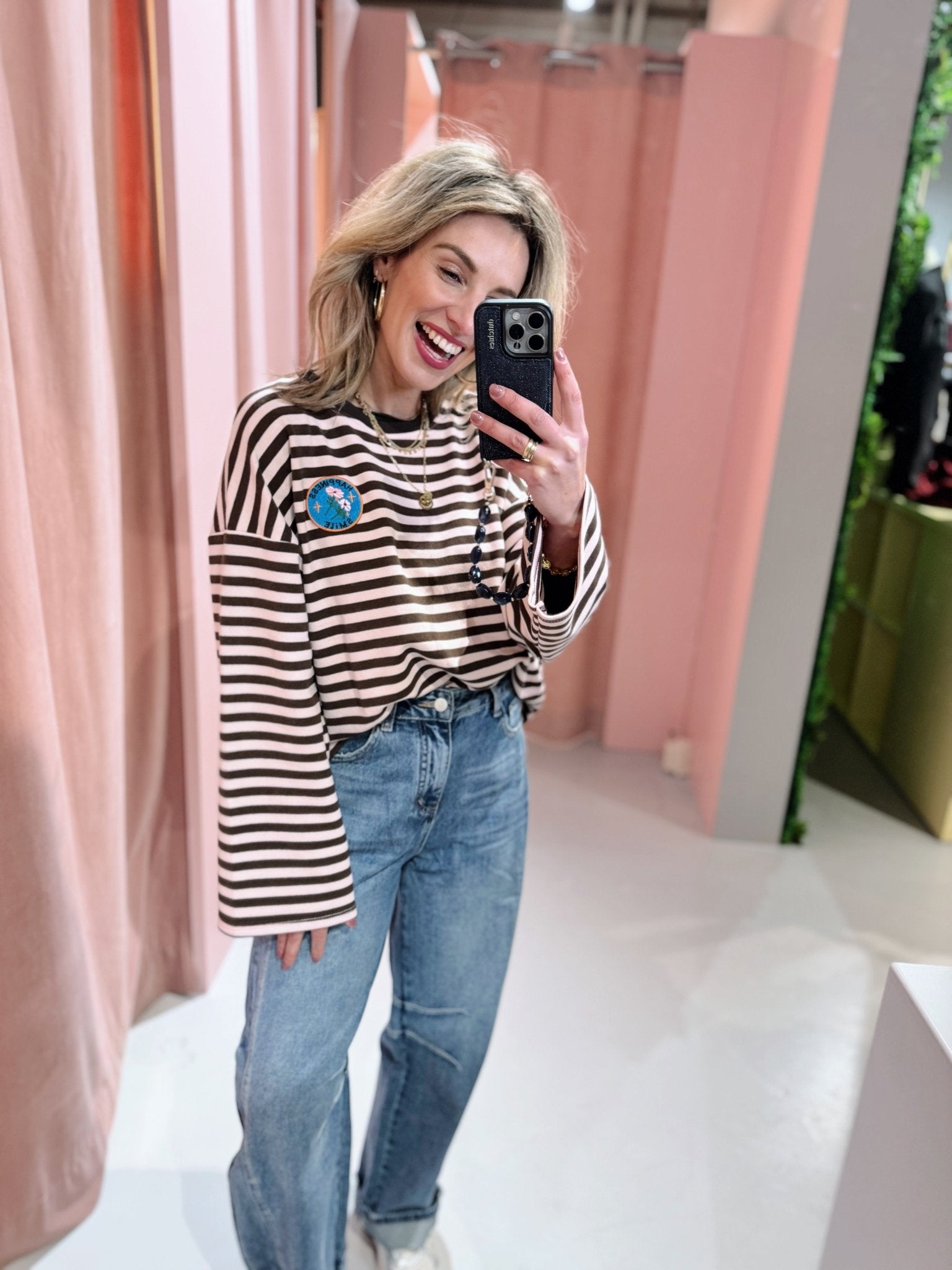 De Longsleeve Lise is de perfecte basic met een vleugje vrolijkheid. Deze longsleeve heeft een oversized fit, waardoor hij comfortabel en ruim valt. De wijde mouwen geven het ontwerp een speelse, trendy look. Op de borst vind je een subtiele ‘Happiness Smile’ badge, die de top nét dat beetje extra karakter geeft.