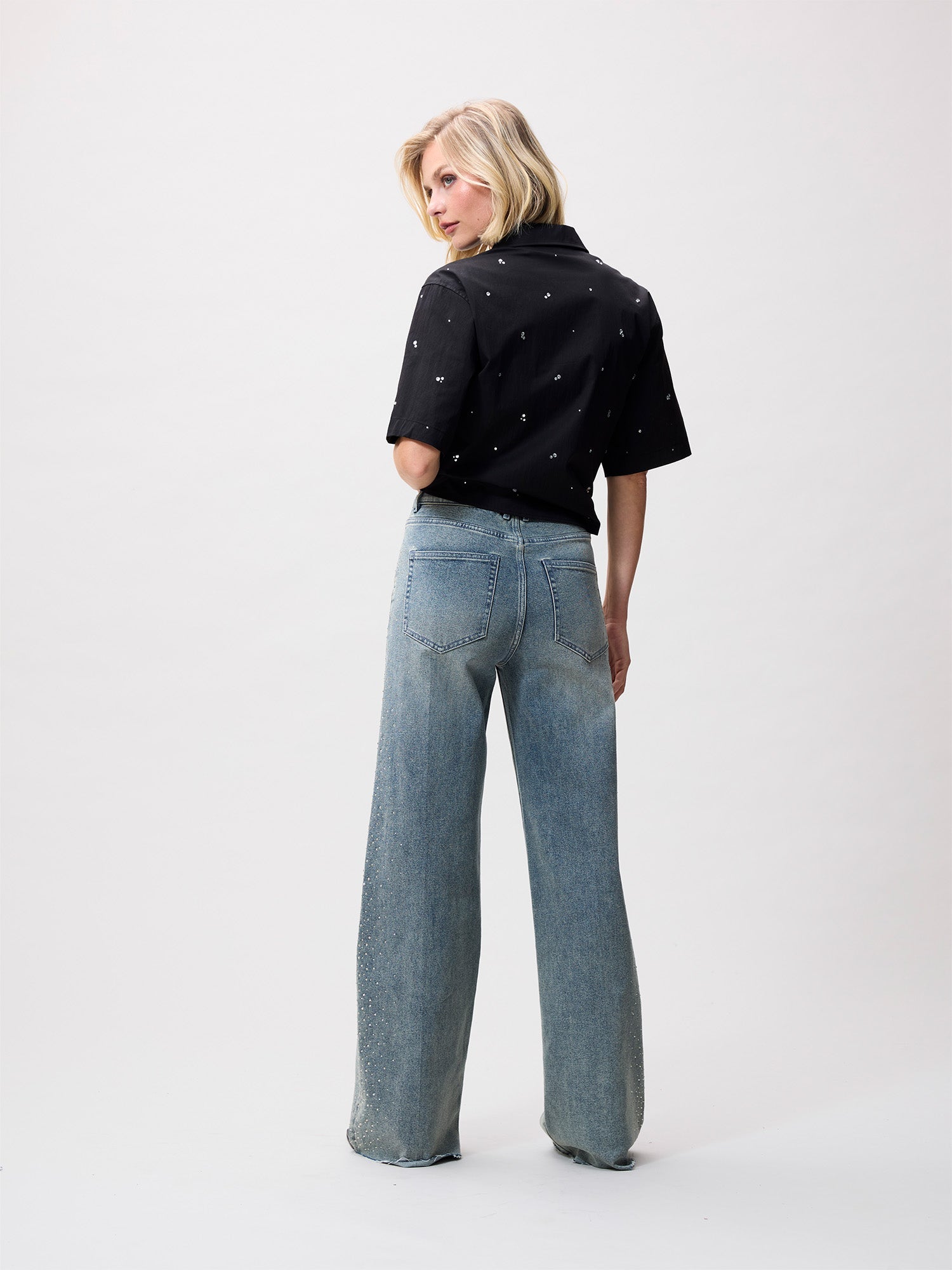 De Loose Fit Jeans Strass van Catwalk Junkie heeft een mid rise taille en een loose fit pasvorm met wijde pijpen. De denim met wassing is afgewerkt met strass steentjes langs de zijkant, wat de jeans een luxe, opvallende look geeft. Gemaakt van deels gerecycled katoen met een vleugje stretch voor extra draagcomfort.