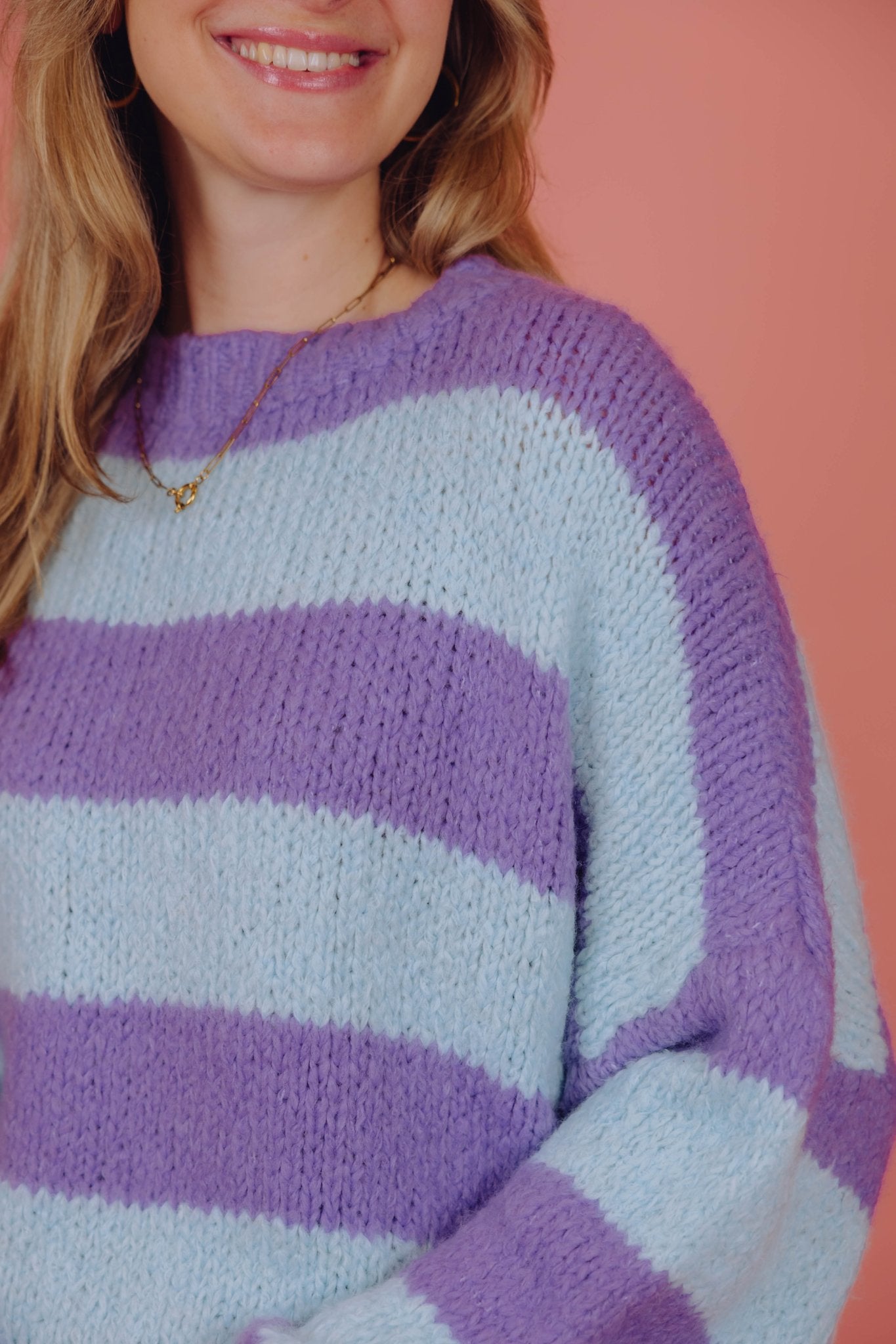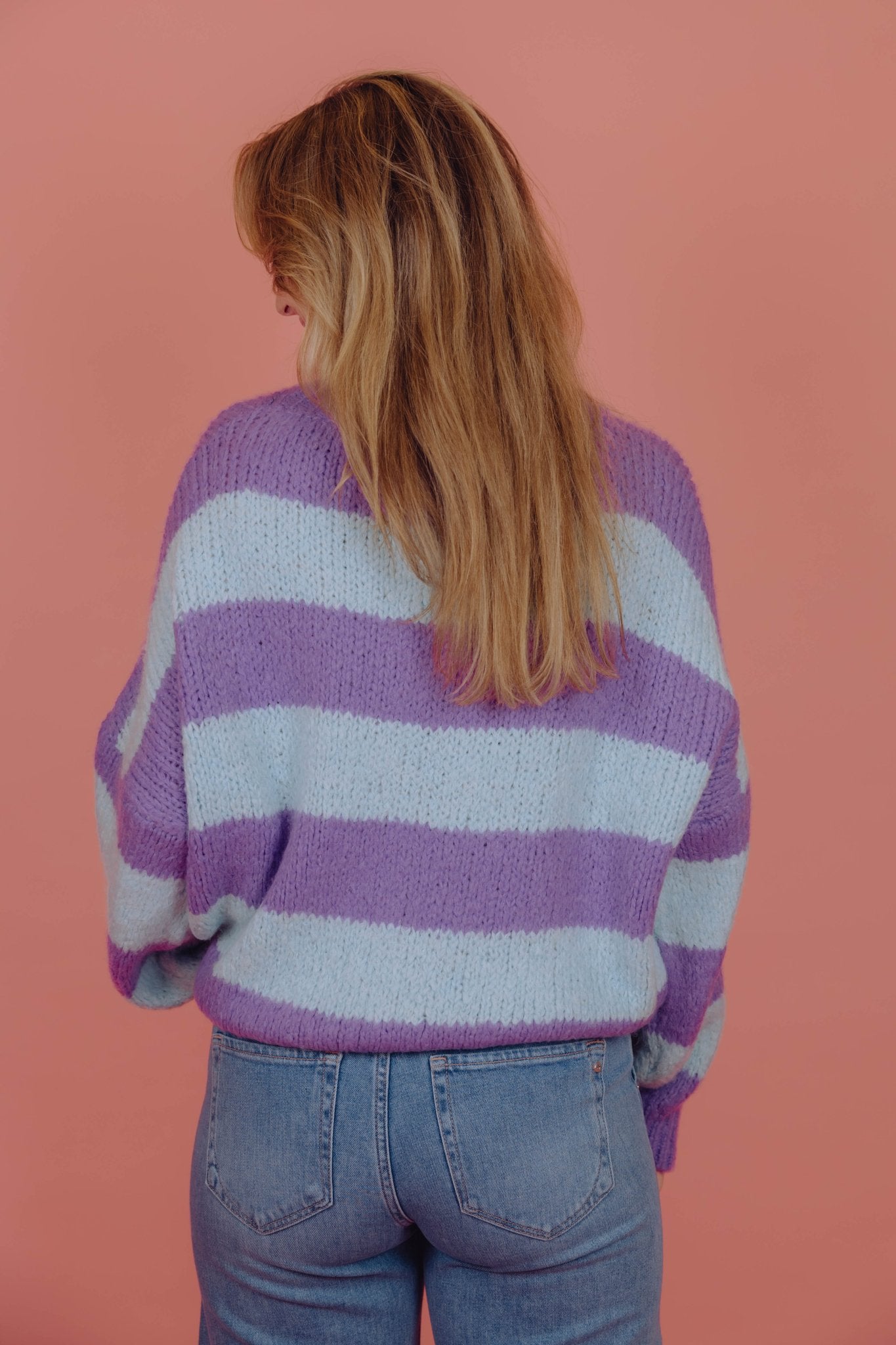 De Lova Knit in paars/turquoise is gemaakt van een gebreid materiaal, waardoor hij heerlijk warm is! De trui heeft een ronde halslijn en is voorzien van een streep patroon.