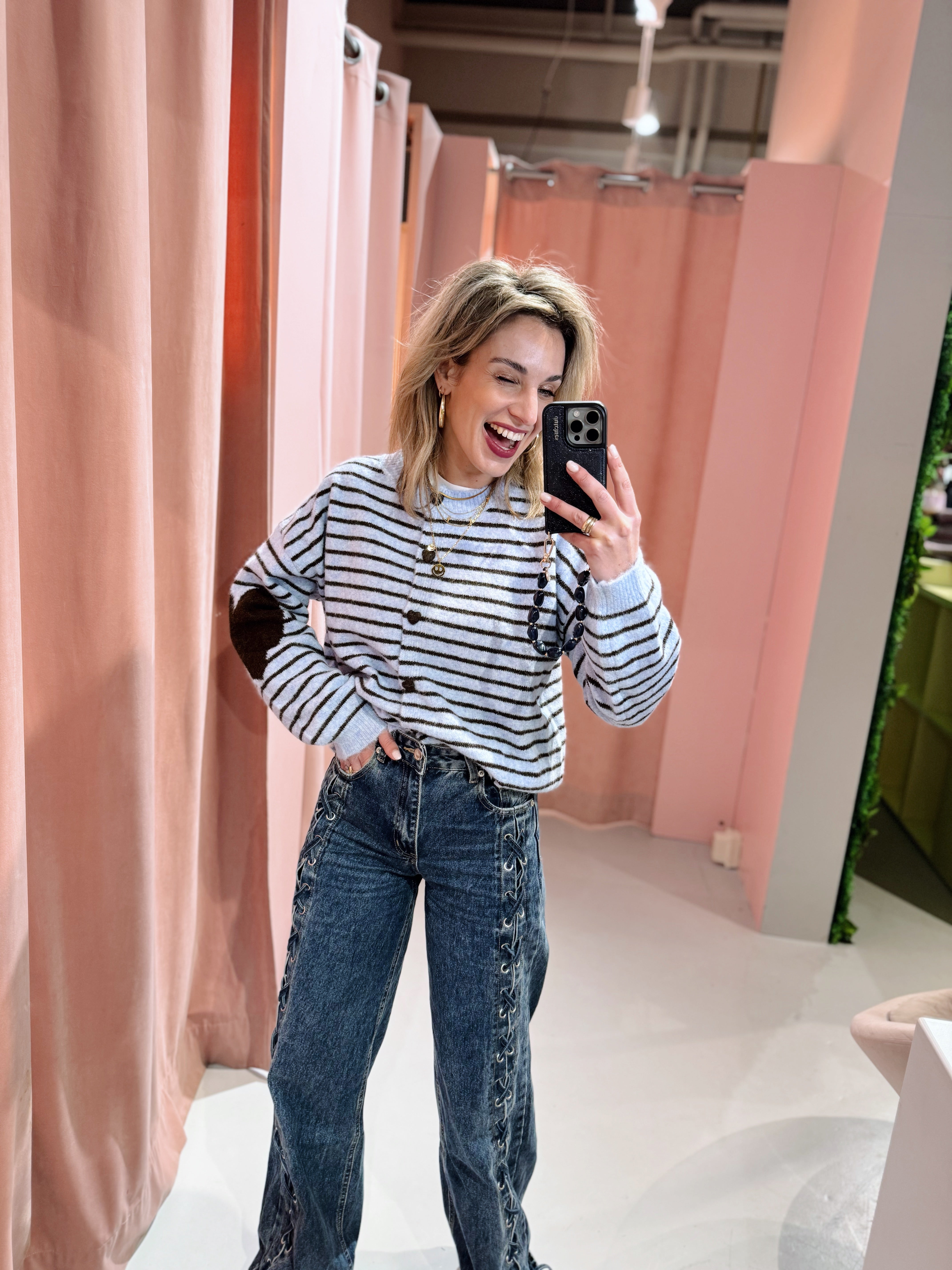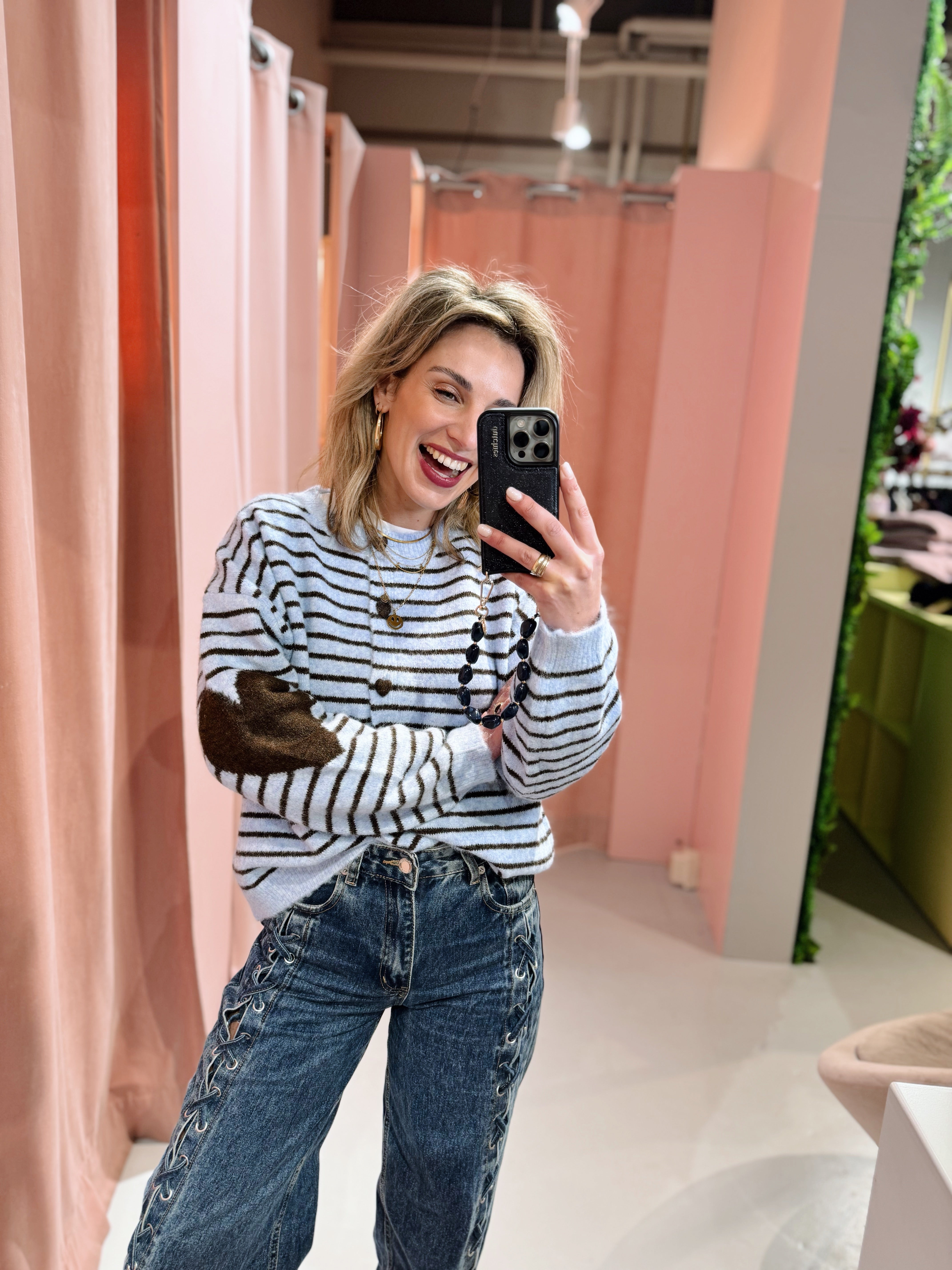 De Love Cardigan in blauw met bruine streepjes heeft een boxy fit en is gemaakt van een zachte, gebreide stof die heerlijk warm aanvoelt. Het vest heeft lange mouwen, een ronde halslijn en is afgewerkt met hartjes knoopjes aan de voorkant. Extra leuk zijn de hartvormige details op de ellebogen, die zorgen voor een speelse en opvallende touch.