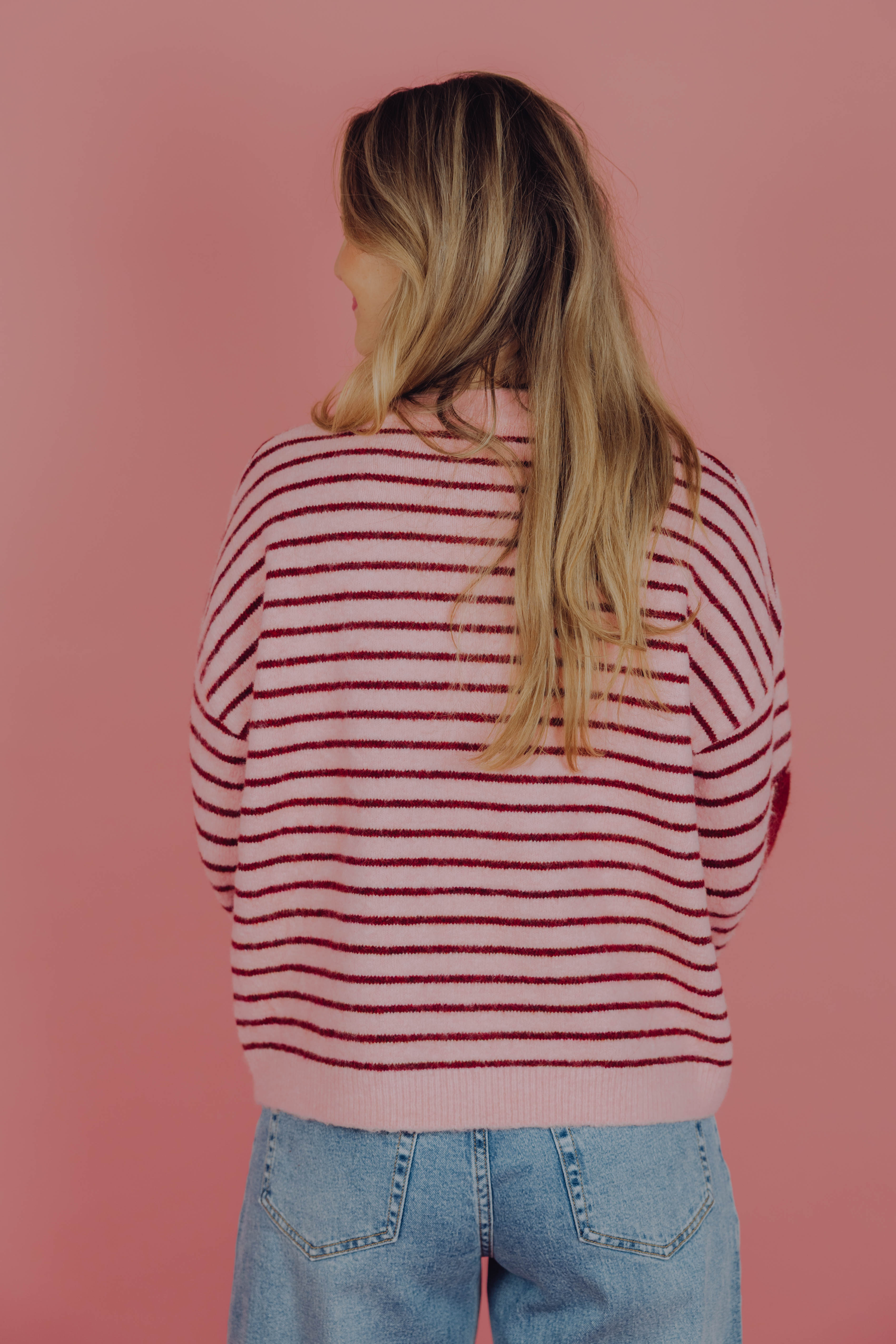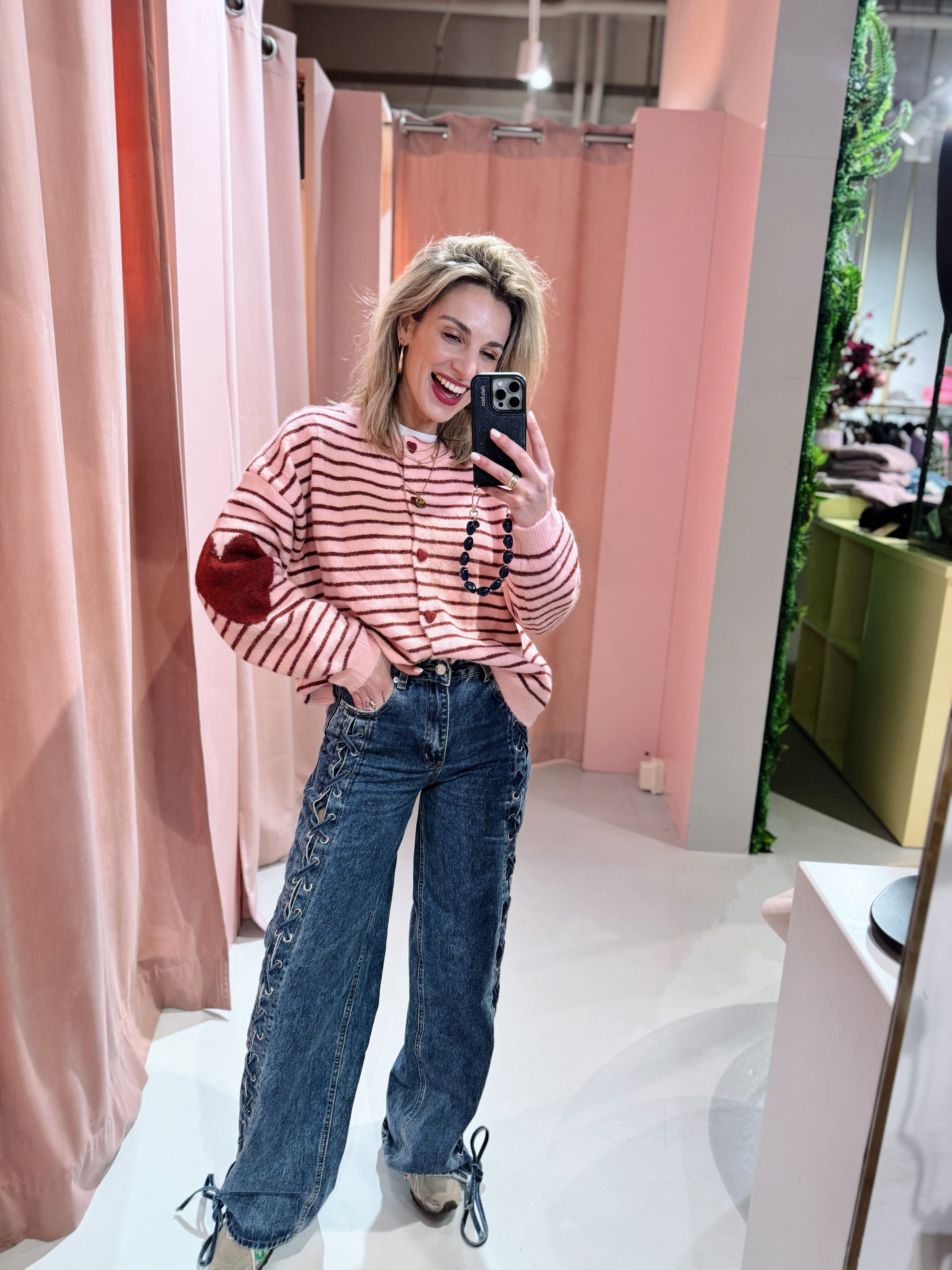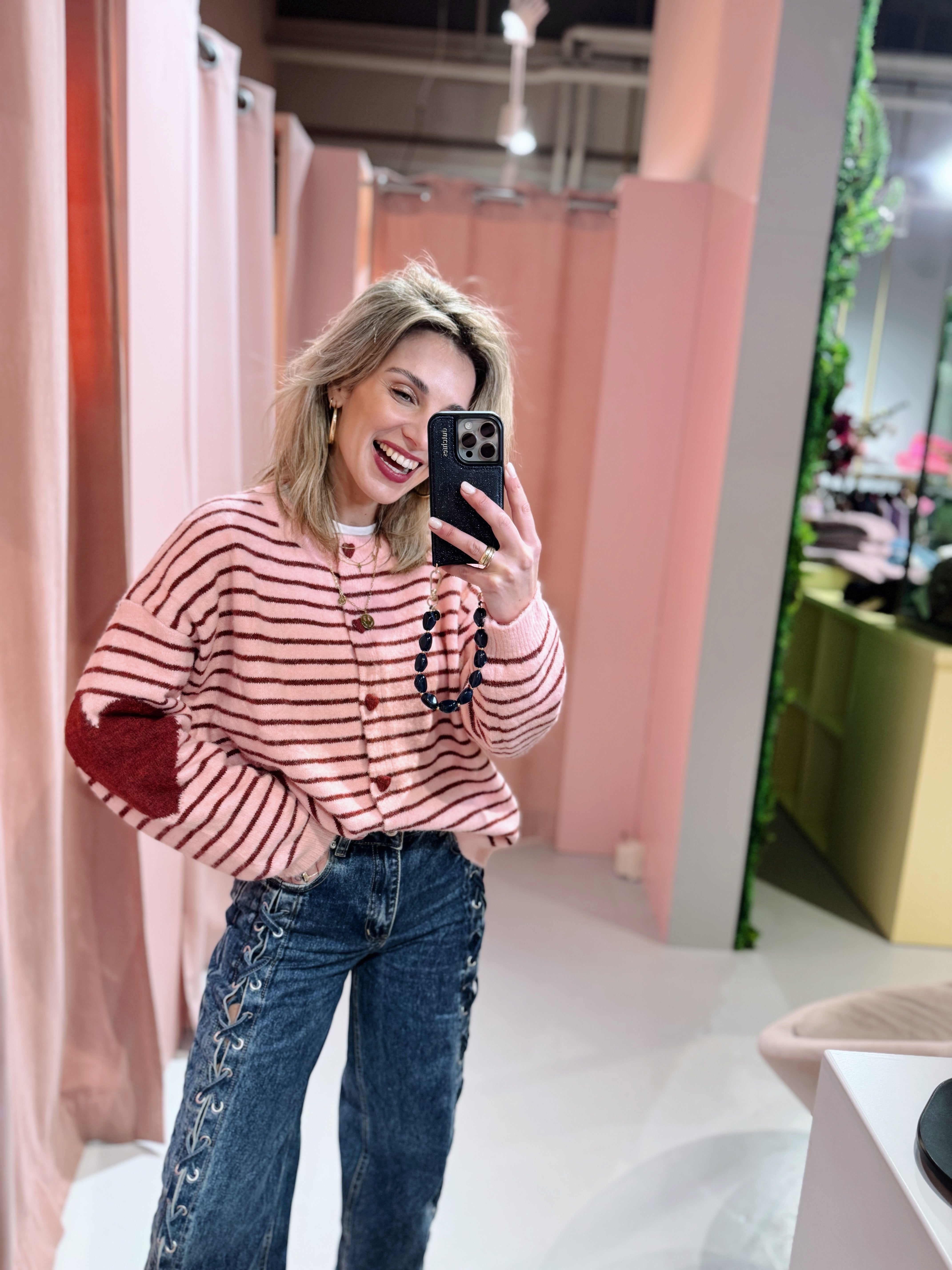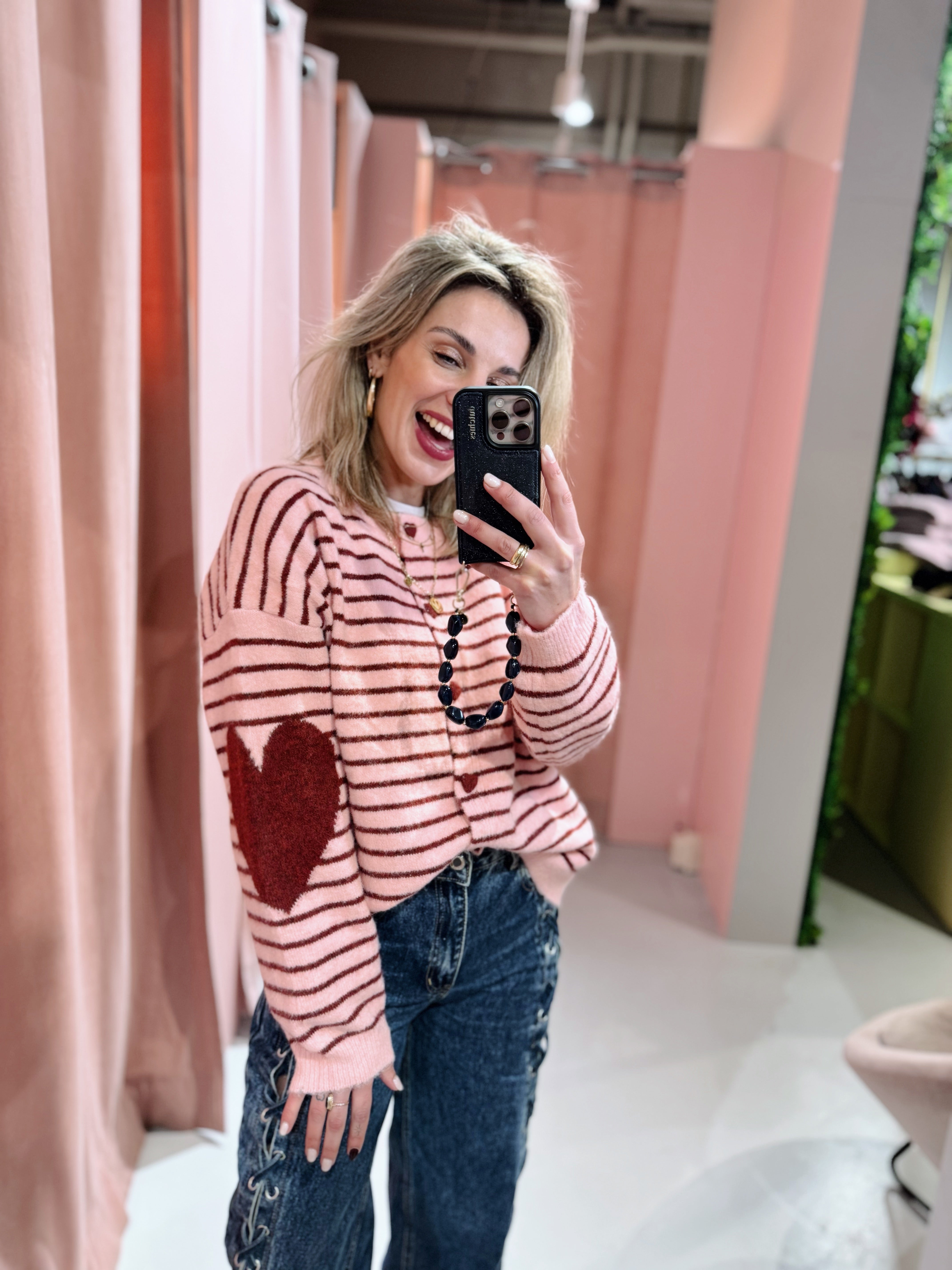De Love Cardigan in roze met bordeaux streepjes heeft een boxy fit en is gemaakt van een zachte, gebreide stof die heerlijk warm aanvoelt. Het vest heeft lange mouwen, een ronde halslijn en is afgewerkt met hartjes knoopjes aan de voorkant. Extra leuk zijn de hartvormige details op de ellebogen, die zorgen voor een speelse en opvallende touch.