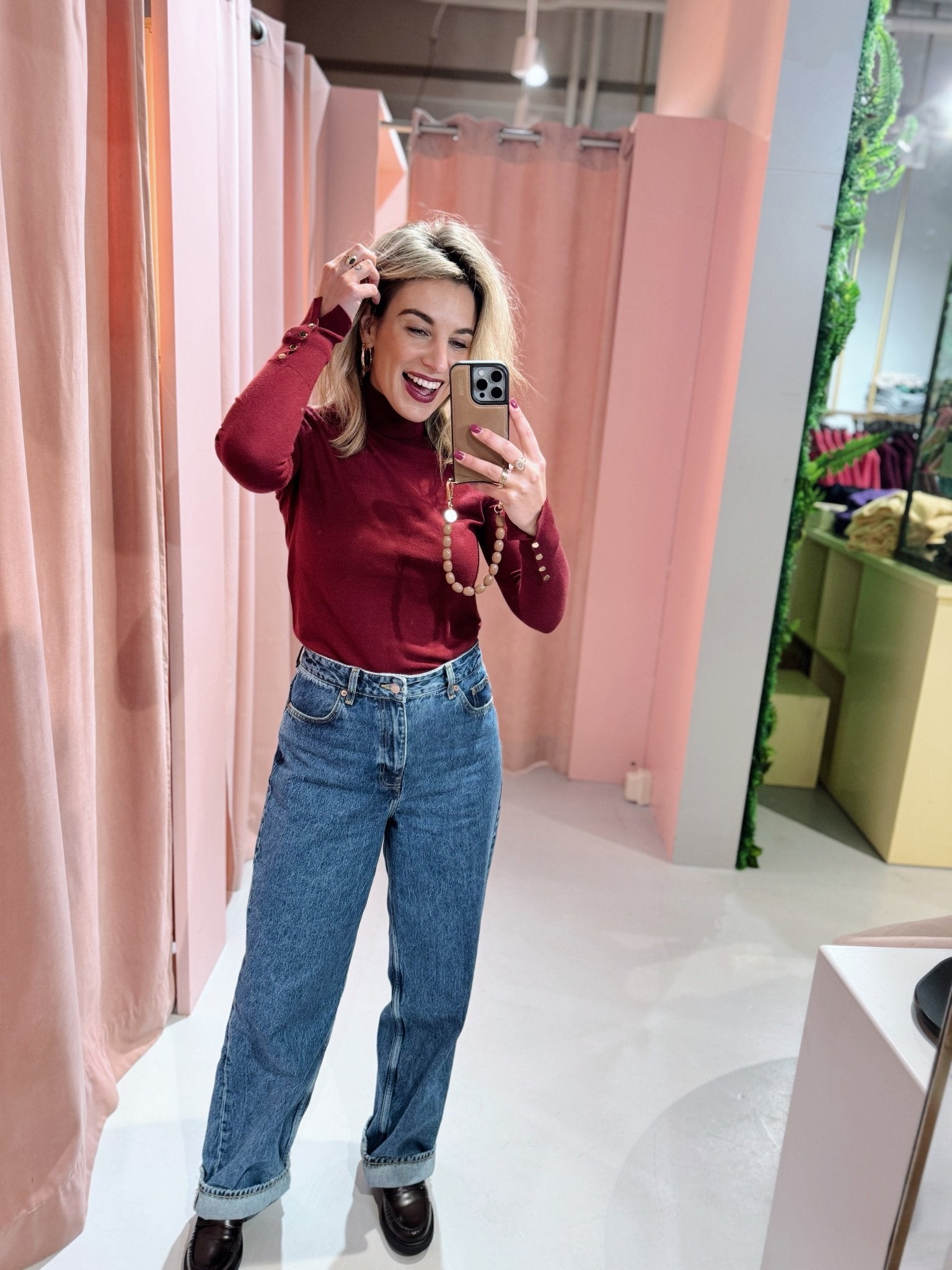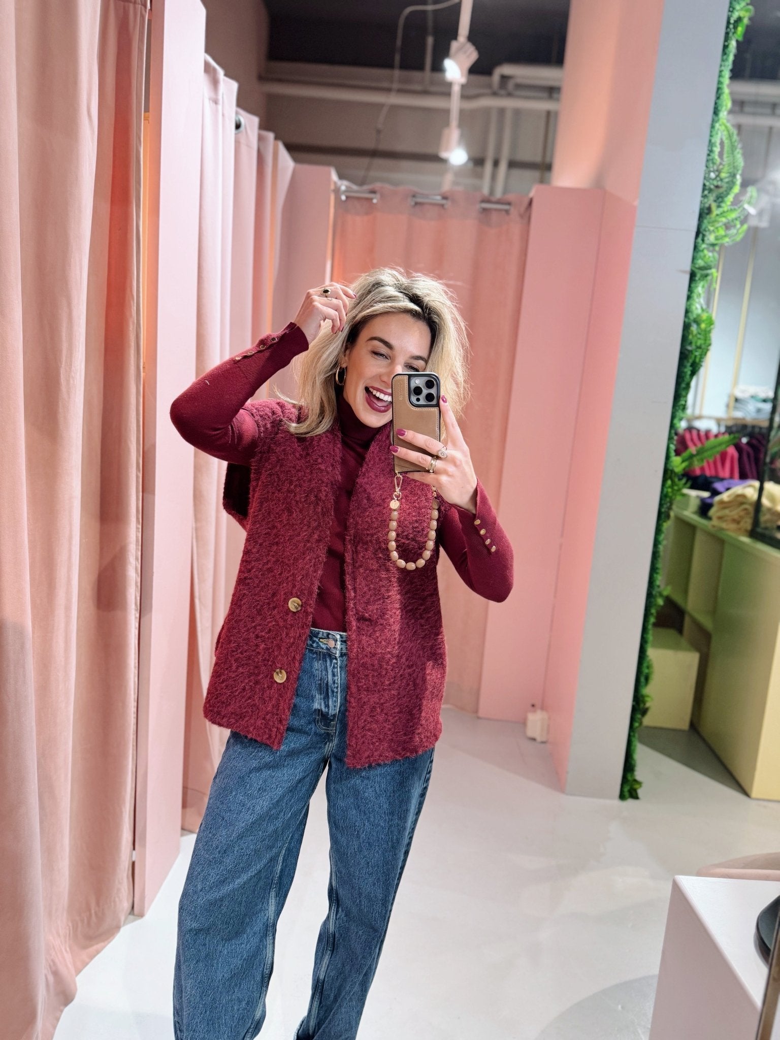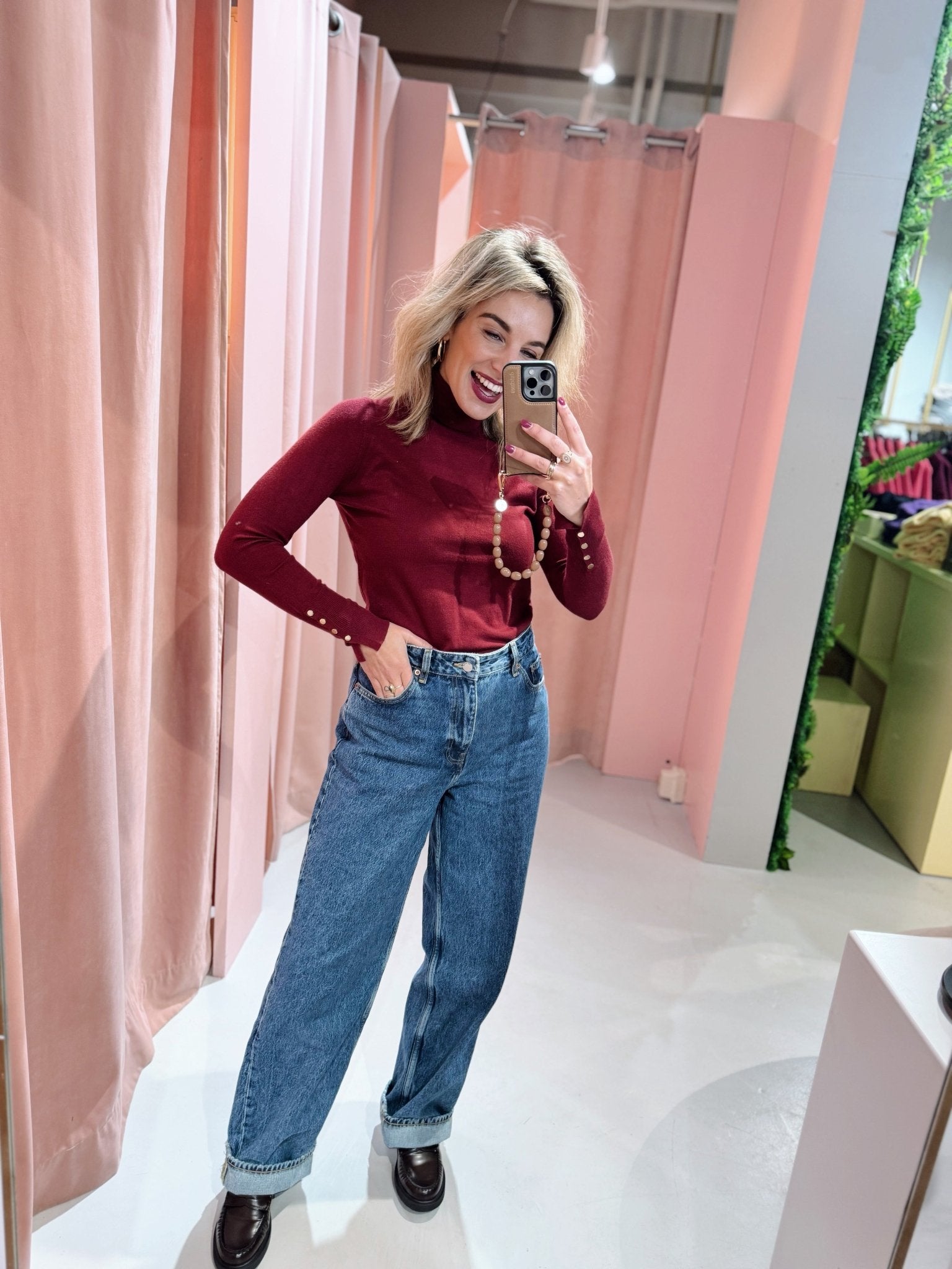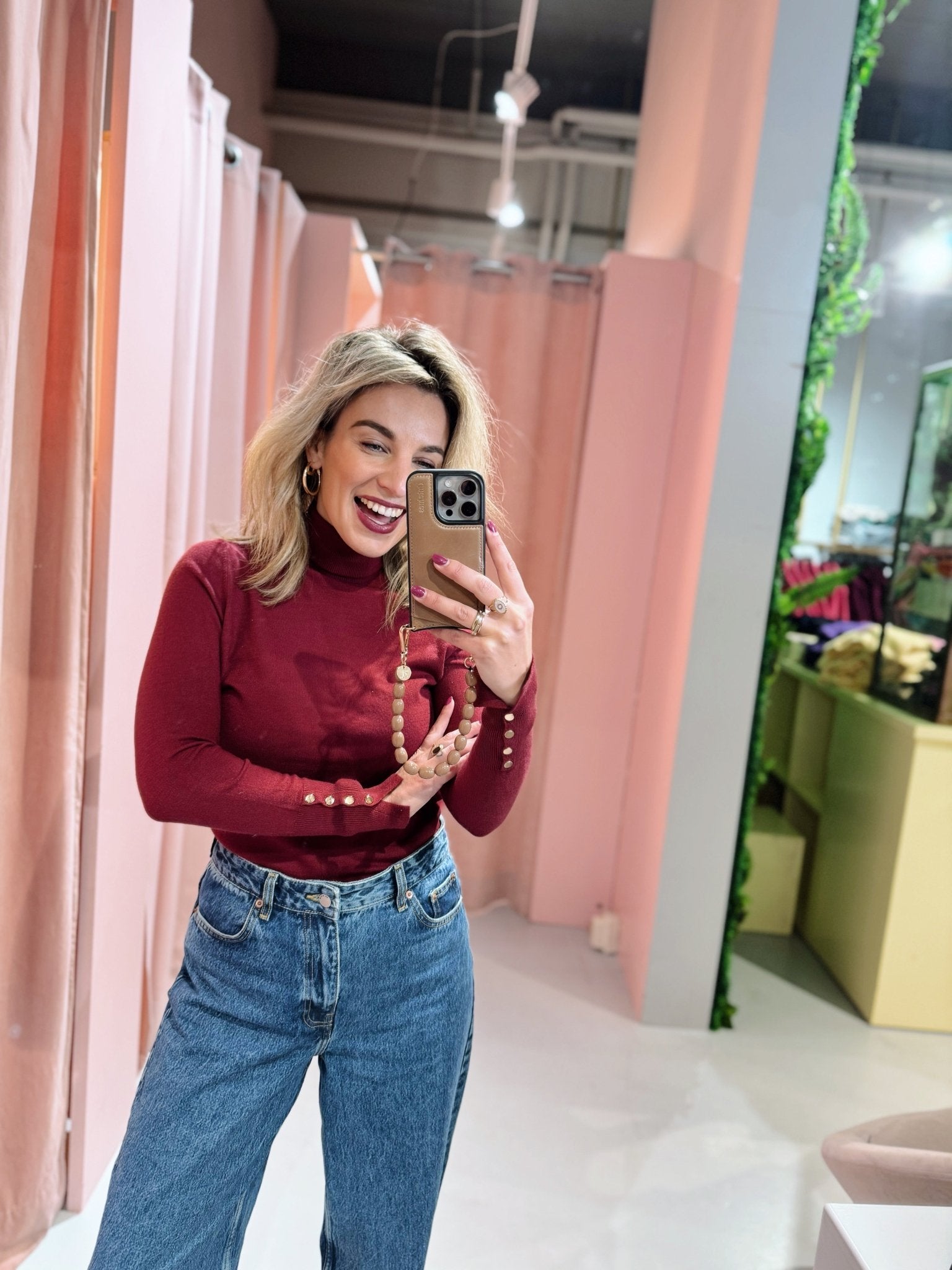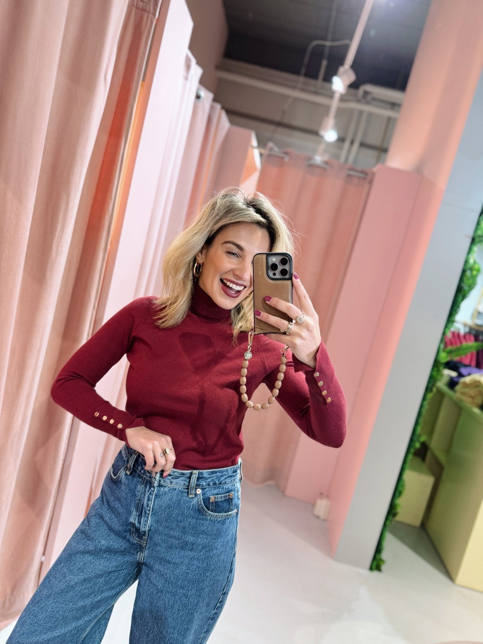 De Lune Col in bordeaux heeft een aangesloten fit en is gemaakt van een zachte viscosemix. De gouden knopen aan de mouwen geven het ontwerp een subtiele, stijlvolle touch. De trui valt mooi aangesloten en draagt comfortabel, ideaal voor zowel een casual als nette look.