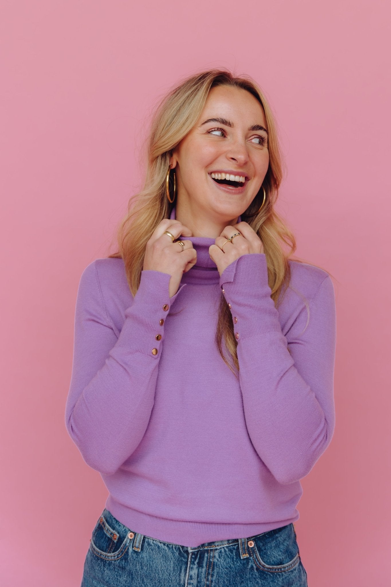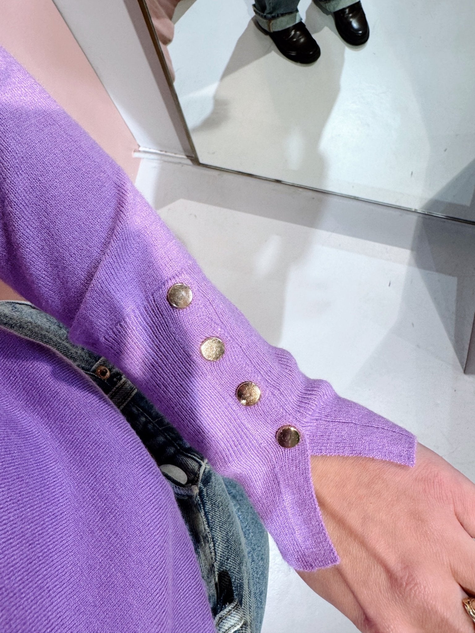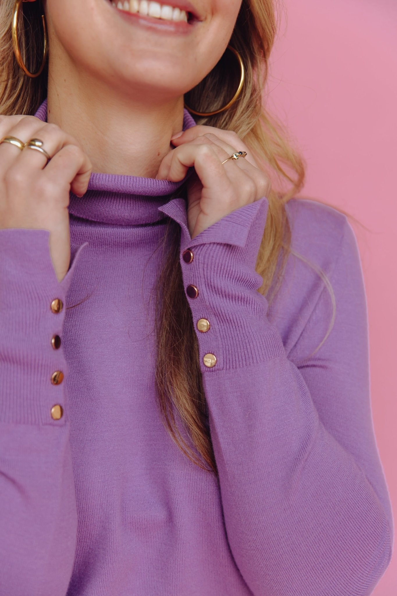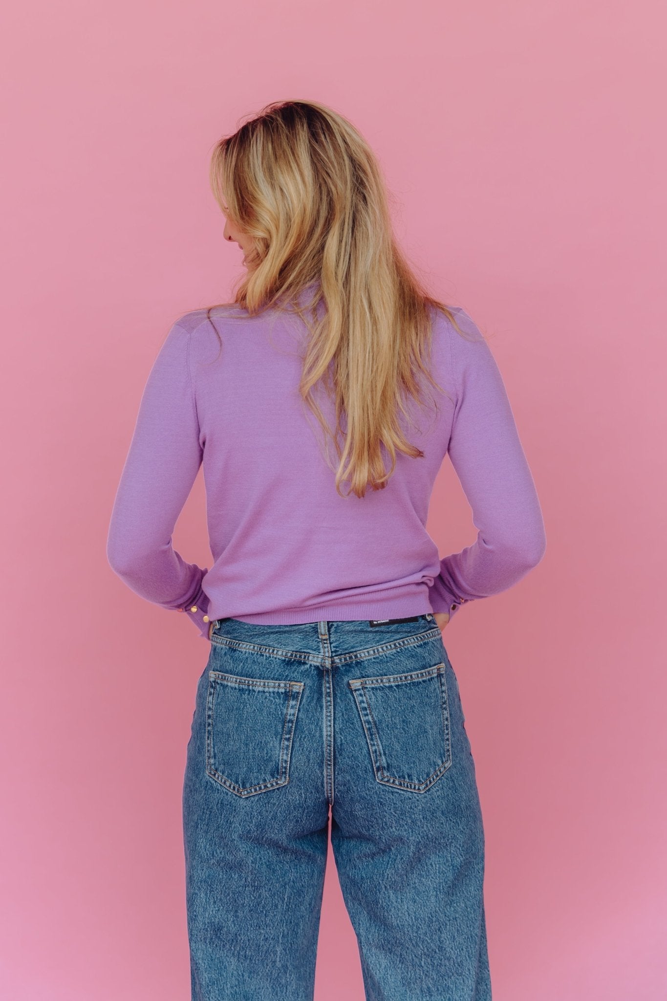 De Lune Col in paars heeft een aangesloten fit en is gemaakt van een zachte viscosemix. De gouden knopen aan de mouwen geven het ontwerp een subtiele, stijlvolle touch. De trui valt mooi aangesloten en draagt comfortabel, ideaal voor zowel een casual als nette look.