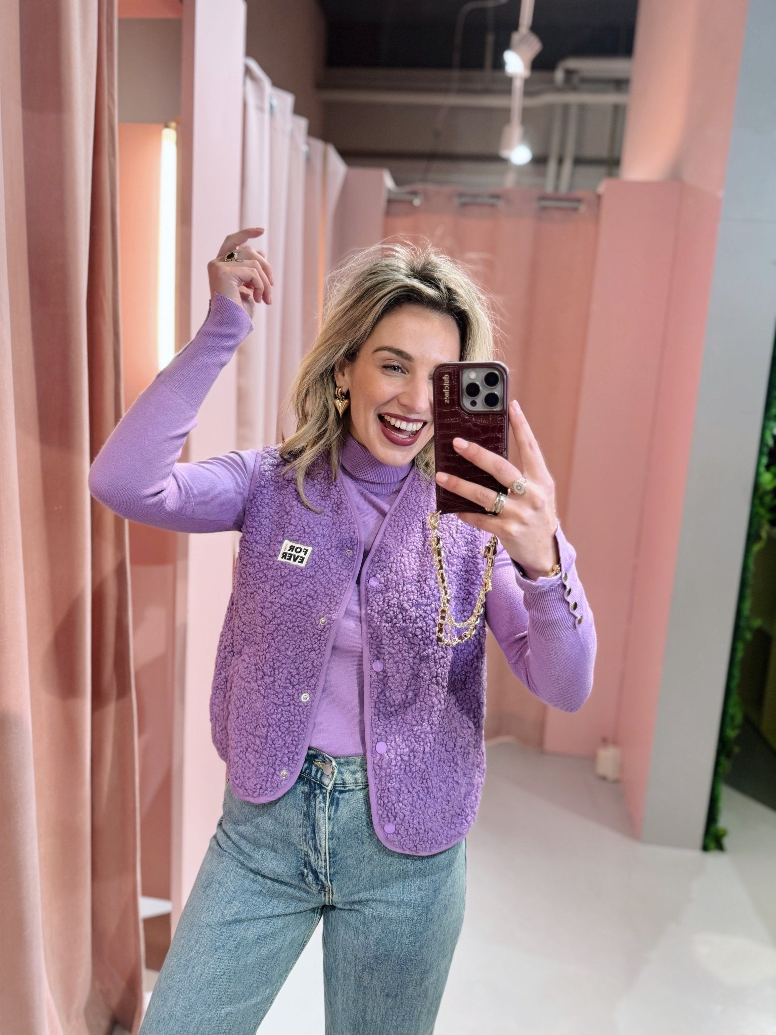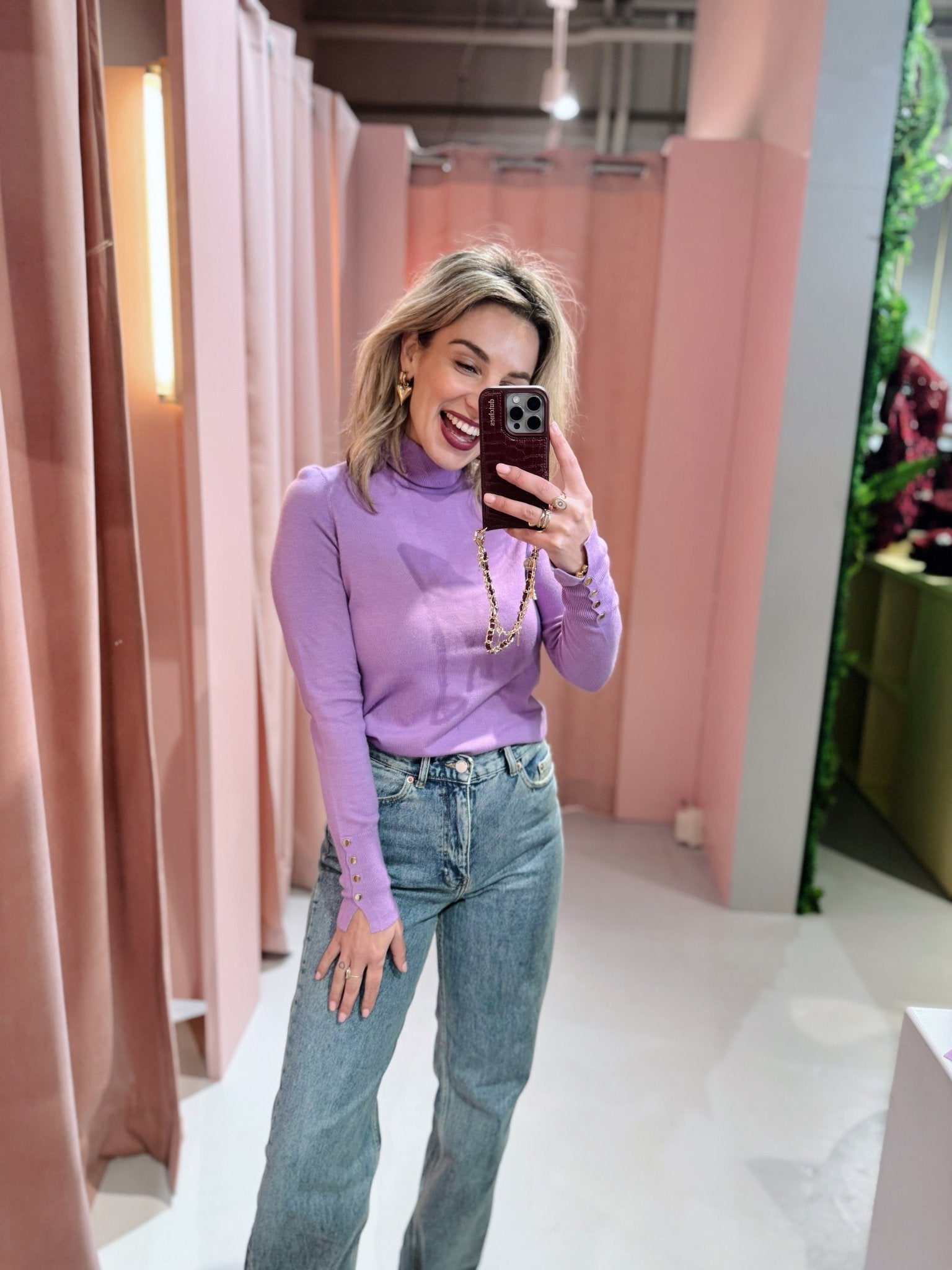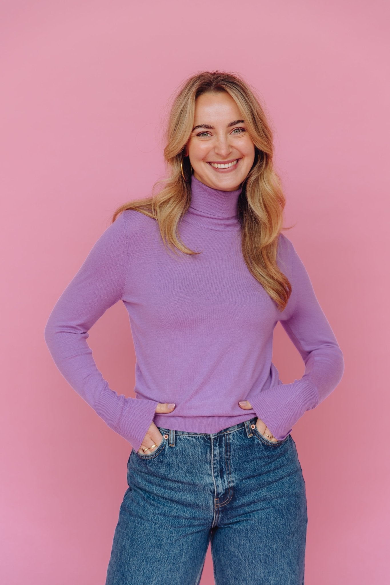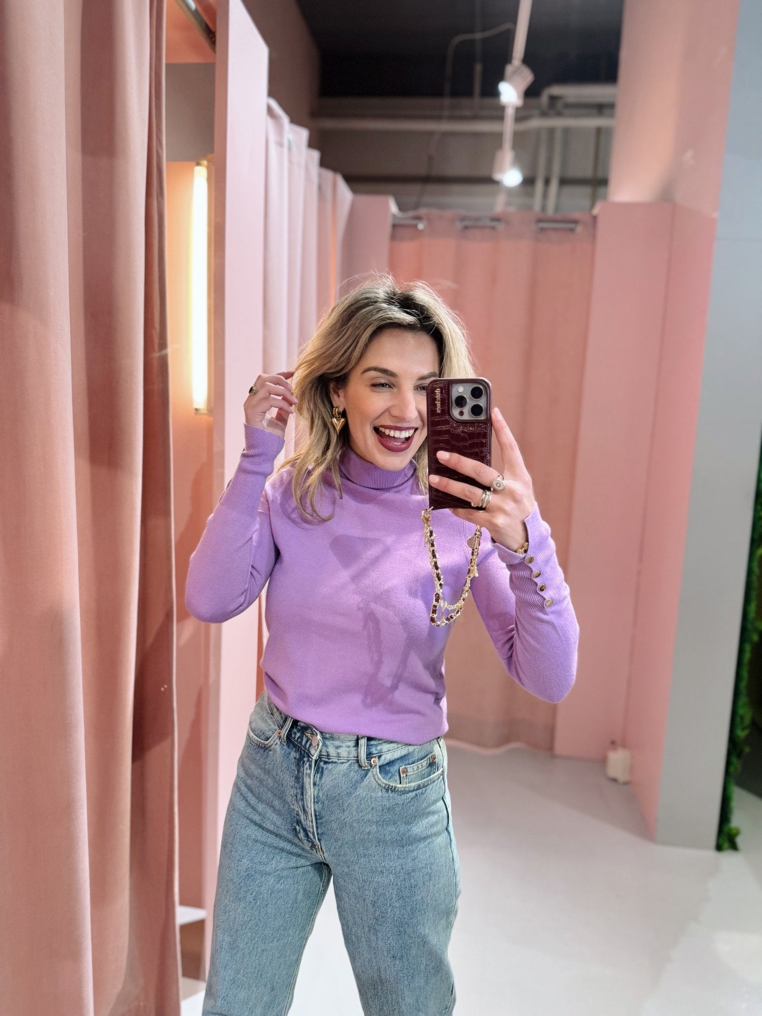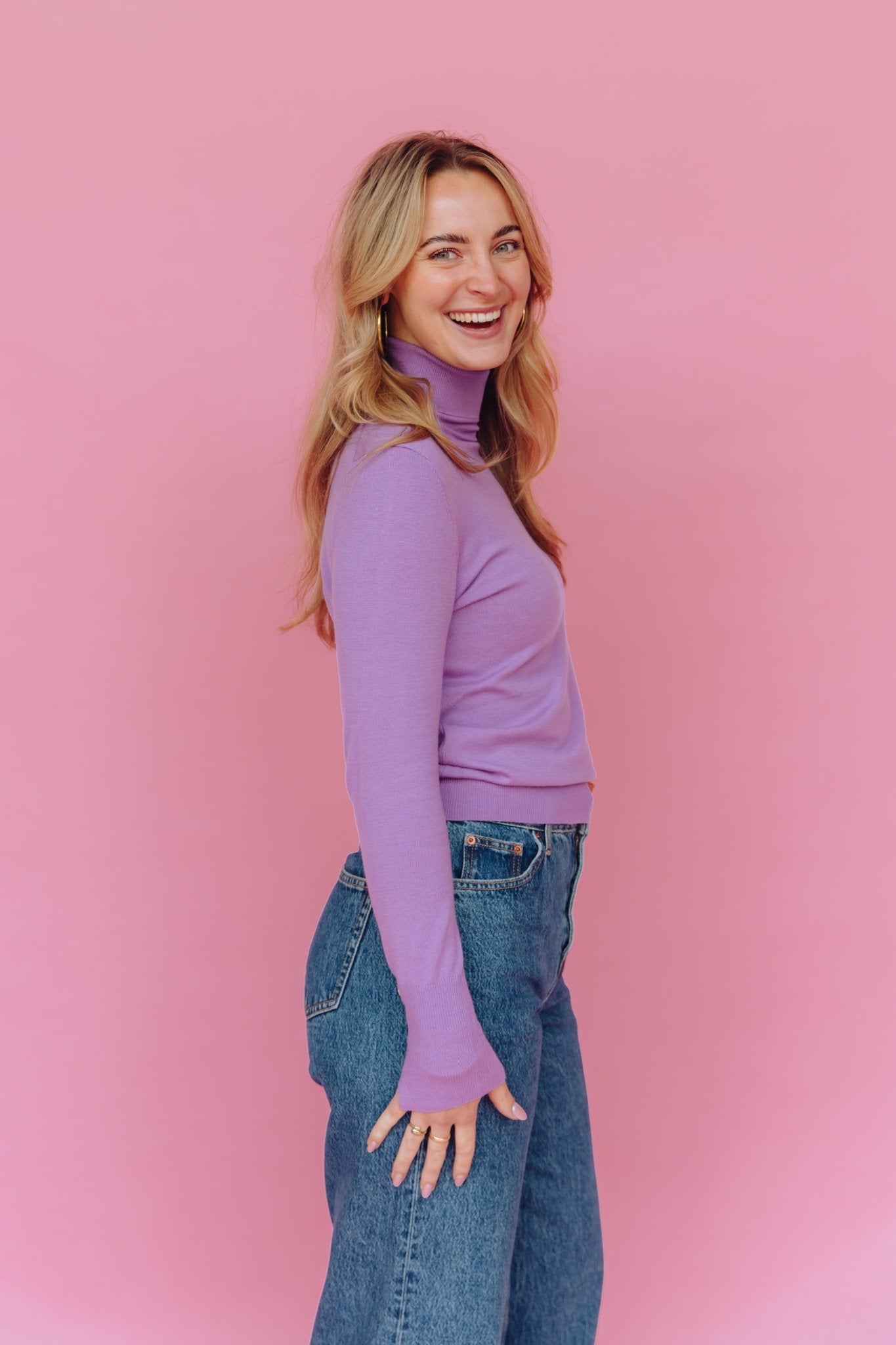 De Lune Col in paars heeft een aangesloten fit en is gemaakt van een zachte viscosemix. De gouden knopen aan de mouwen geven het ontwerp een subtiele, stijlvolle touch. De trui valt mooi aangesloten en draagt comfortabel, ideaal voor zowel een casual als nette look.