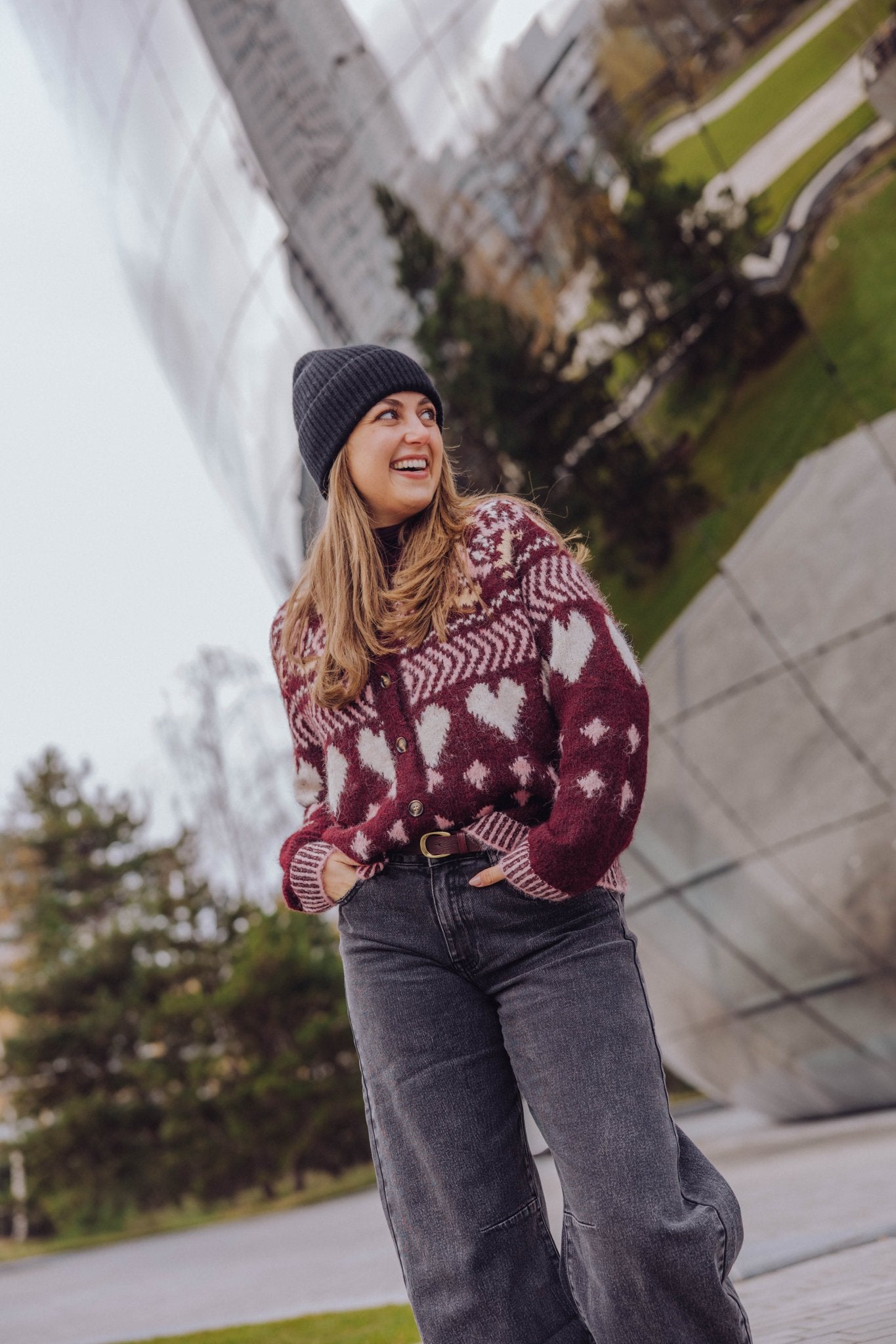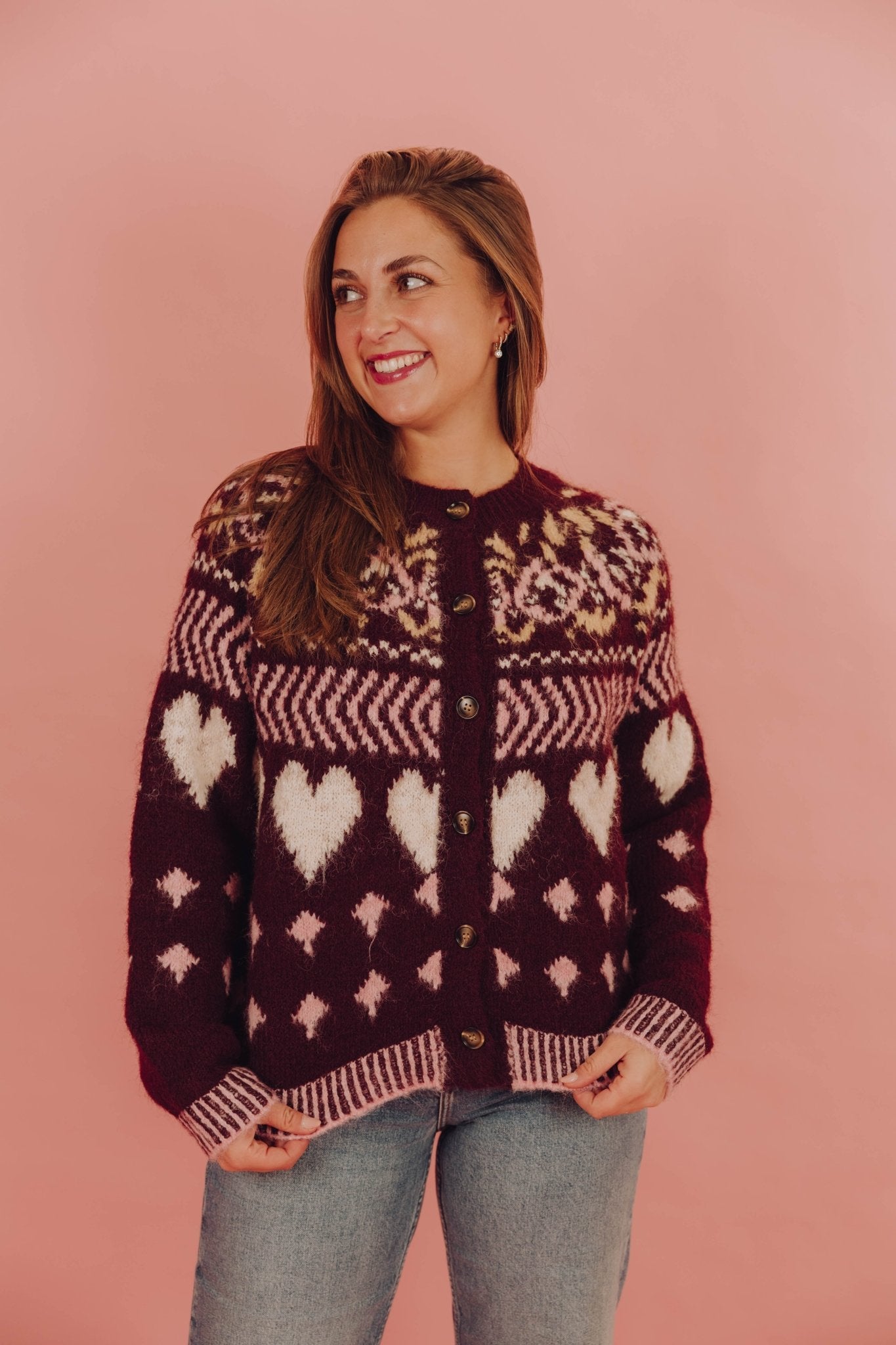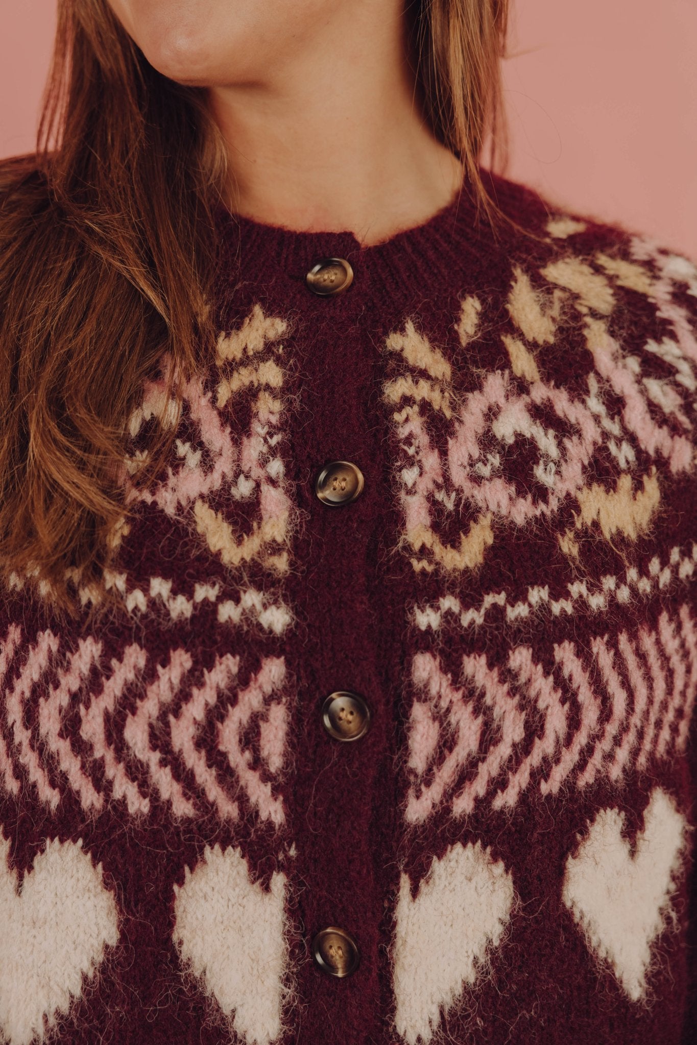 De Macy Cardigan in bordeaux is gemaakt van een gebreid materiaal, waardoor hij heerlijk warm is! Het vest heeft lange mouwen en een ronde halslijn en is voorzien van een vrolijk patroon. Het vest is gemakkelijk te sluiten door middel van de knoopsluiting aan de voorkant.