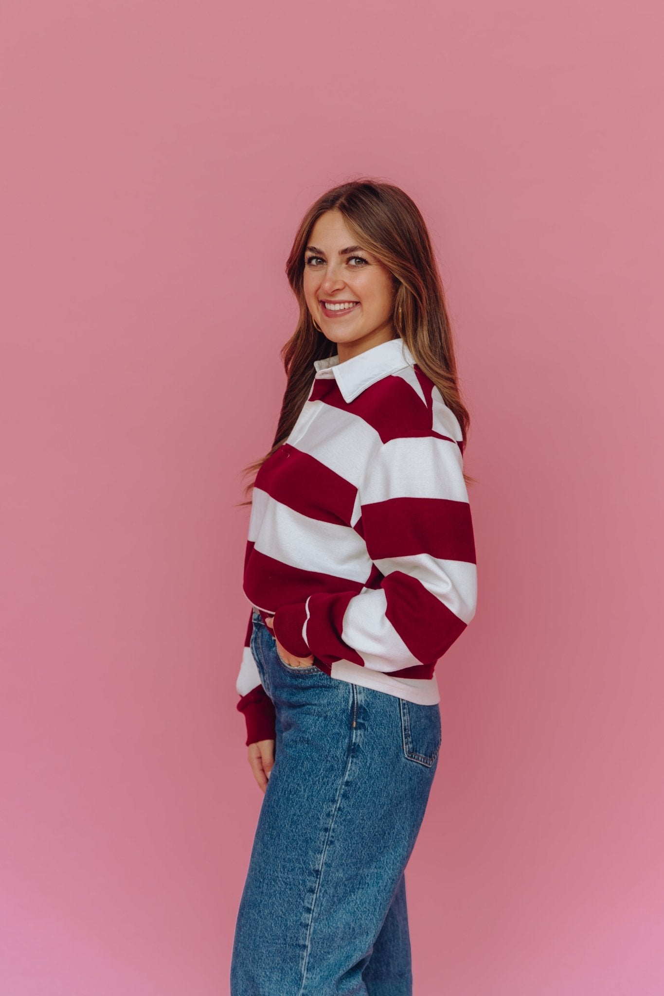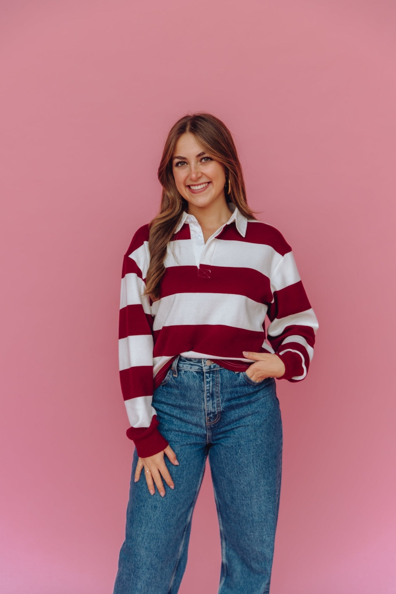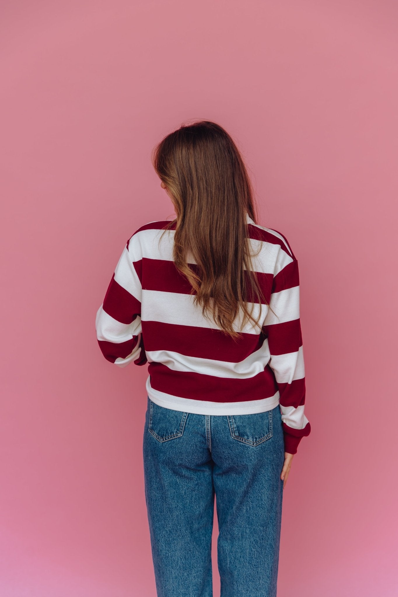 De Manon Polo in bordeaux/wit is gemaakt van een fijne katoenen stof en heeft een boxy model. Het shirt heeft lange mouwen en een kraagje met knoopjes. De polo is voorzien van een bordeaux met wit streep patroon. Deze polo is perfect voor een kleurrijke touch in je outfit!