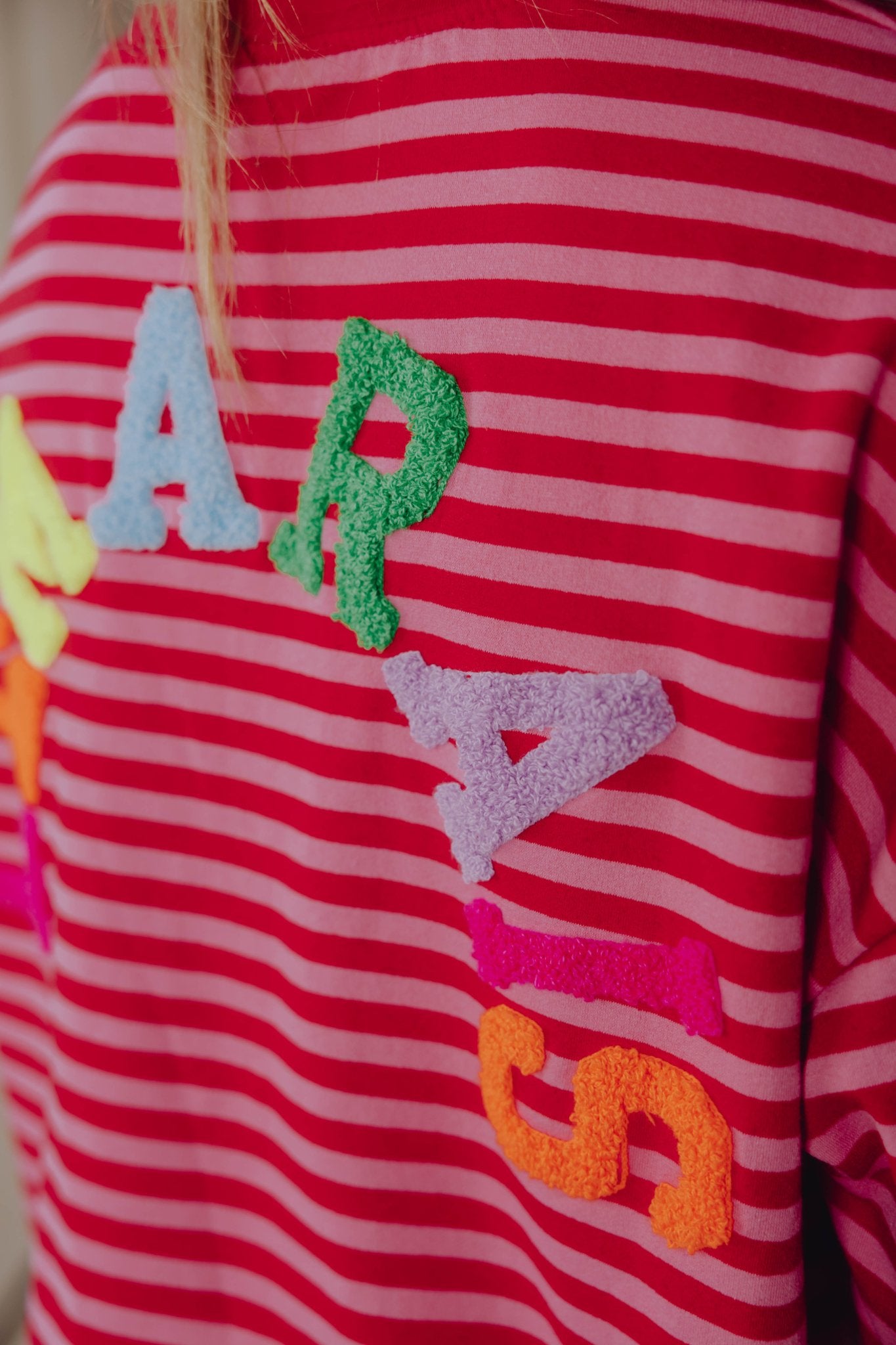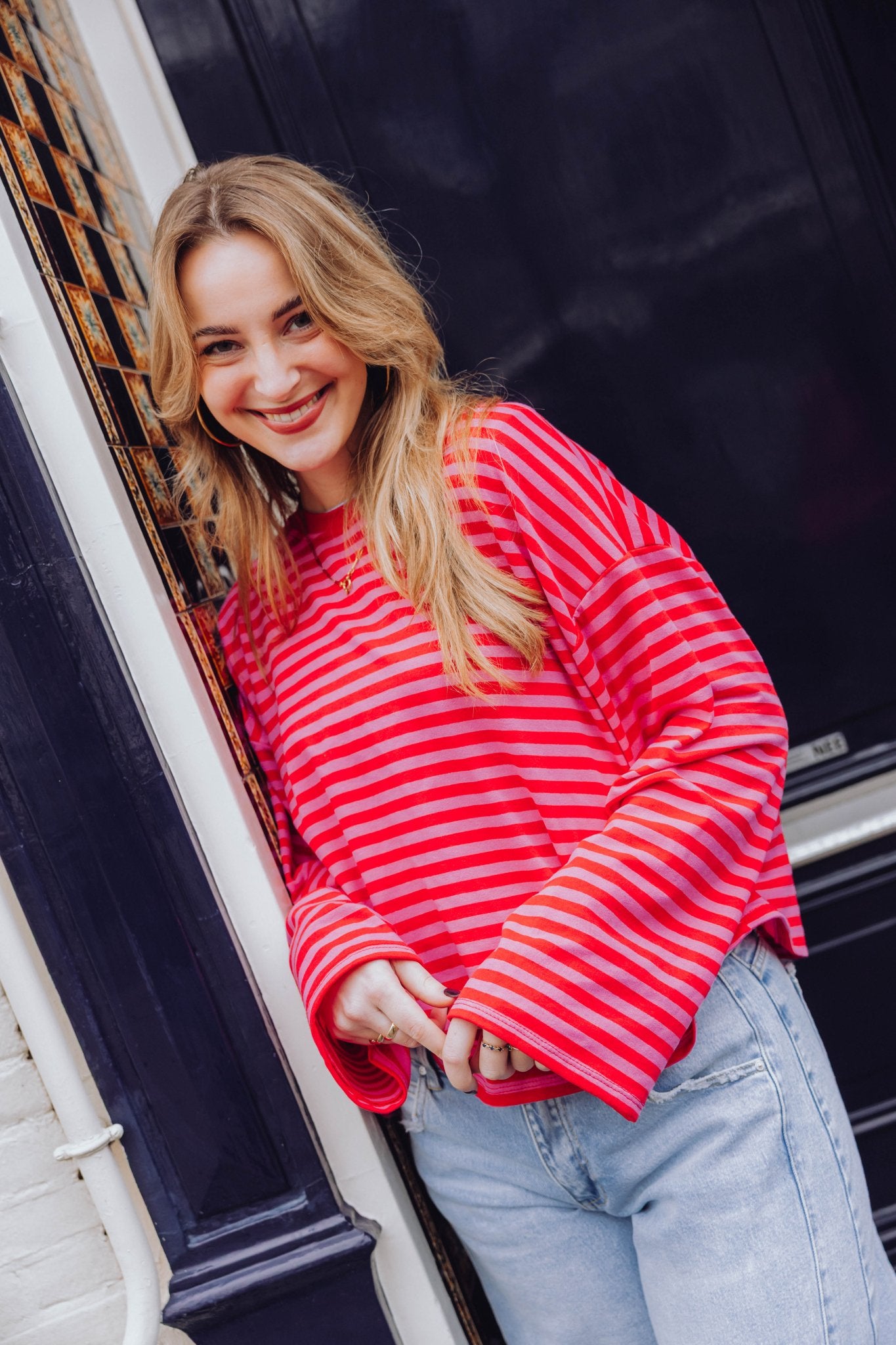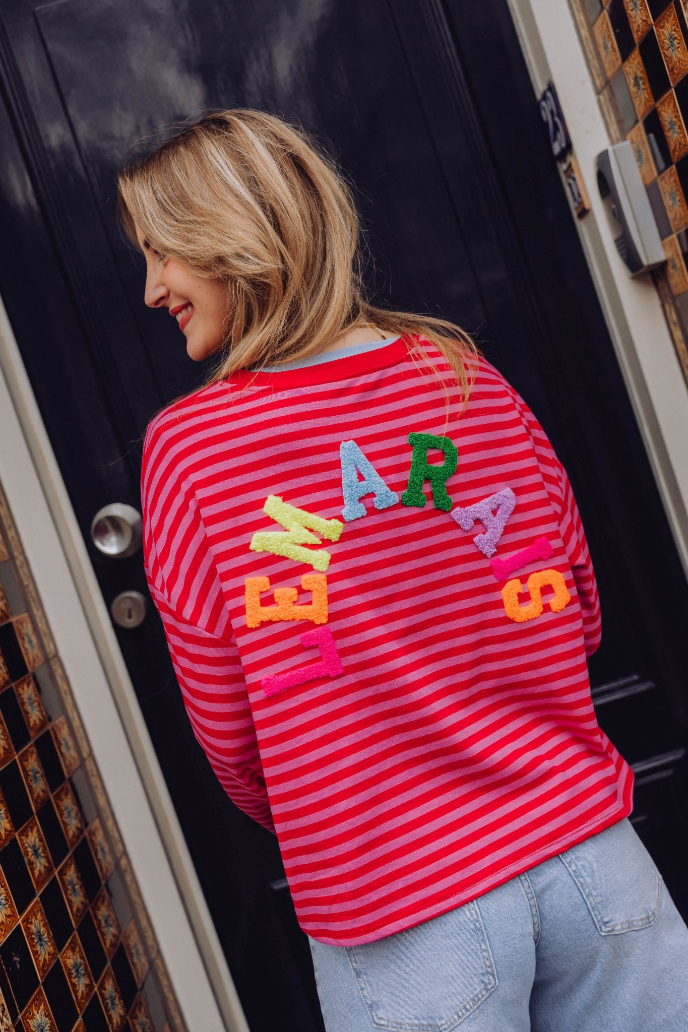 De Marais Longsleeve in rood met roze is een top met een iets wijder model. De top is gemaakt van een stretchy stof, heeft lange mouwen met een hoge, ronde halslijn en een streep patroon. Op de achterkant staat een kleurrijke backprint met de tekst " Le Marais". Deze lange mouwen top is perfect om laagjes mee te creëren in het najaar.