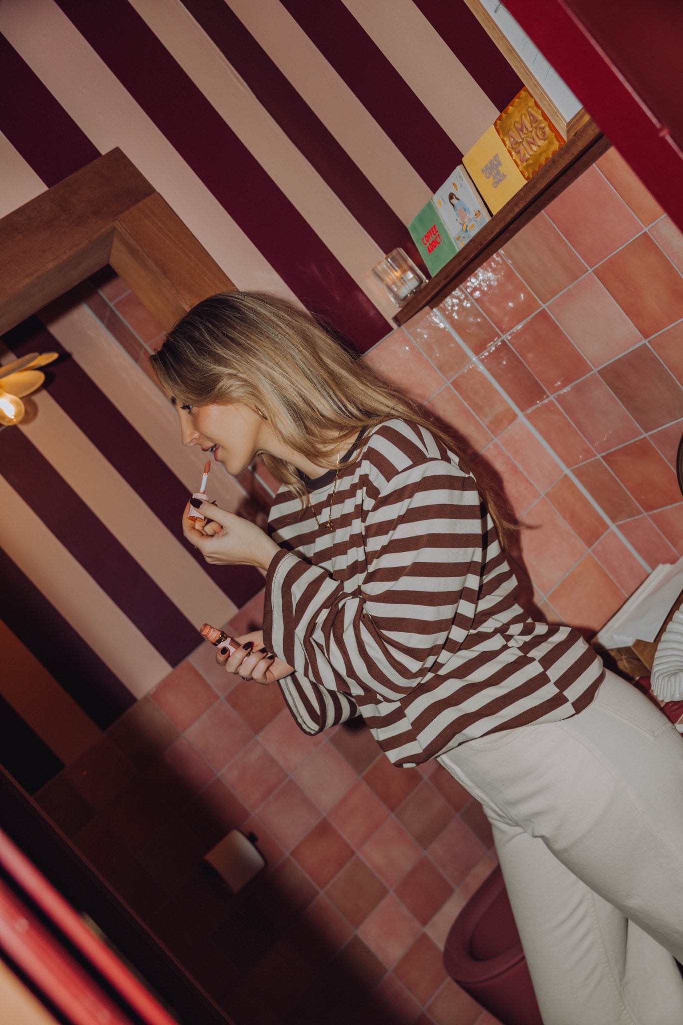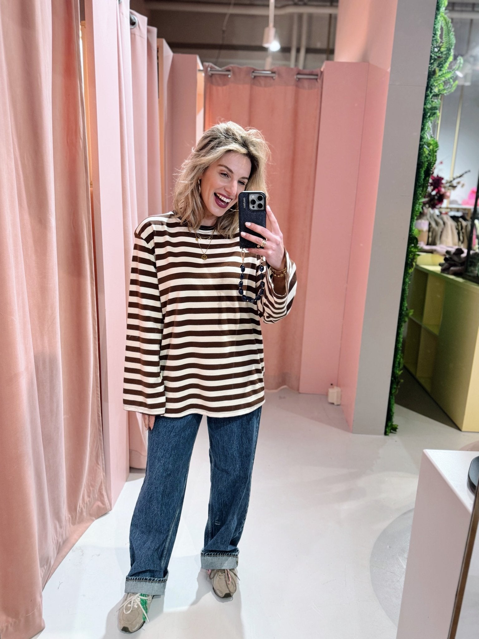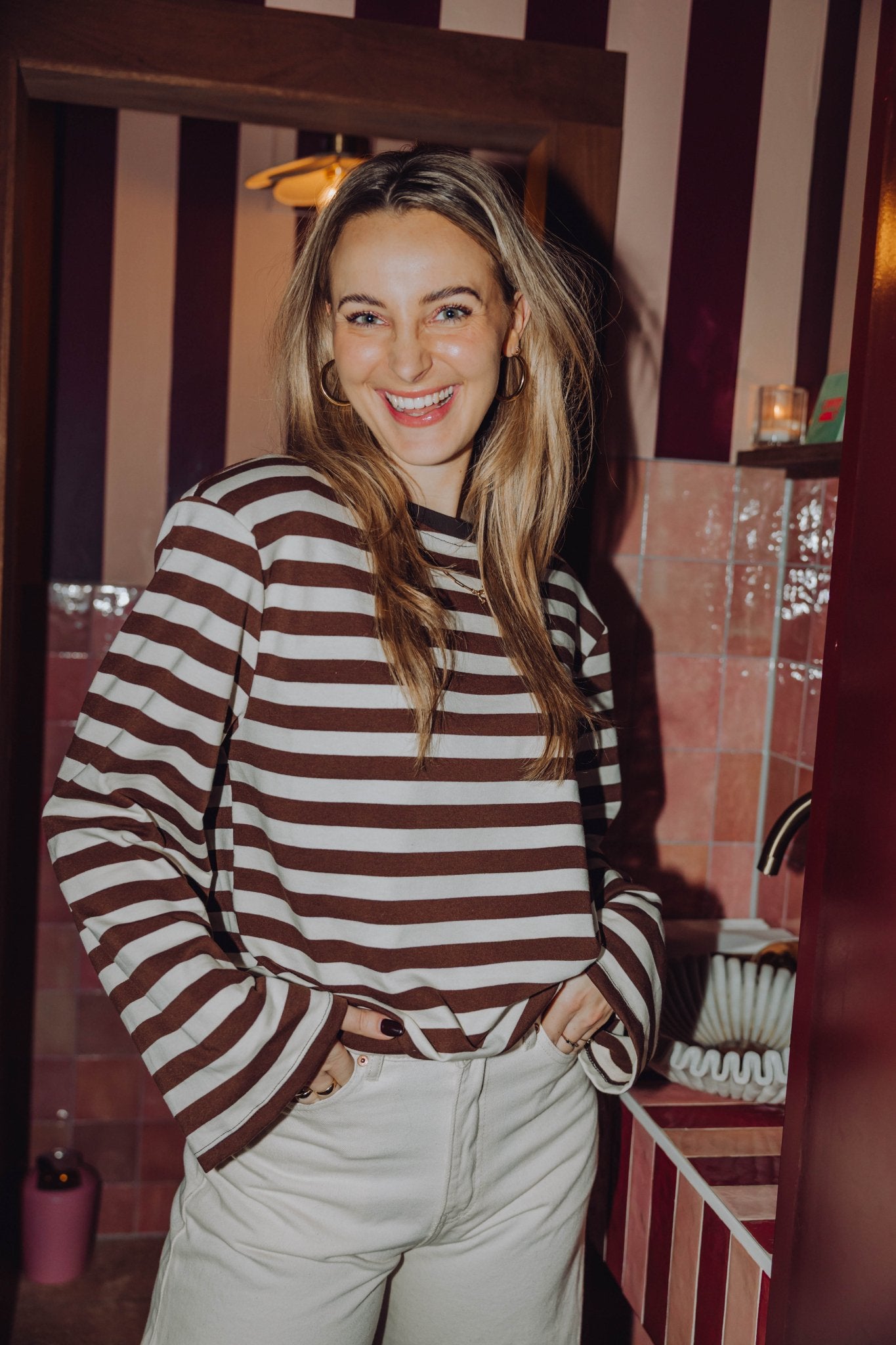 De Marjolein Longsleeve in off white met bruin is een top met een oversized model. De top is gemaakt van een stretchy stof, heeft lange mouwen met schoudervulling, een ronde halslijn en een streep patroon. Deze lange mouwen top is perfect om laagjes mee te creëren in het najaar.