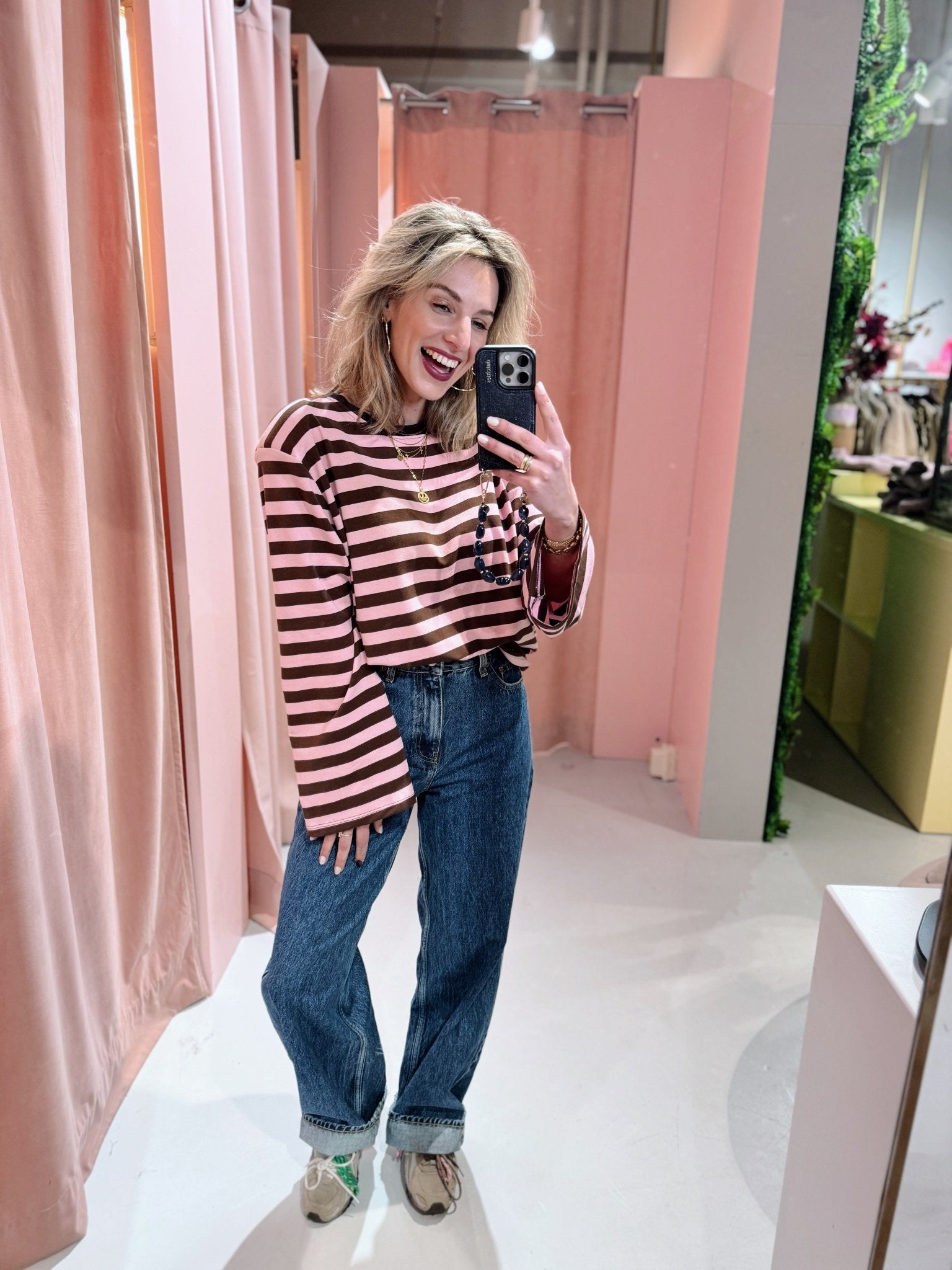 De Marjolein Longsleeve in roze met bruin is een top met een oversized model. De top is gemaakt van een stretchy stof, heeft lange mouwen met schoudervulling, een ronde halslijn en een streep patroon. Deze lange mouwen top is perfect om laagjes mee te creëren in het najaar.