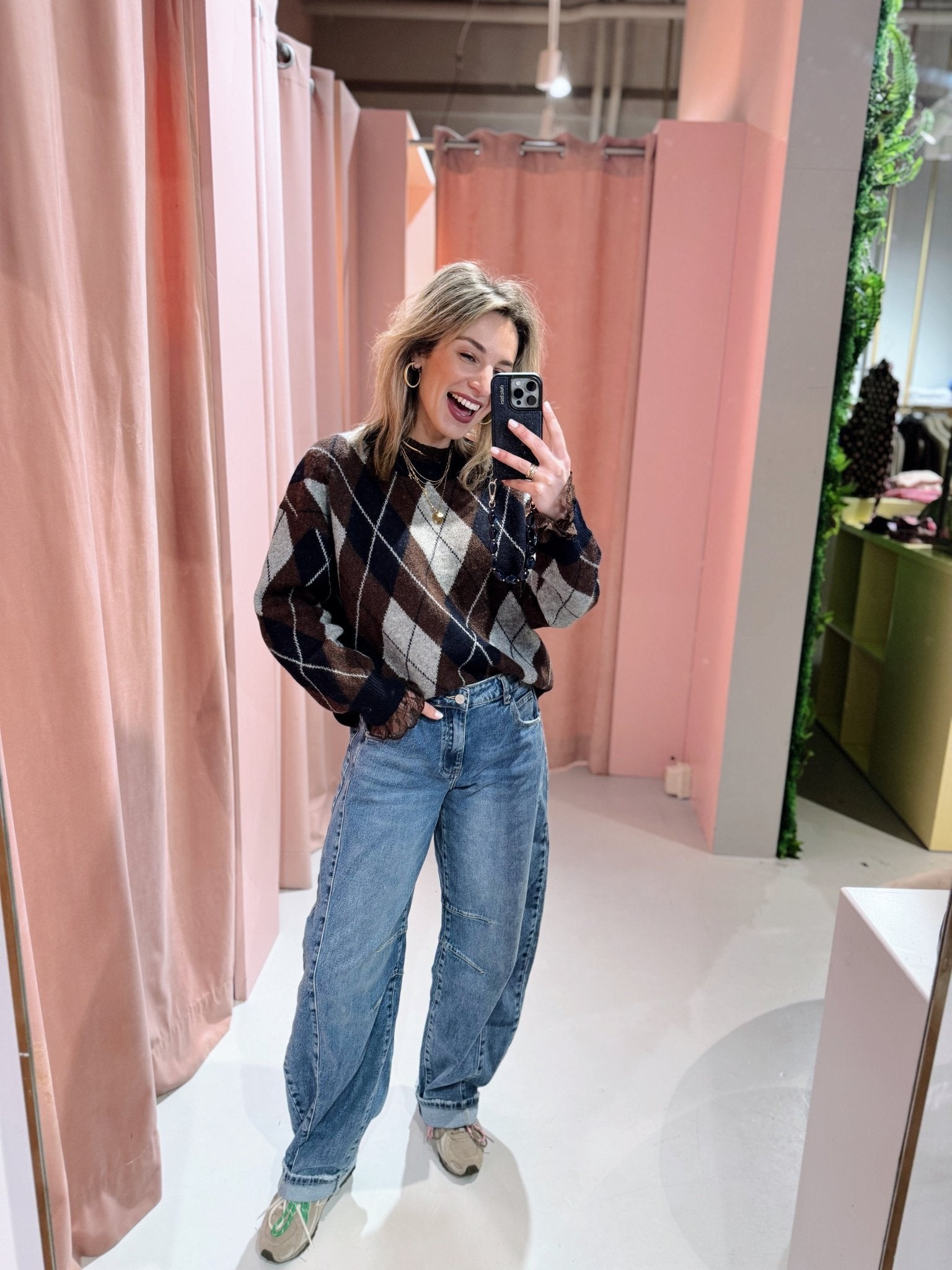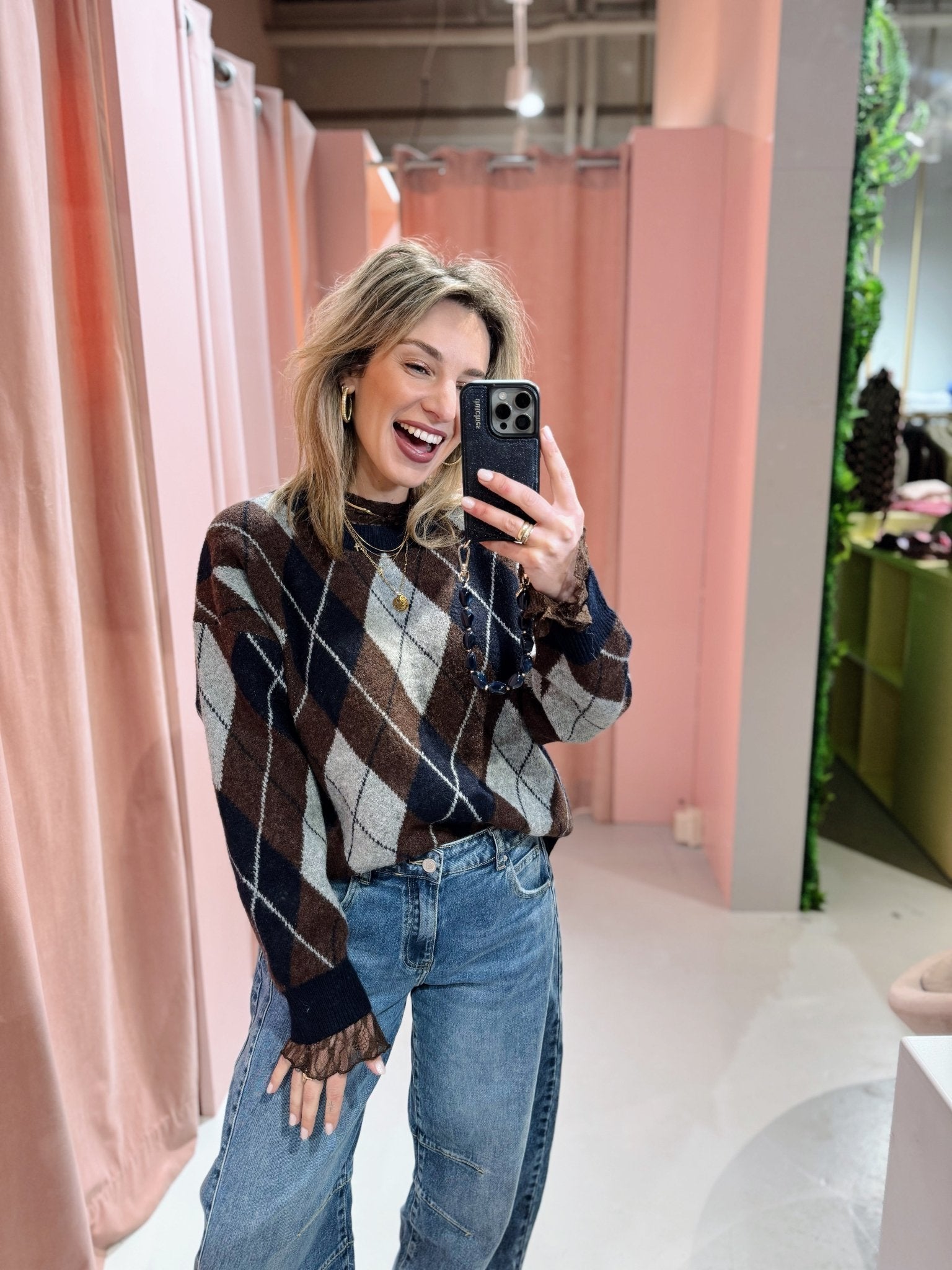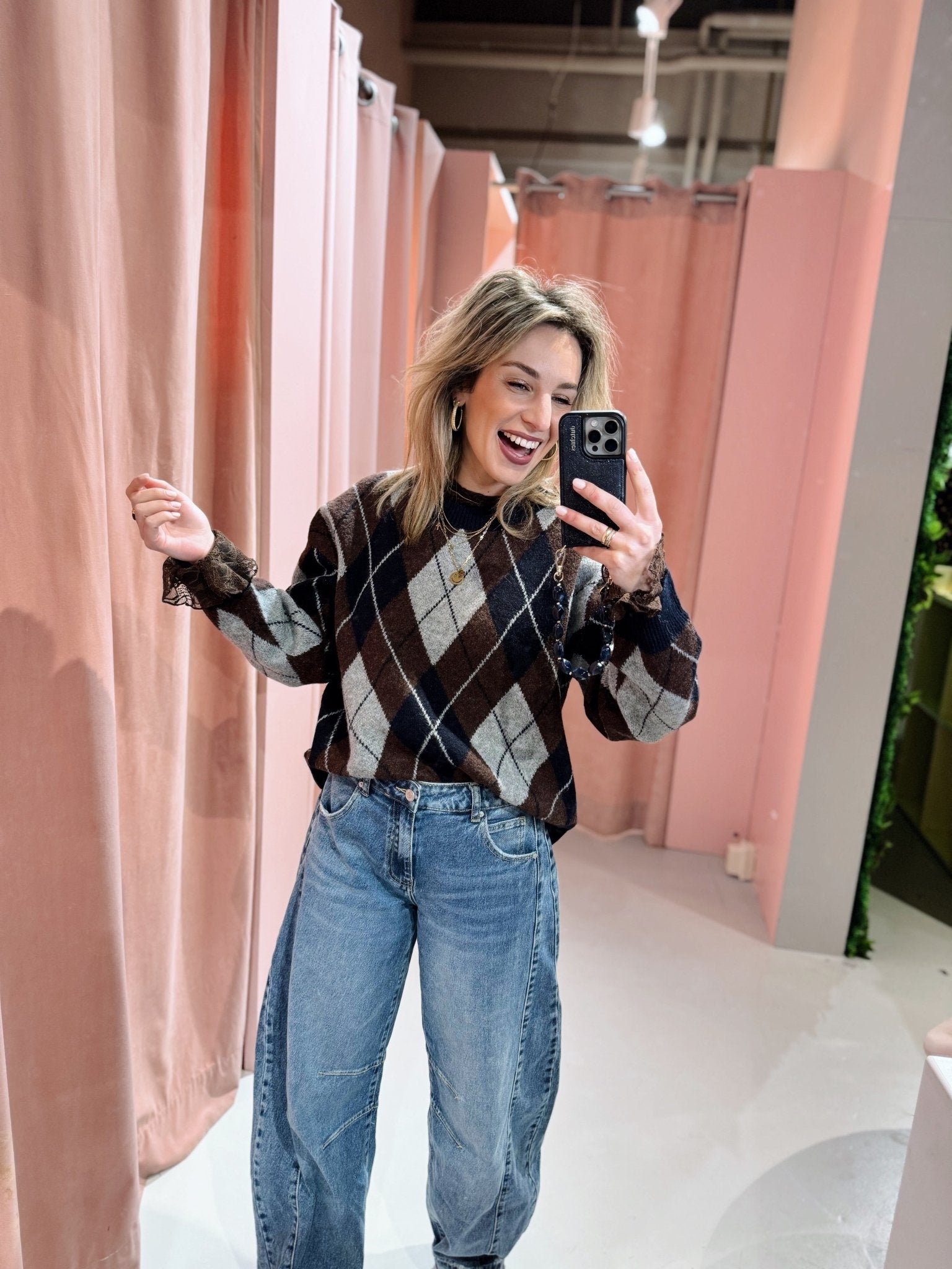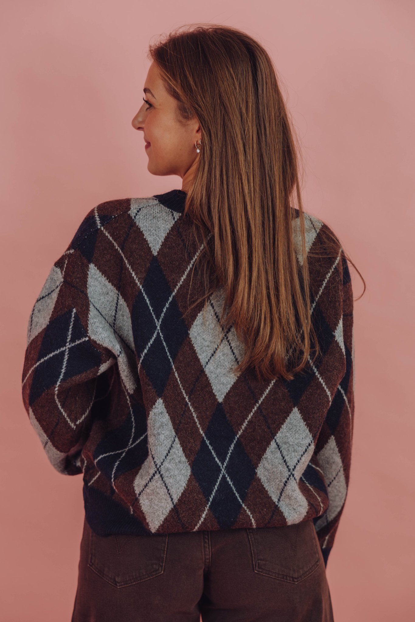 De Marlous Sweater in navy is gemaakt van een gebreid materiaal, waardoor hij heerlijk warm is! De trui heeft lange mouwen en een ronde halslijn en is voorzien van een ruitjes patroon waarin de kleuren combi bruin met donker blauw perfect tot zijn recht komt.