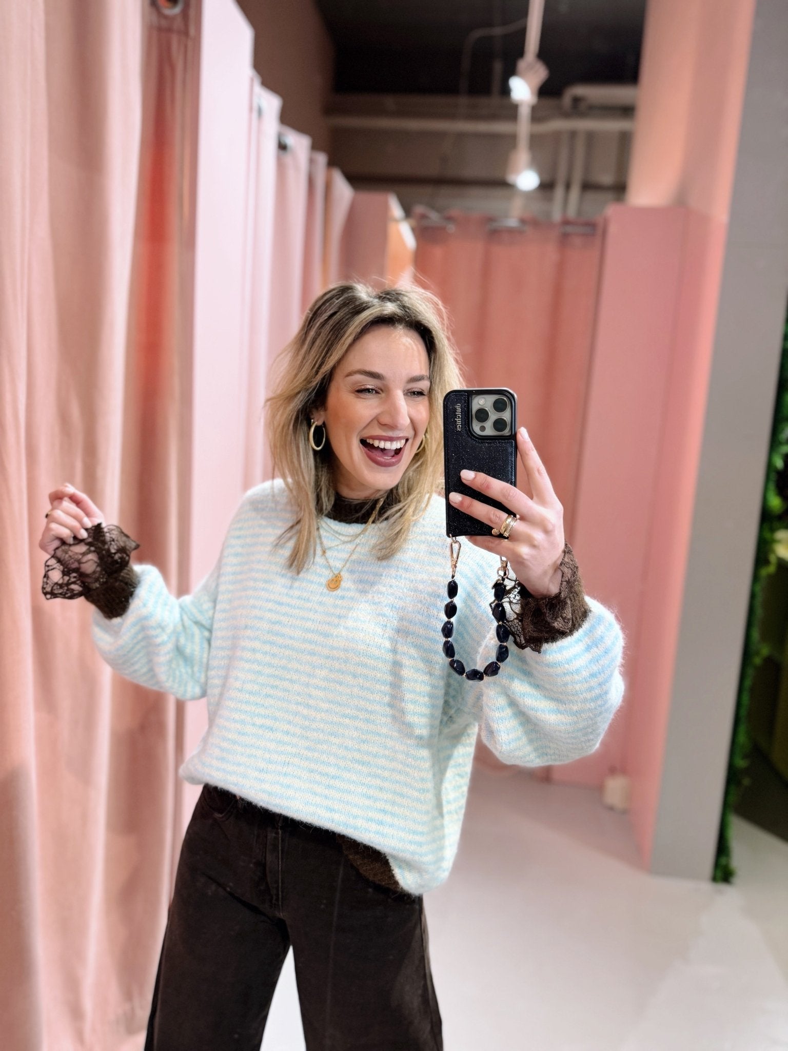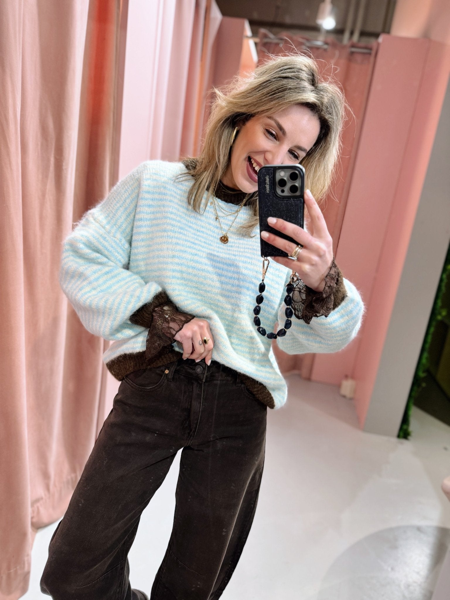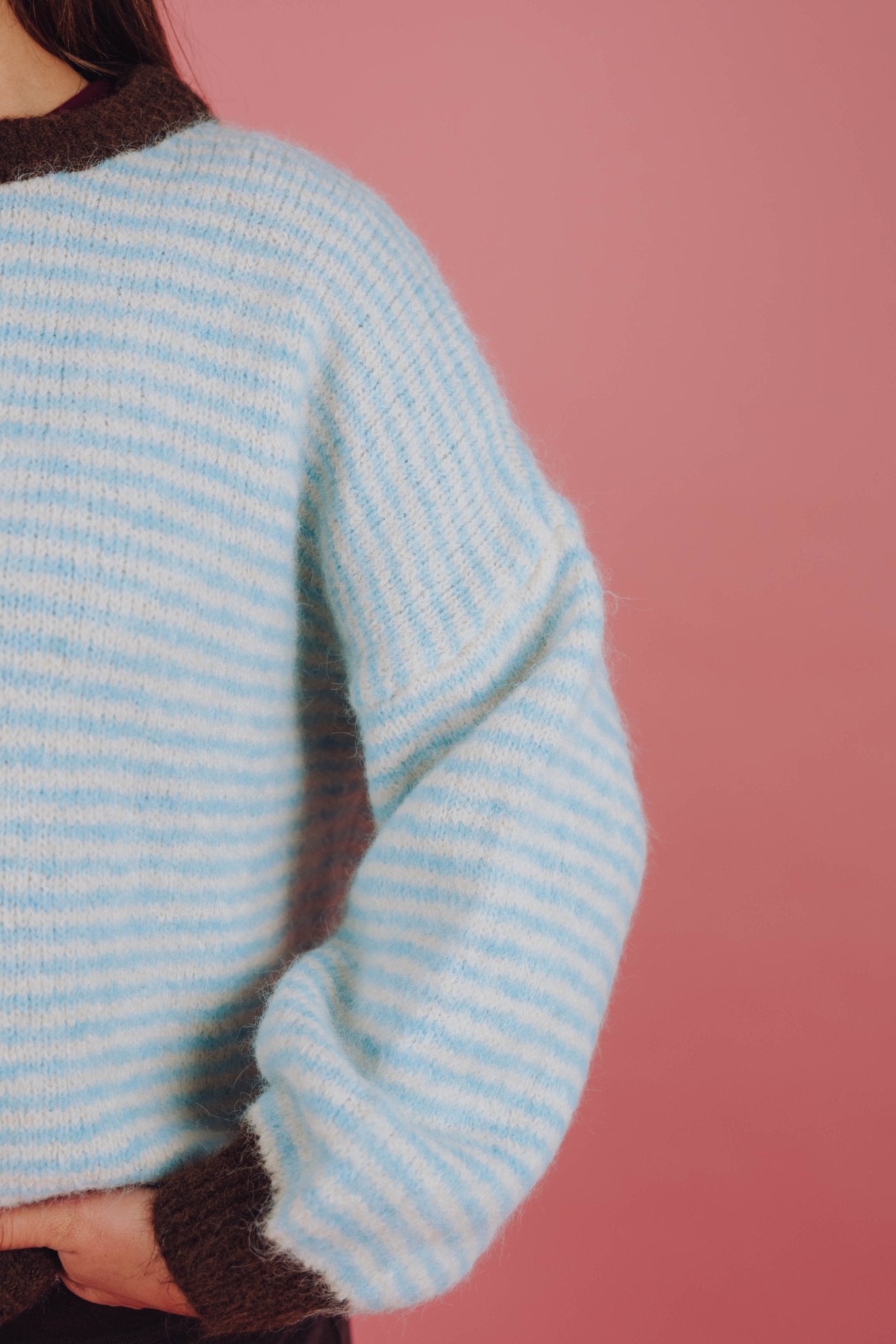 De Marnie Knit in lichtblauw is gemaakt van een gebreid materiaal, waardoor hij heerlijk warm is! De trui heeft een ronde halslijn en is voorzien van een streep patroon. Wat de trui extra leuk maakt, zijn de contrasterende boorden langs de mouwen, halslijn en de onderkant.