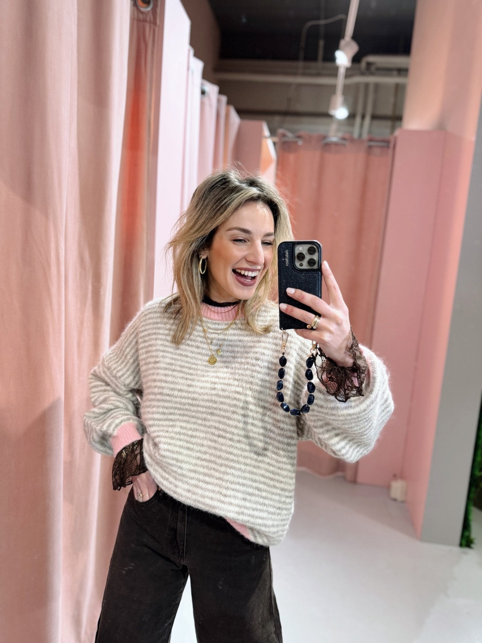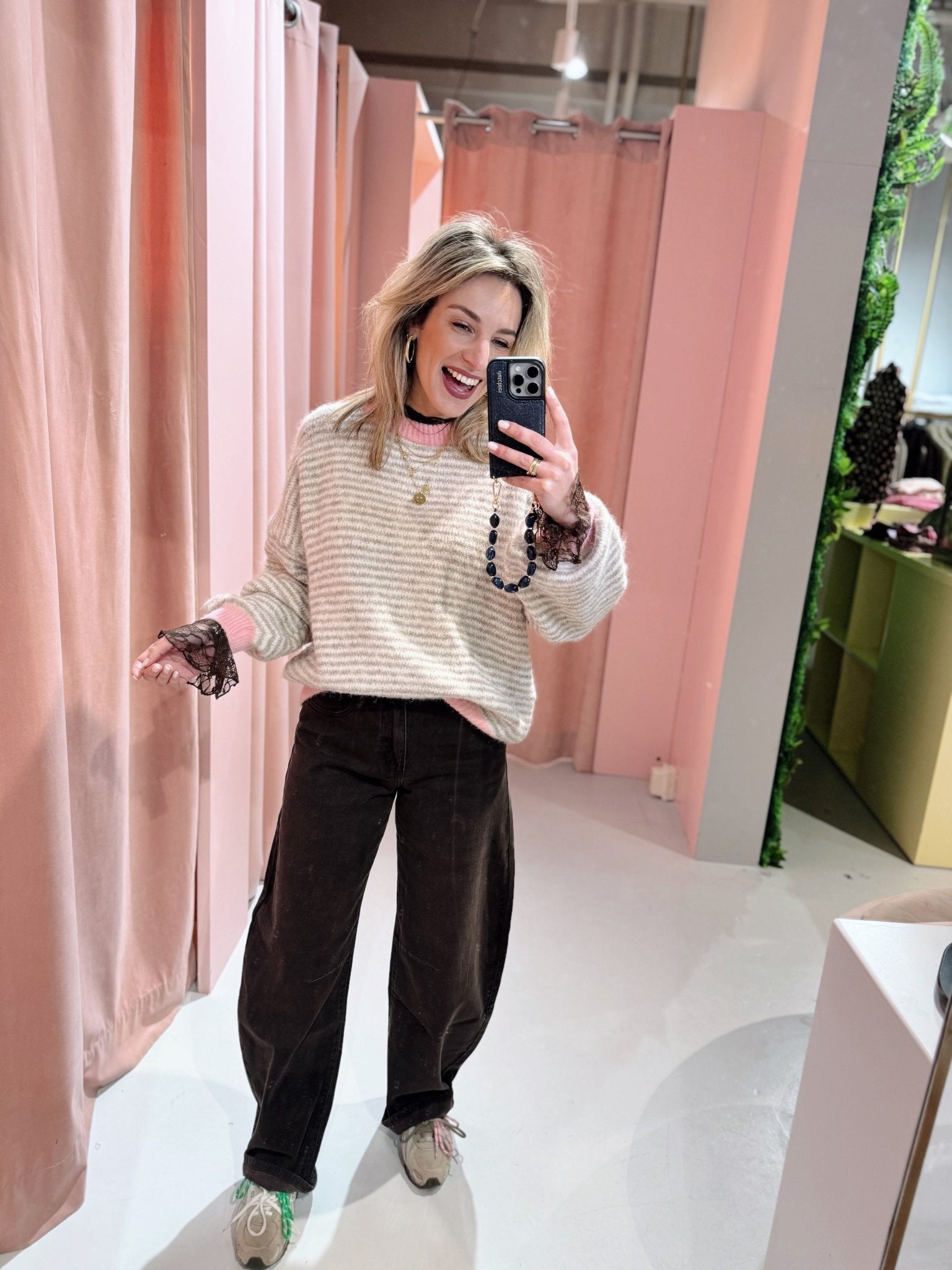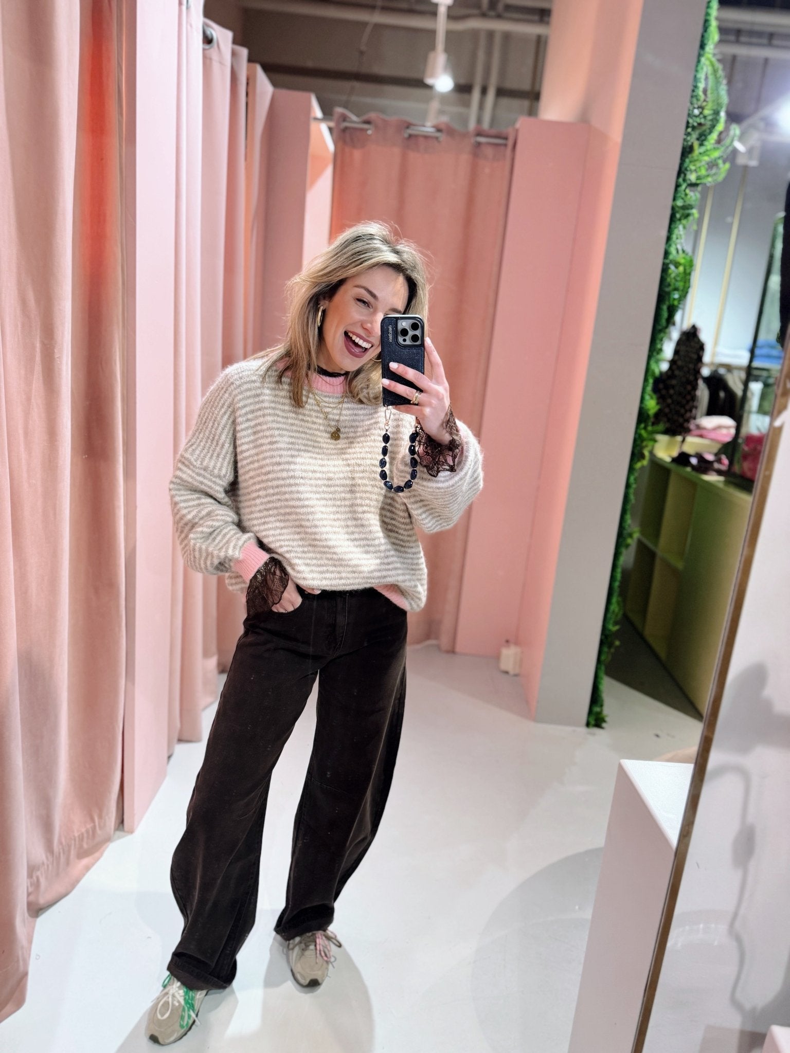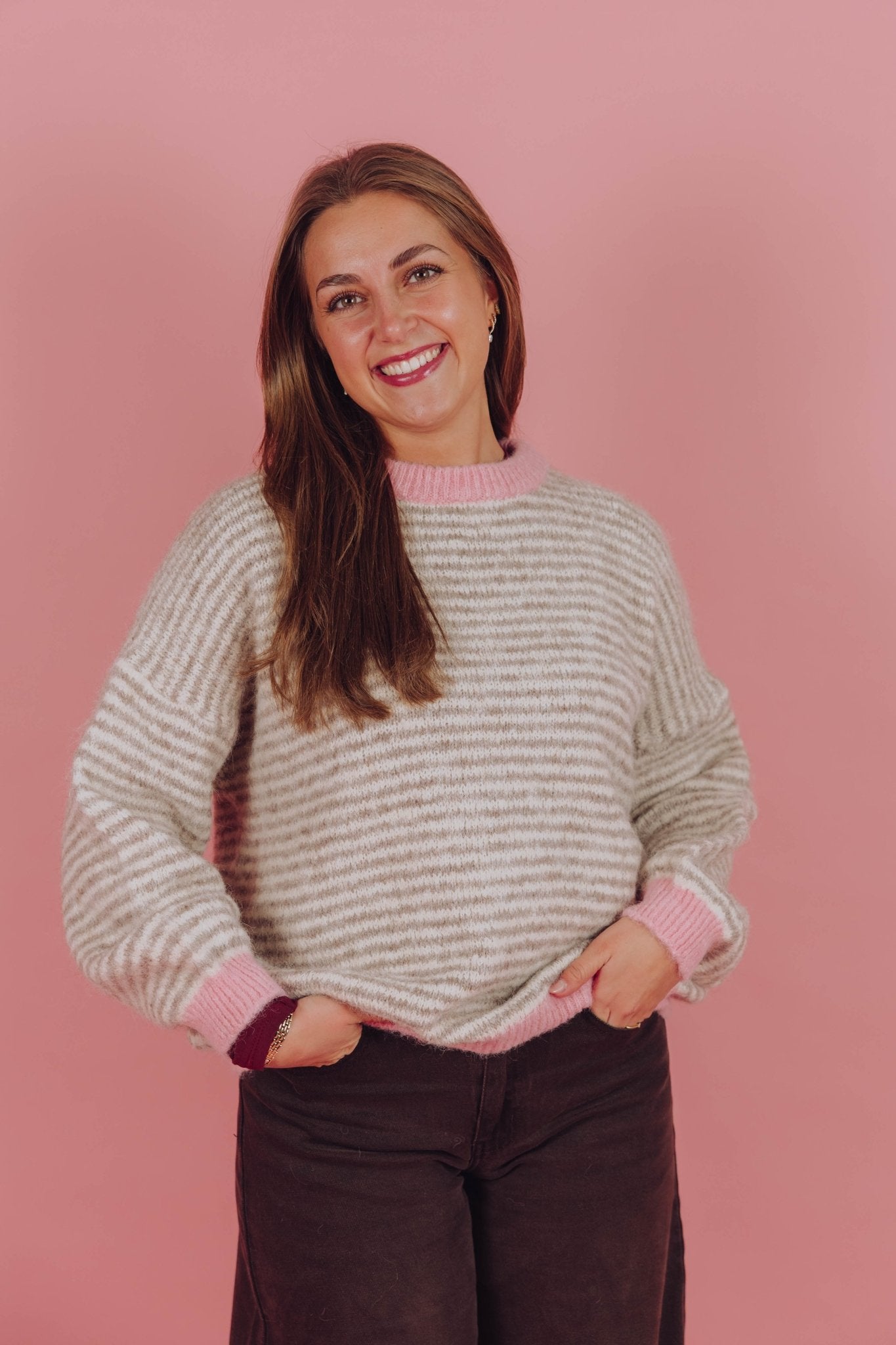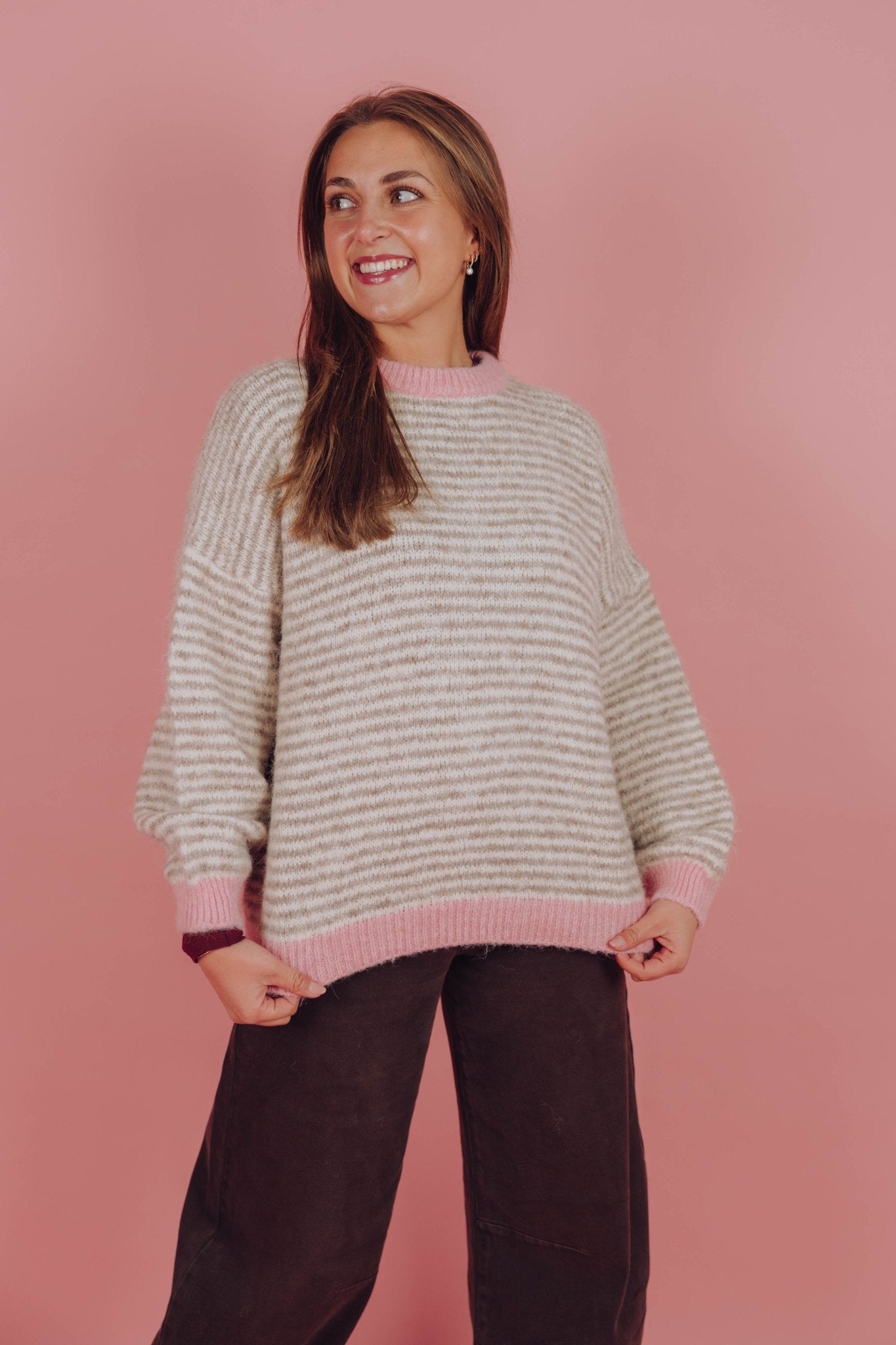 De Marnie Knit in taupe is gemaakt van een gebreid materiaal, waardoor hij heerlijk warm is! De trui heeft een ronde halslijn en is voorzien van een streep patroon. Wat de trui extra leuk maakt, zijn de contrasterende boorden langs de mouwen, halslijn en de onderkant.