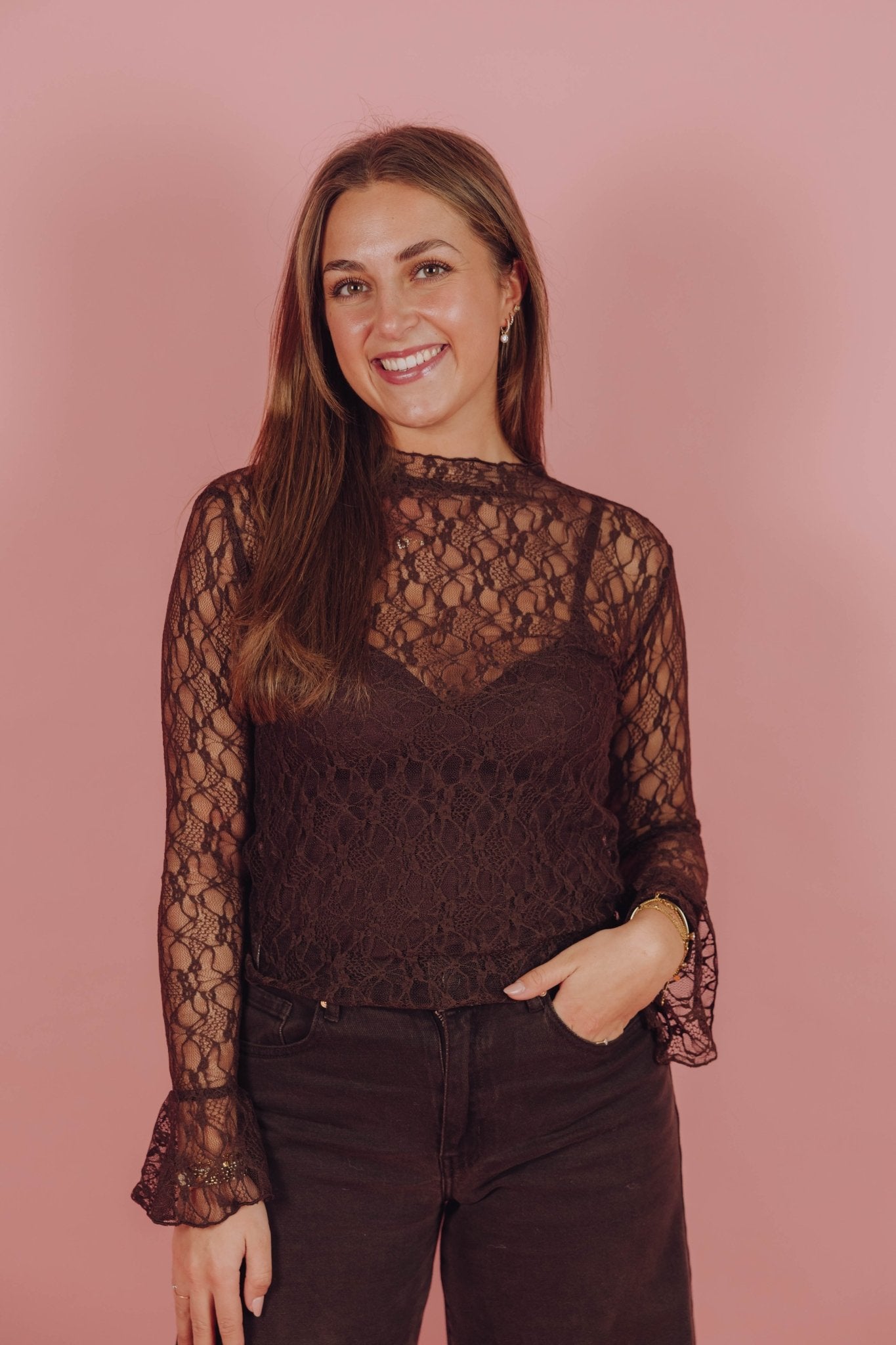 De May Lace Top in beige is een kanten top gemaakt van een kanten stof en heeft een ingewerkt bloemen patroon. De top heeft lange trompetmouwtjes en een hoge, rechte halslijn. Deze top is een echte musthave voor onder je favoriete sweater, T-shirtof blazer!